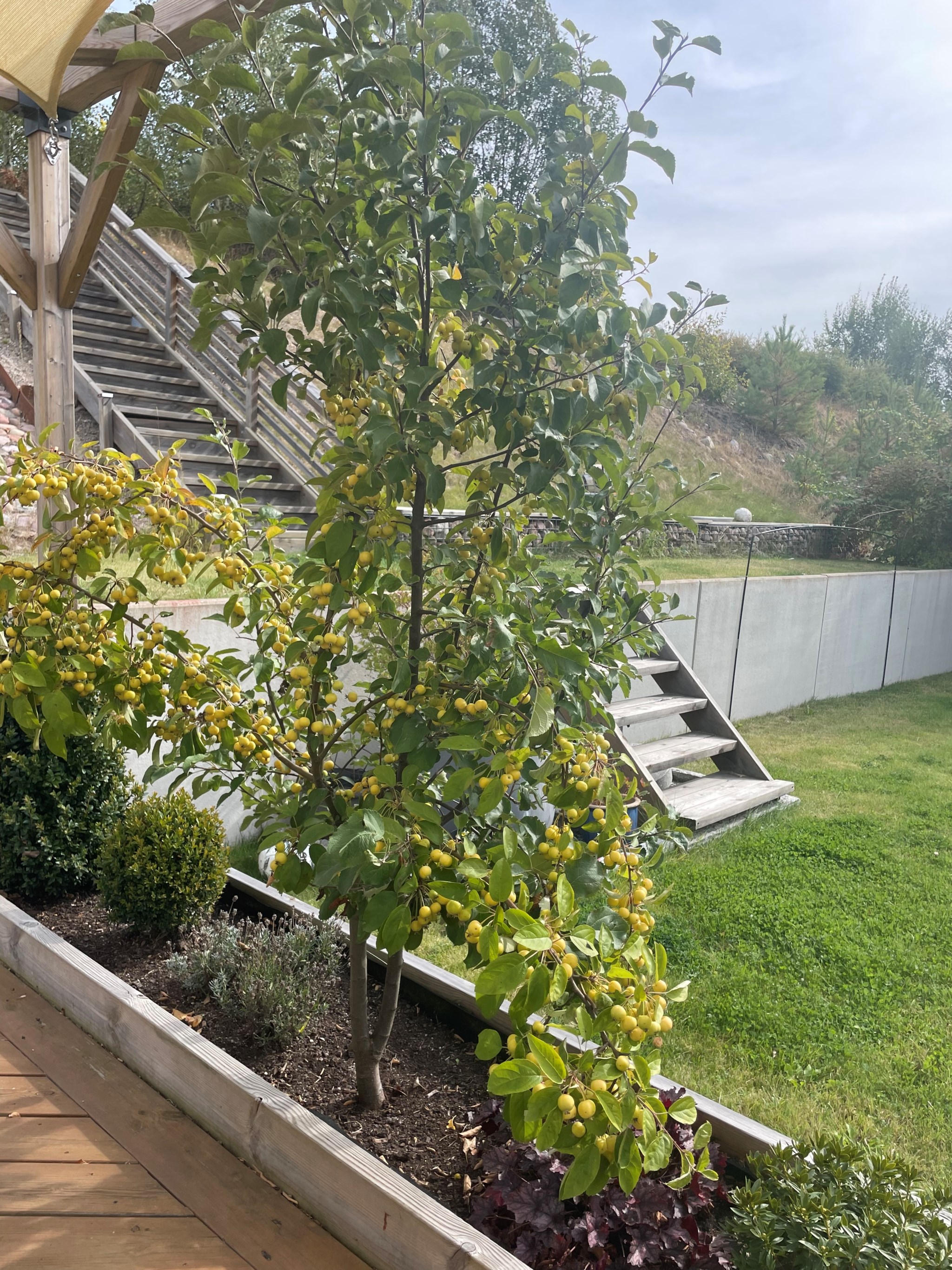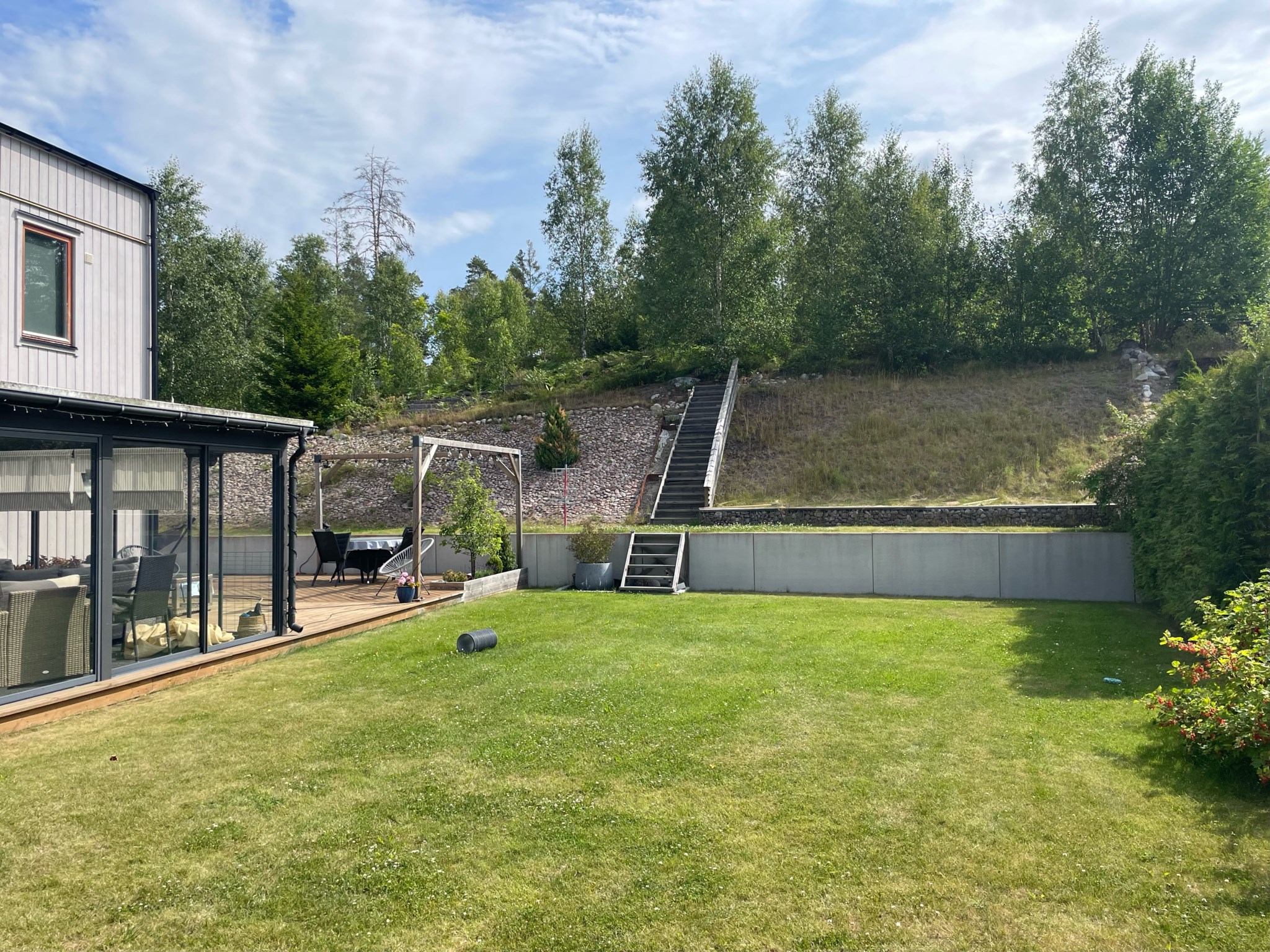 Från tomten leder en trappa upp mot berget som ger en fin extra dimension till utemiljön och skapar en mer privat och naturnära känsla. Här finns både soliga lägen och sköna skuggplatser, vilket gör det enkelt att följa solen under dagen. -