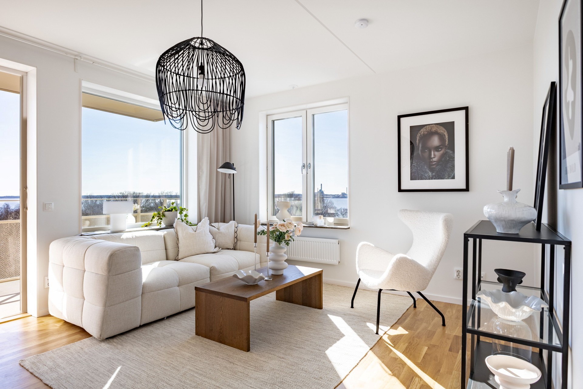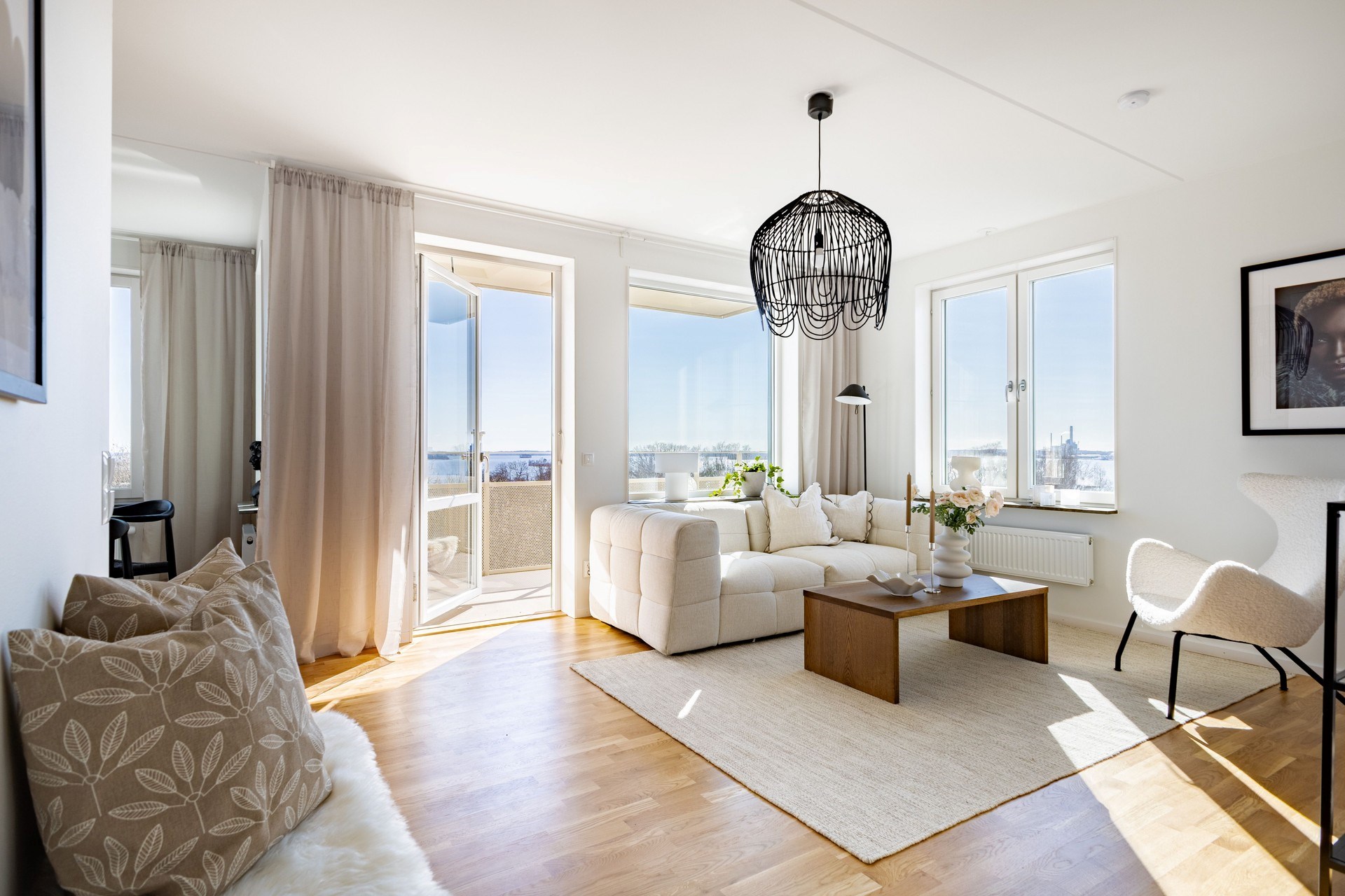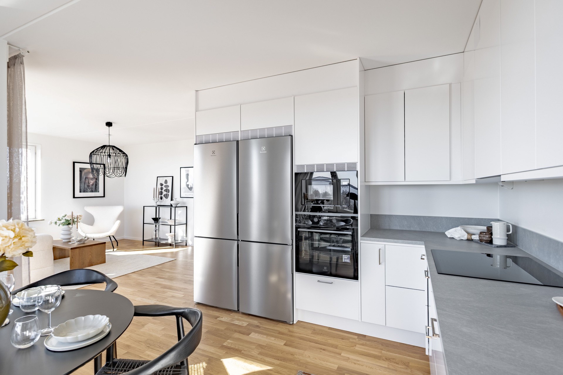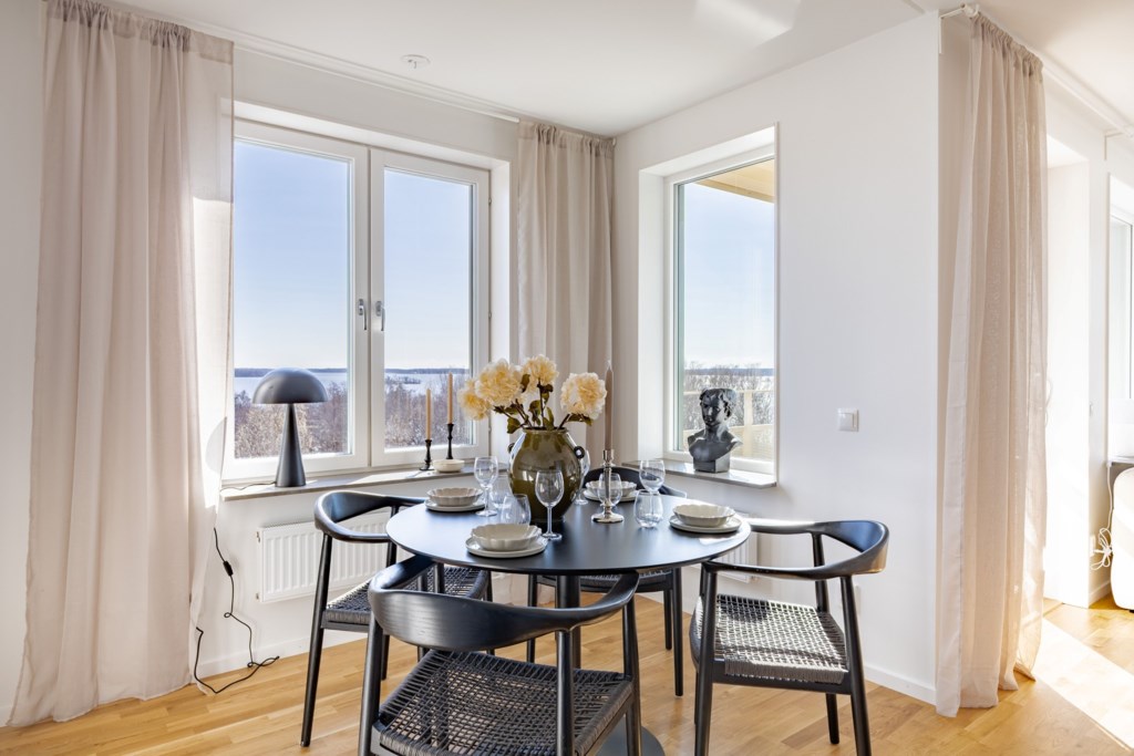 Bostaden präglas av en öppen och social planlösning där kök och vardagsrum samspelar i en ljus och luftig miljö, perfekt för både vardag och fest. De stora fönsterpartierna släpper in rikligt med ljus och låter utsikten bli en naturlig del av hemmet.