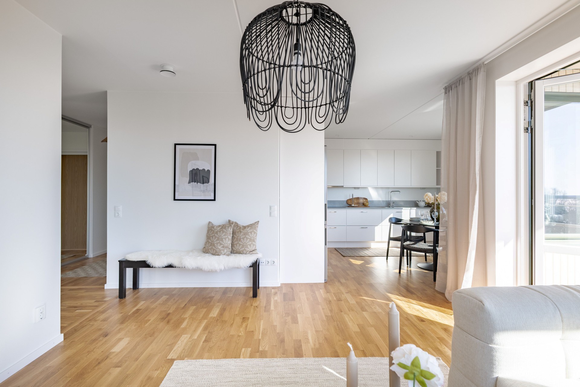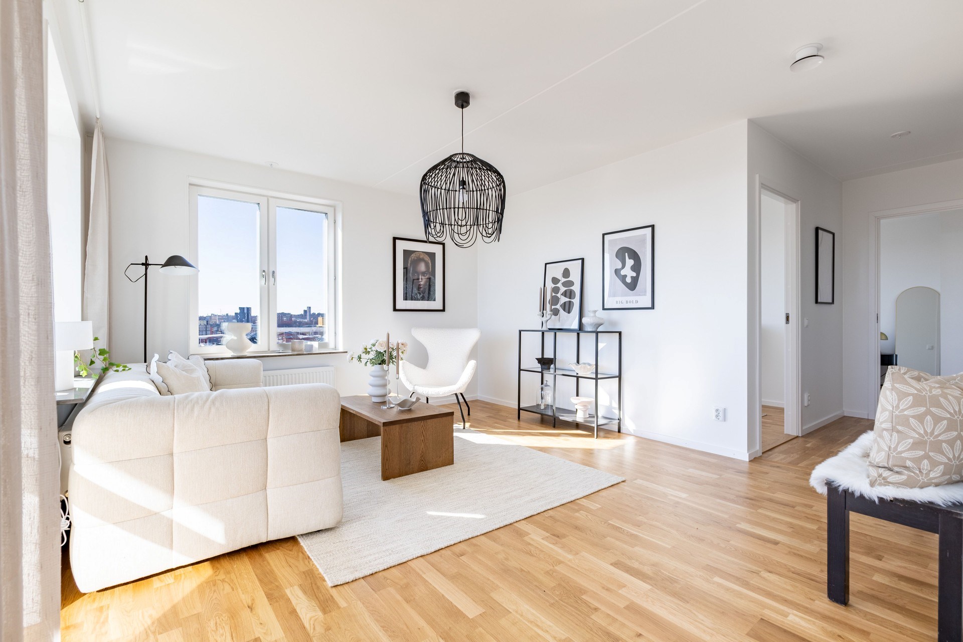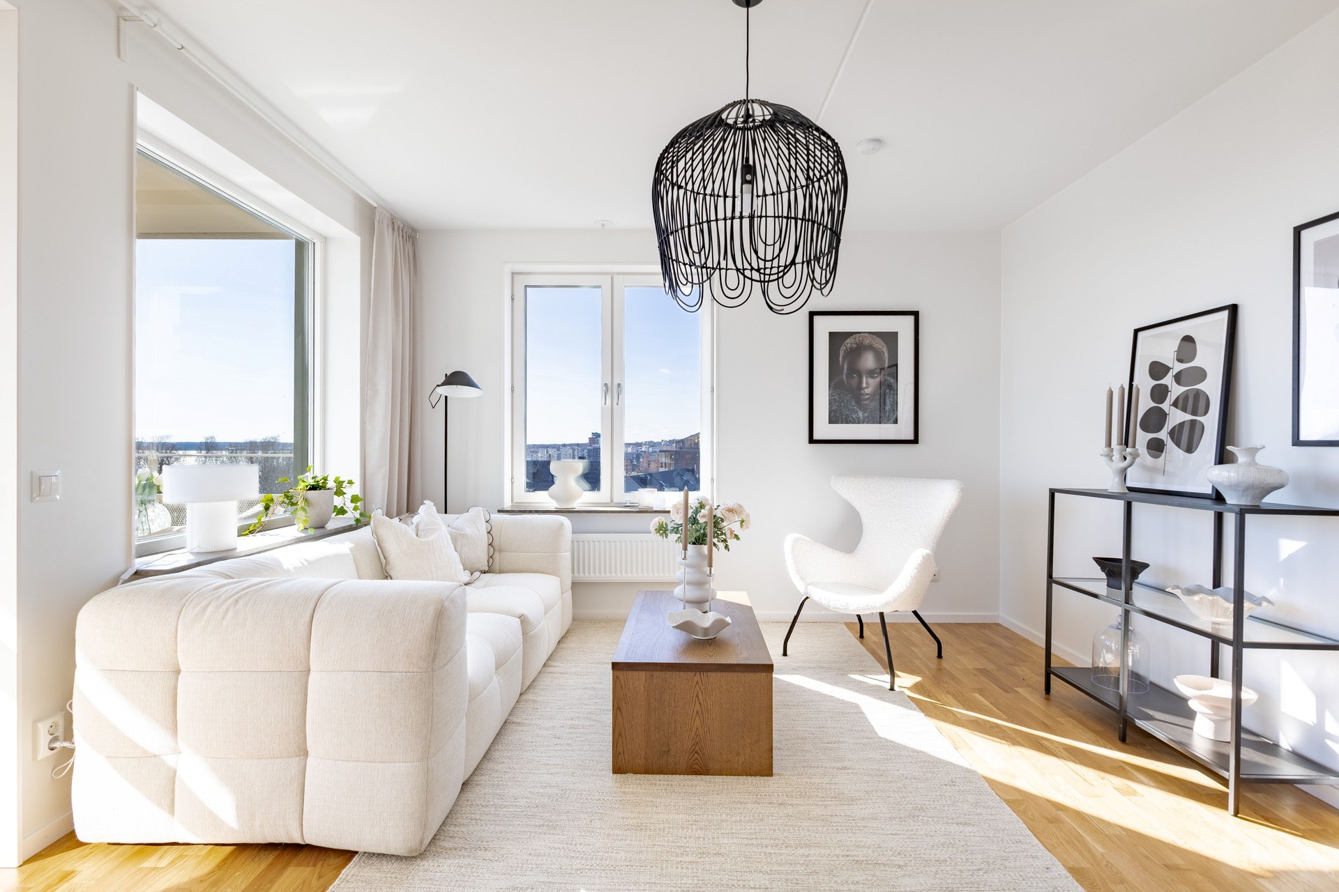 Bostaden präglas av en öppen och social planlösning där kök och vardagsrum samspelar i en ljus och luftig miljö, perfekt för både vardag och fest. De stora fönsterpartierna släpper in rikligt med ljus och låter utsikten bli en naturlig del av hemmet.
