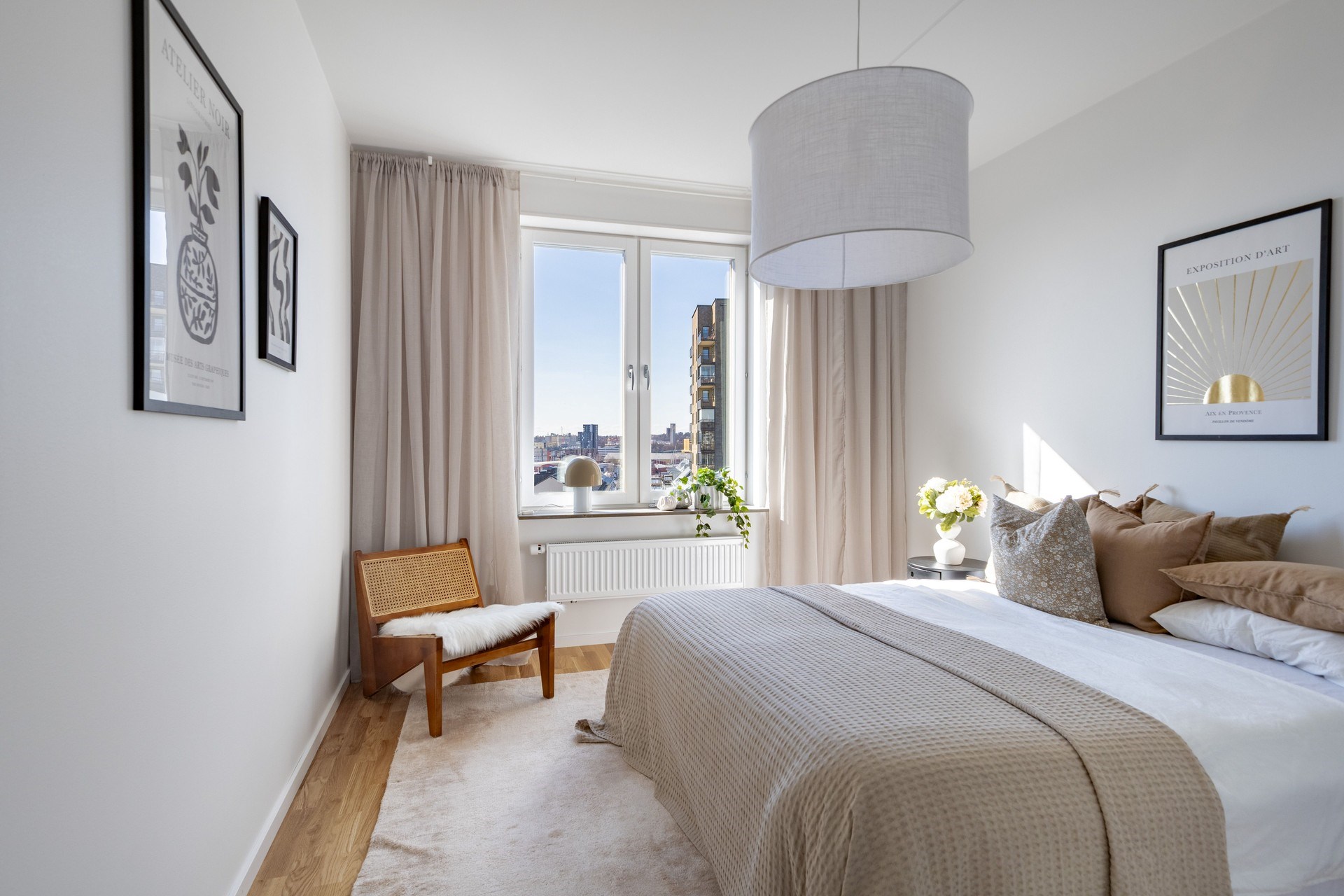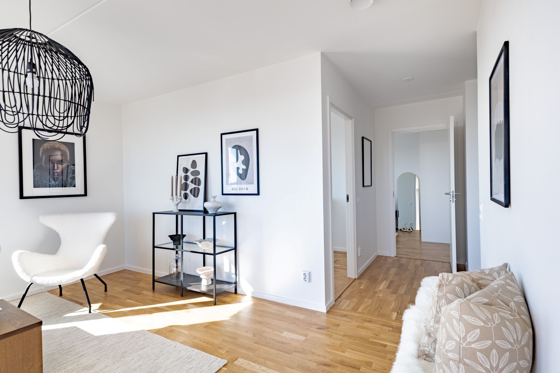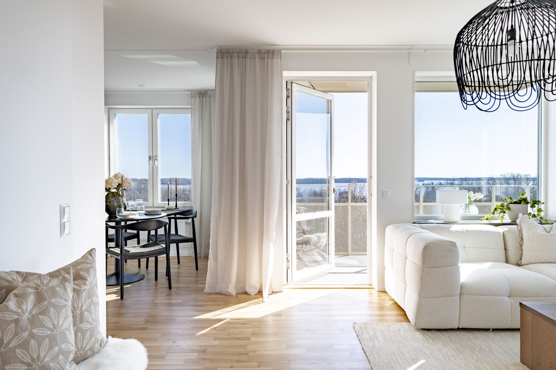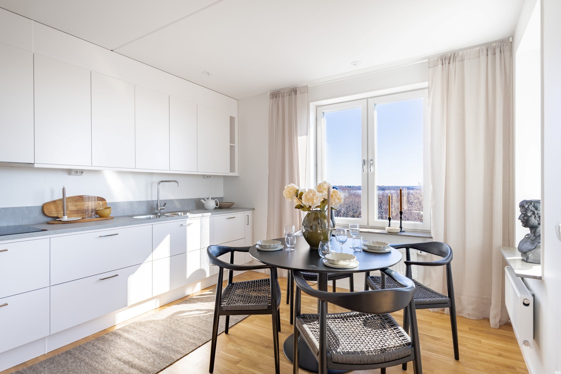 Bostaden präglas av en öppen och social planlösning där kök och vardagsrum samspelar i en ljus och luftig miljö, perfekt för både vardag och fest. De stora fönsterpartierna släpper in rikligt med ljus och låter utsikten bli en naturlig del av hemmet.