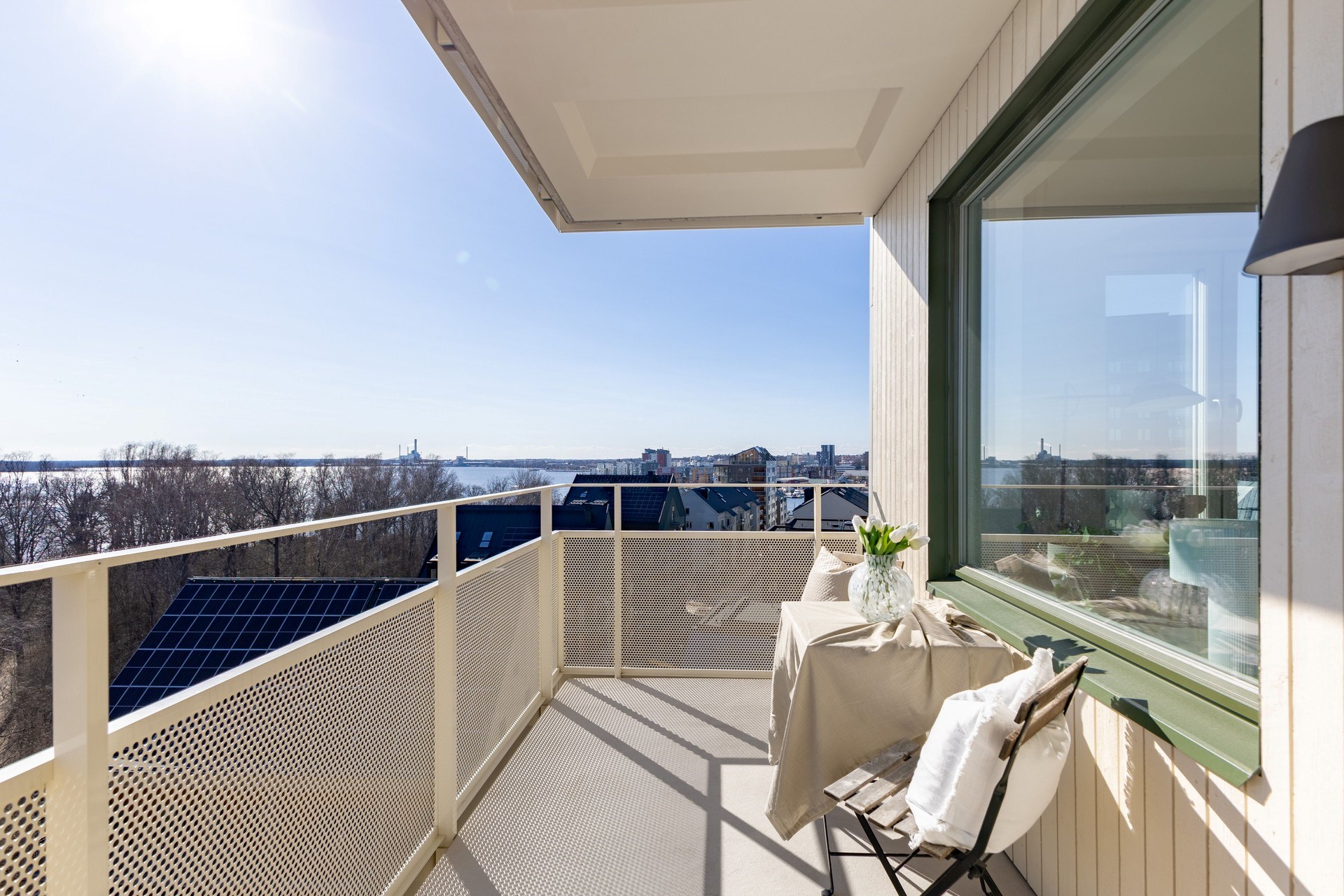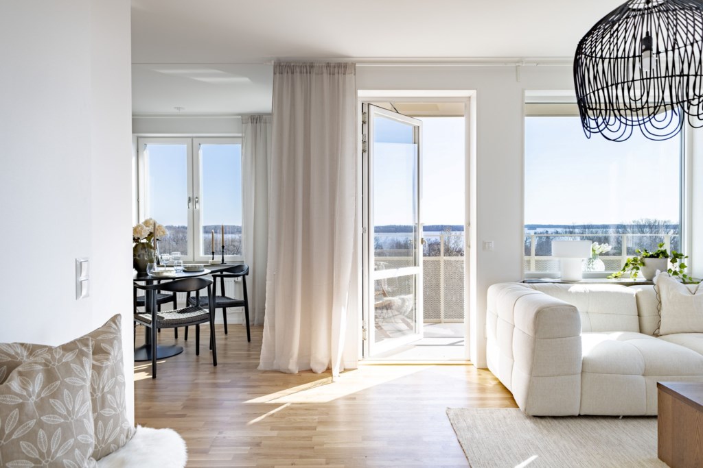 Från vardagsrummet nås den generösa balkongen i söderläge, där du kan njuta av solen större delen av dagen samtidigt som du blickar ut över vattnet, en plats som verkligen höjer livskvaliteten.