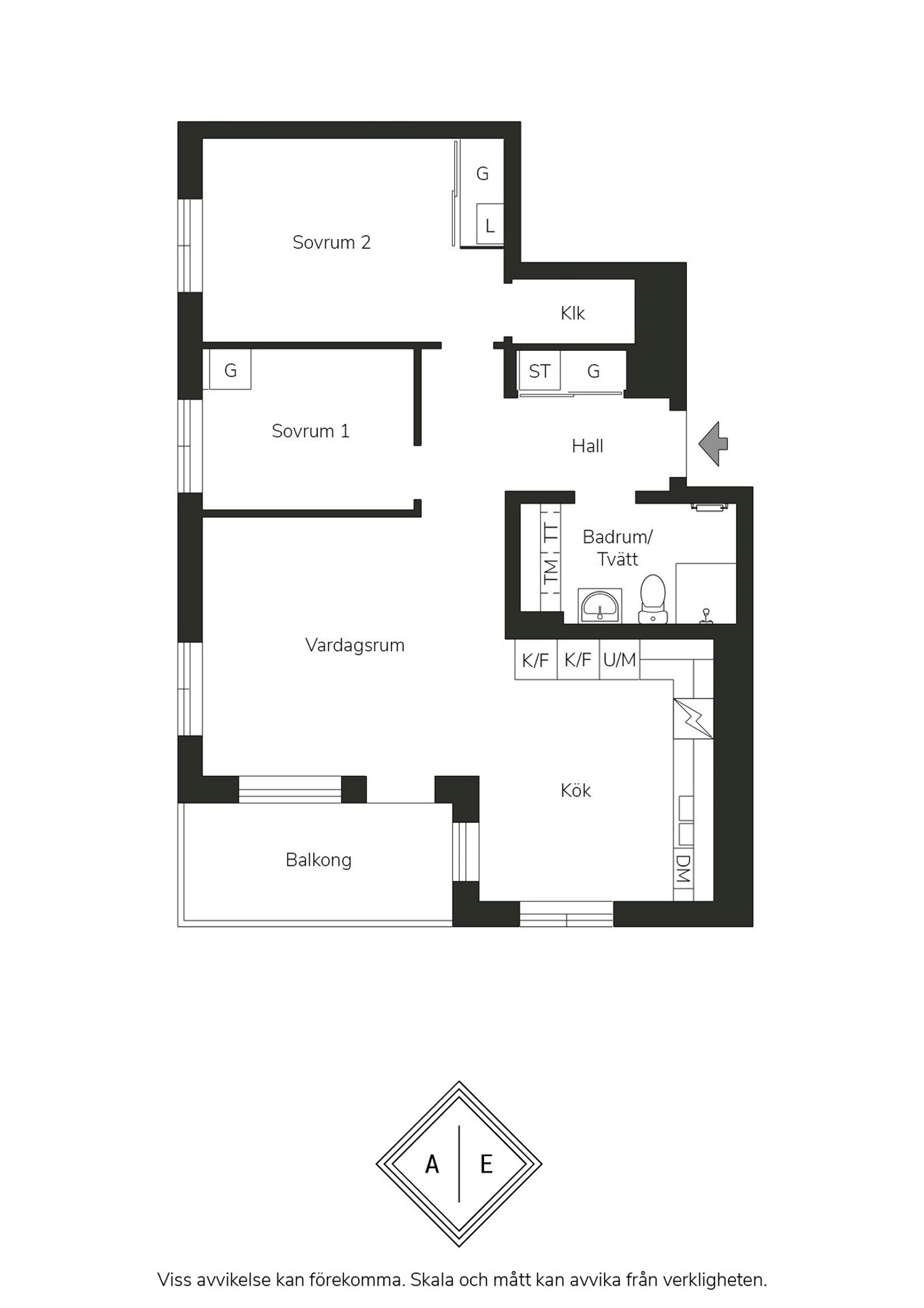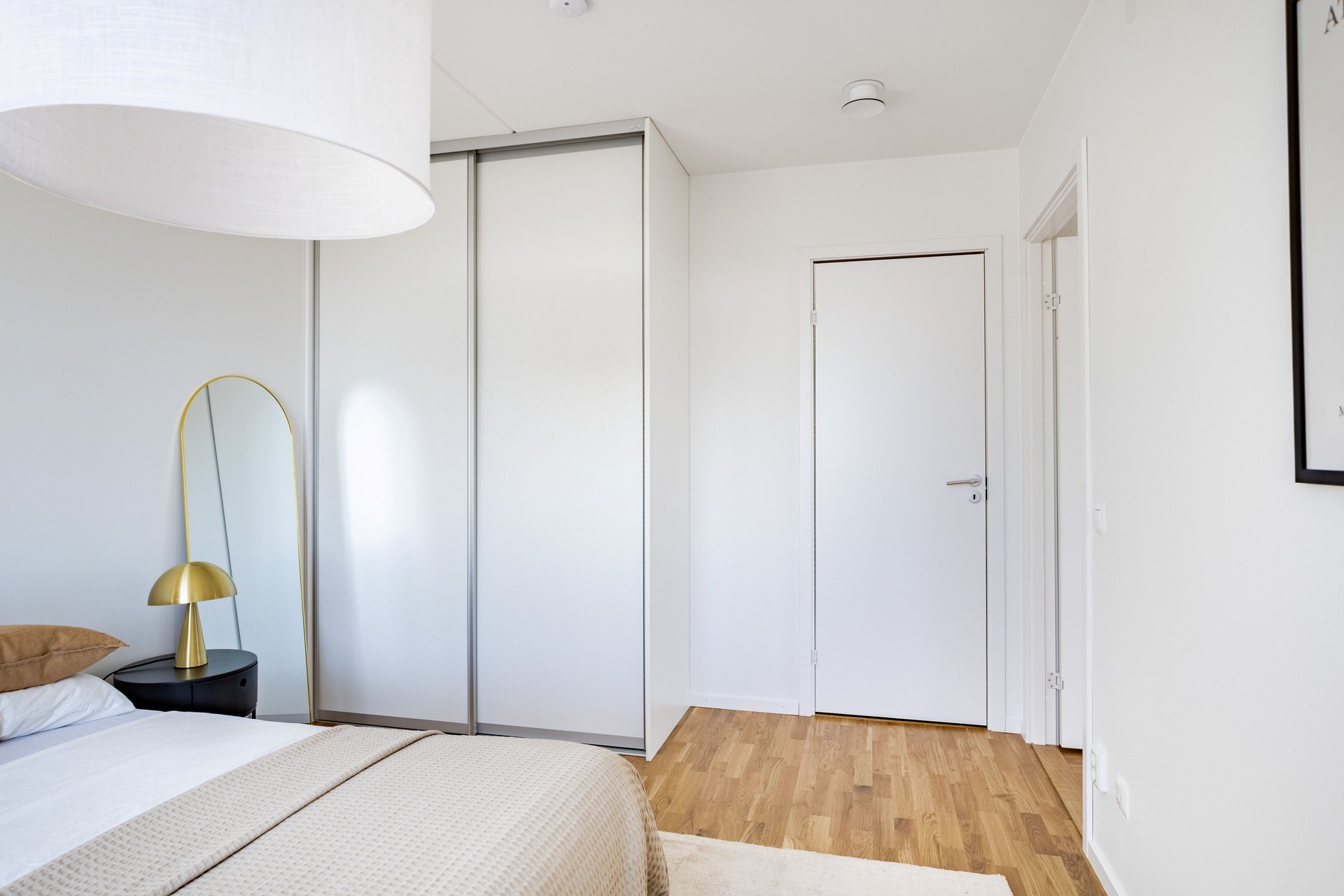 Sovrum med plats för dubbelsäng och förvaring via den stora skjutdörrsgarderoben och en egen klädkammare för ytterligare förvaring. För den som vill ha en stor två:a så kan sovrummet anpassas genom att det mindre sovrummet utgår och detta sovrum utökas, se förklaring på ritning (tillval).