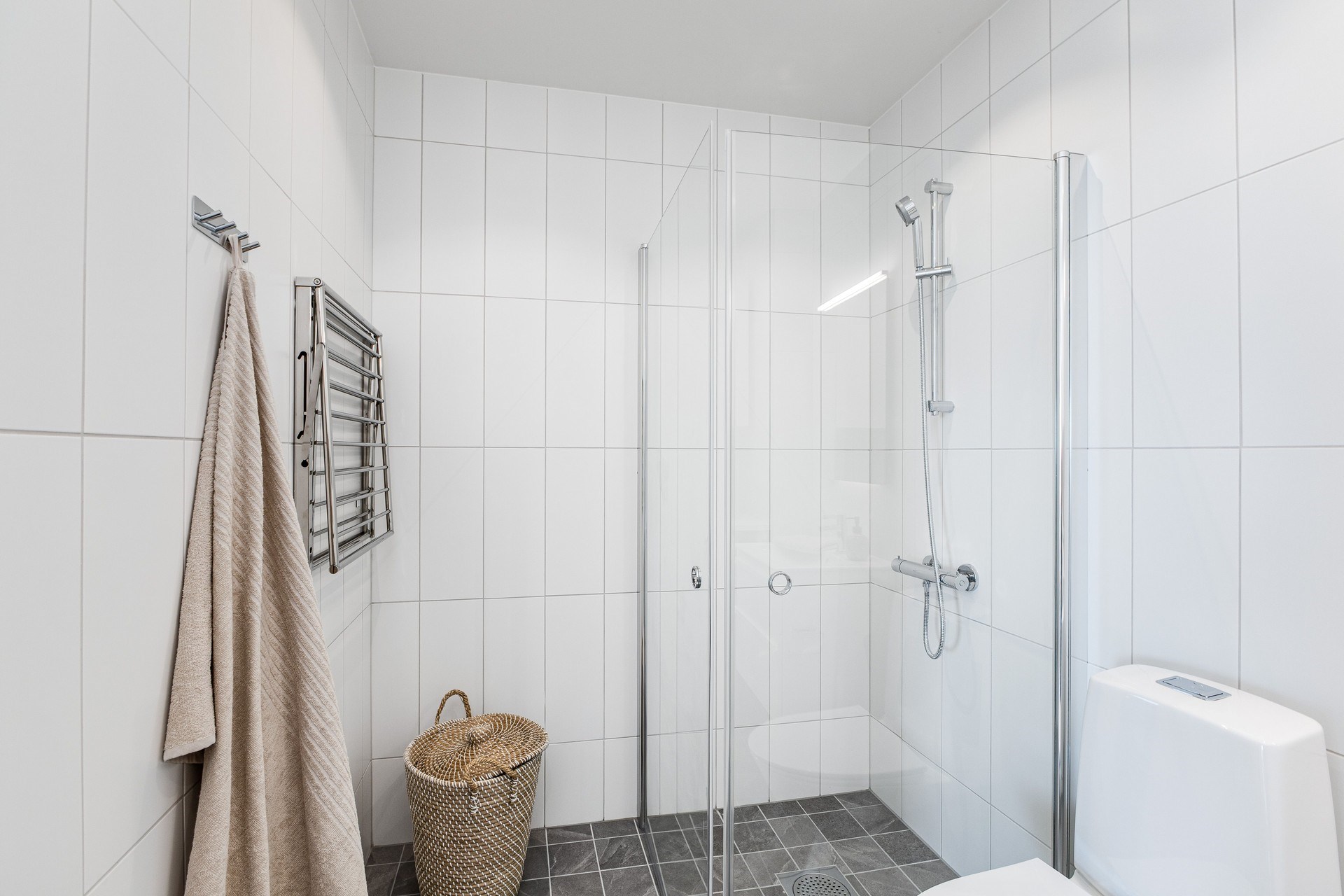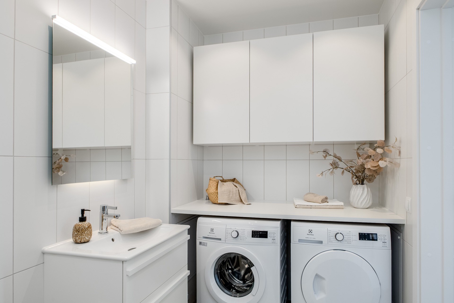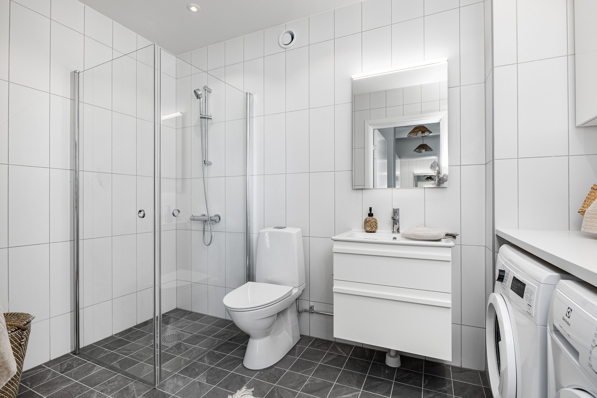 Helkaklat badrum med duschhörna med dörrar i klarglas. Tvätten skötes enkelt med tvättmaskin och torkumlare, båda från Electrolux. Ovanför tvättutrustningen finns en praktisk arbetsbänk och förvaring i väggskåp. JMs torkställning John och ytterligare förvaring i kommod gör det lätt att hålla ordning. Ovanför kommoden sitter en spegel med LED-belysning.