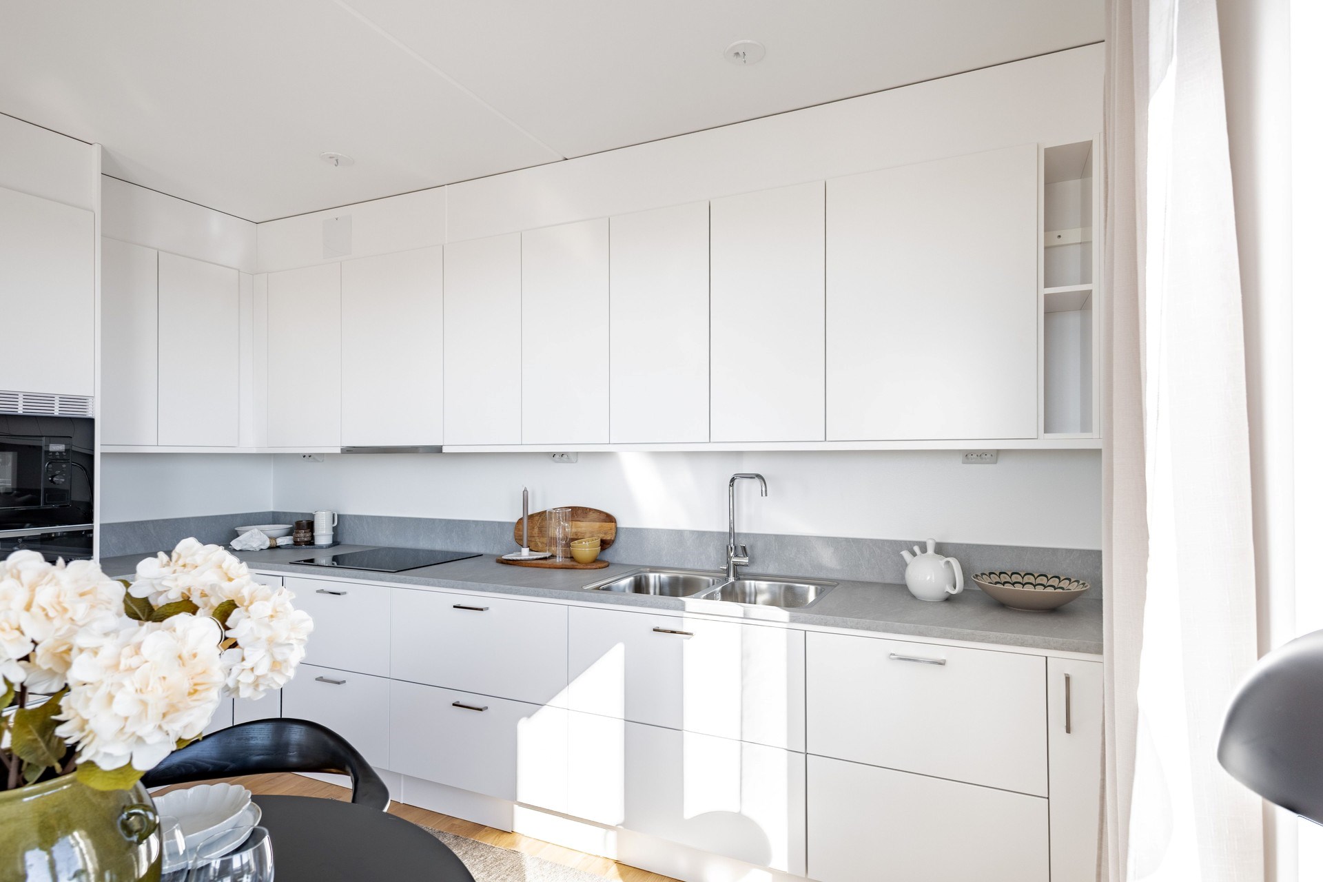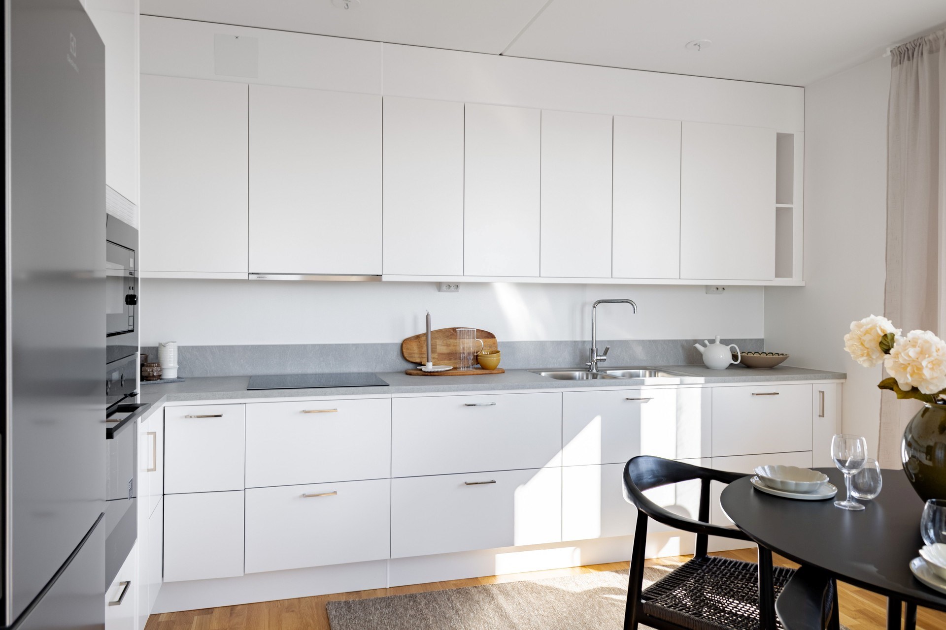 Fullutrustat kök med plats för matbord. Köksluckor och bänkskiva från Vedum, vitvarorna består av en integrerad diskmaskin, induktionshäll, dubbla kyl/frys samt mikro och ugn i högskåp - allt från Electrolux.