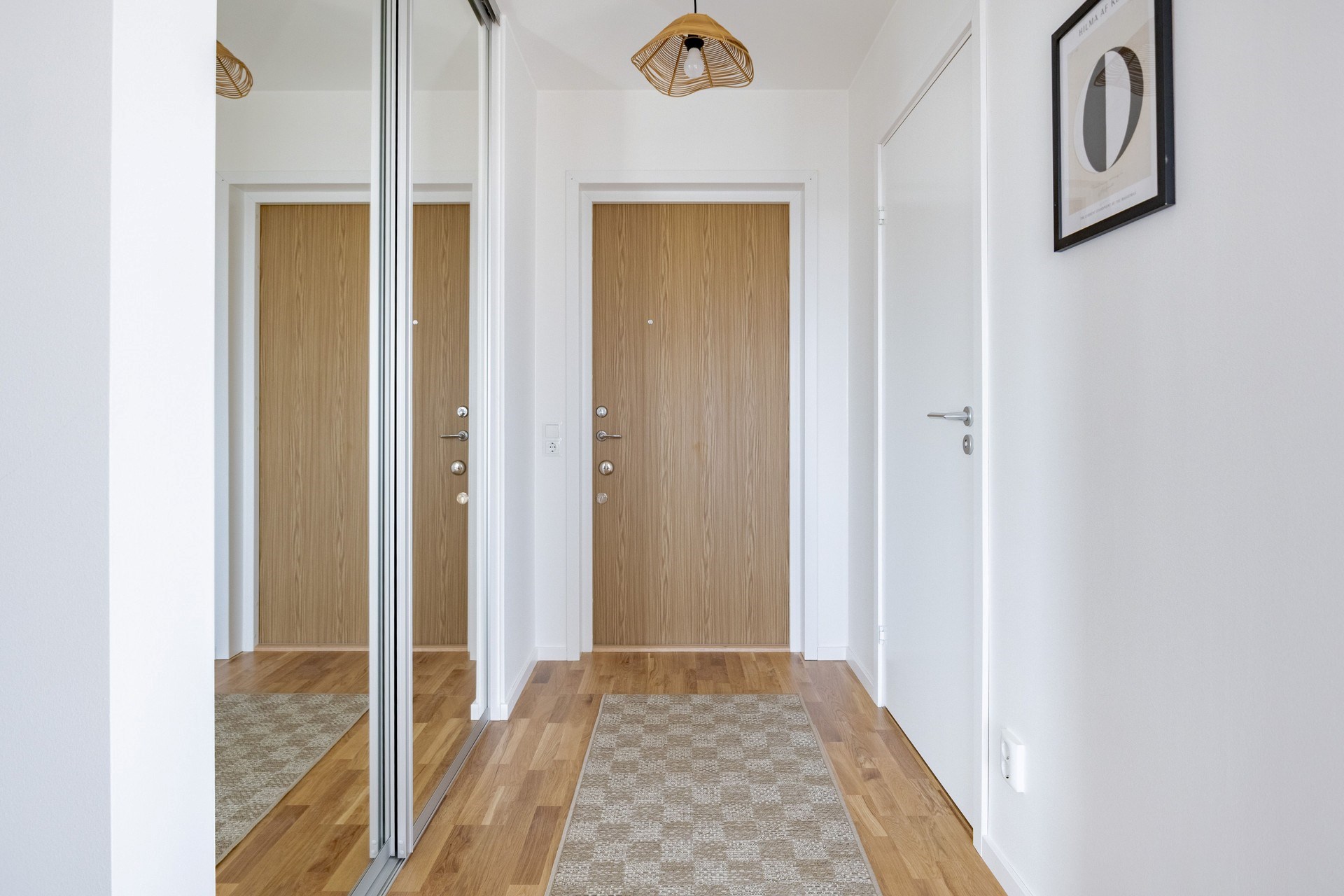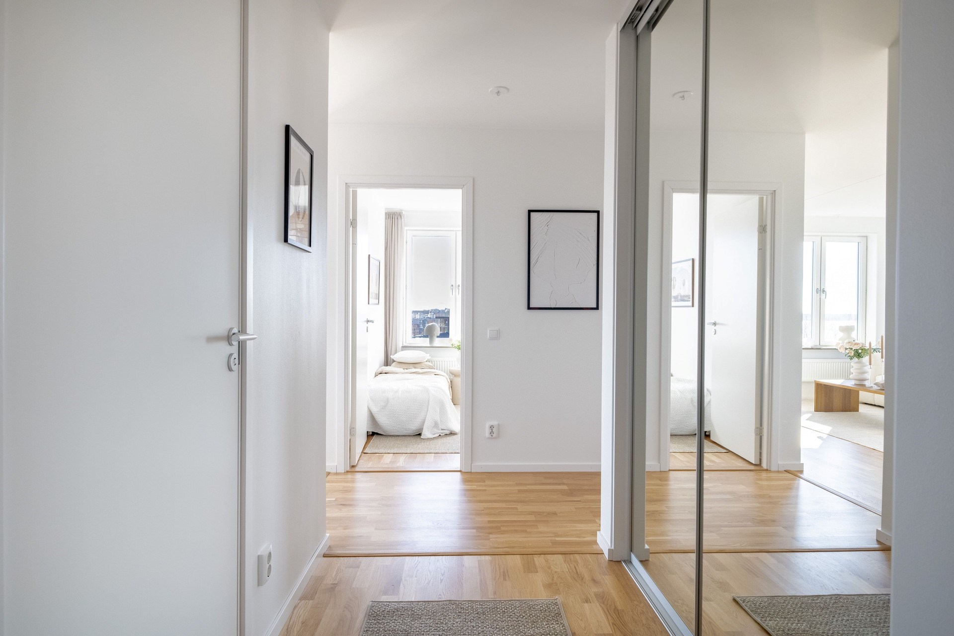 Välkomnande hall med praktisk förvaring i skjutdörrsgarderob.
