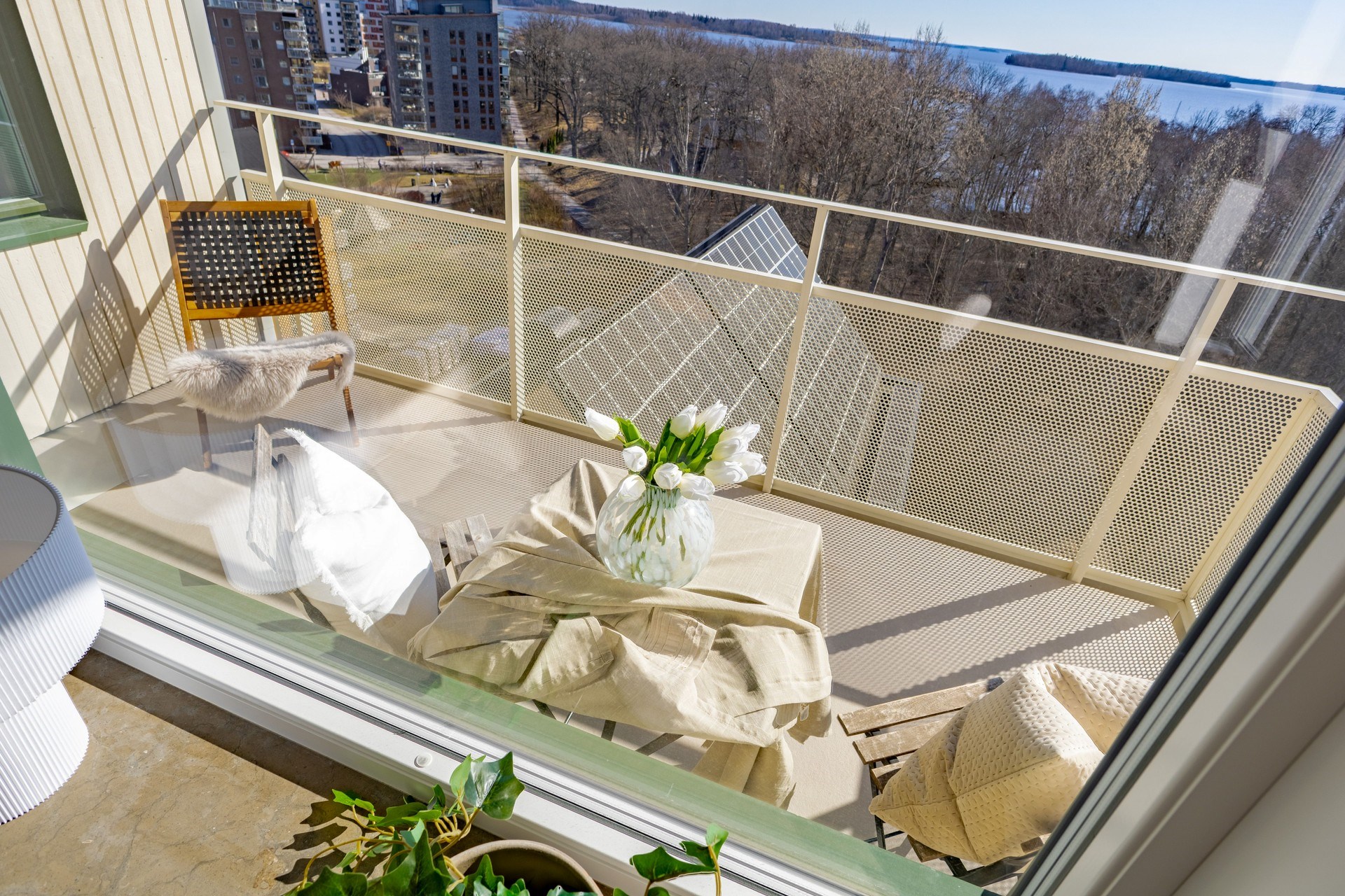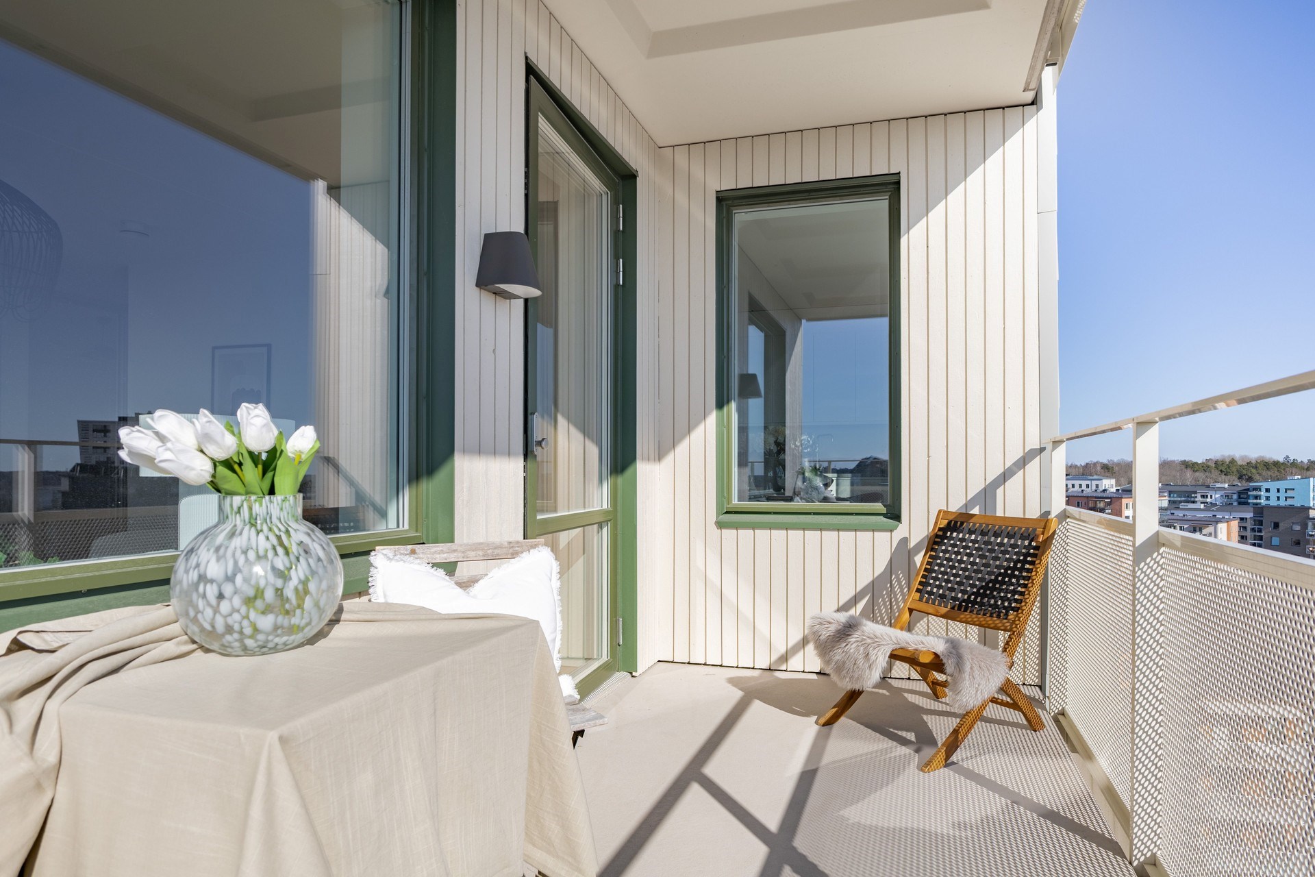 Generös balkong med plats för sittgrupp. Balkongen ligger i trivsamt söderläge, utgång från vardagsrummet.