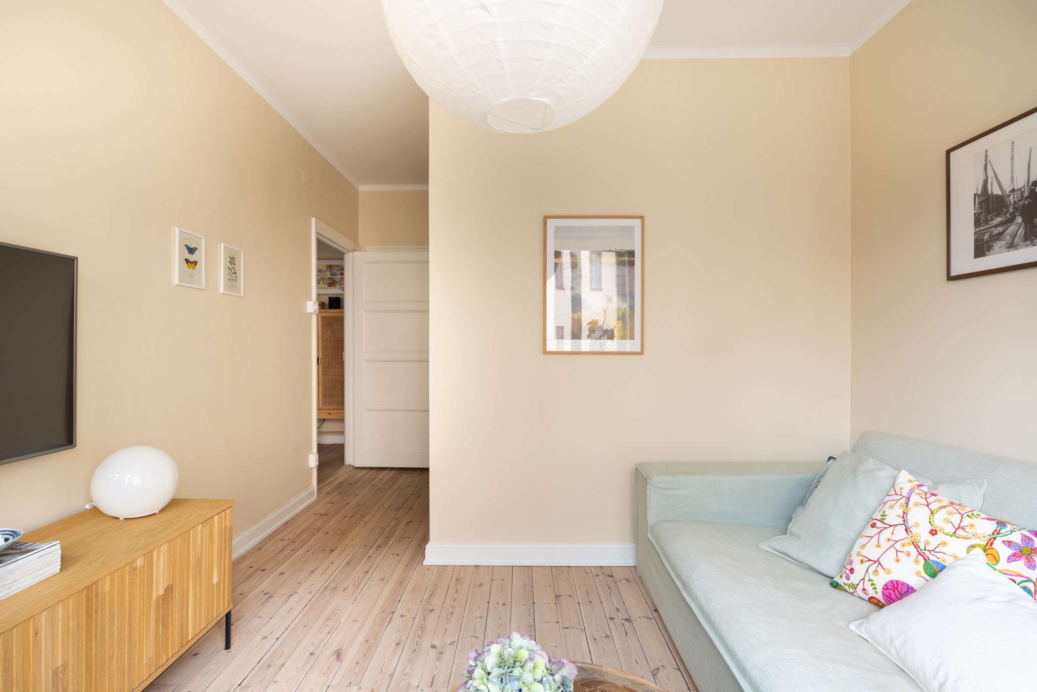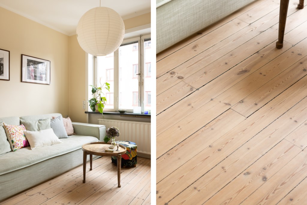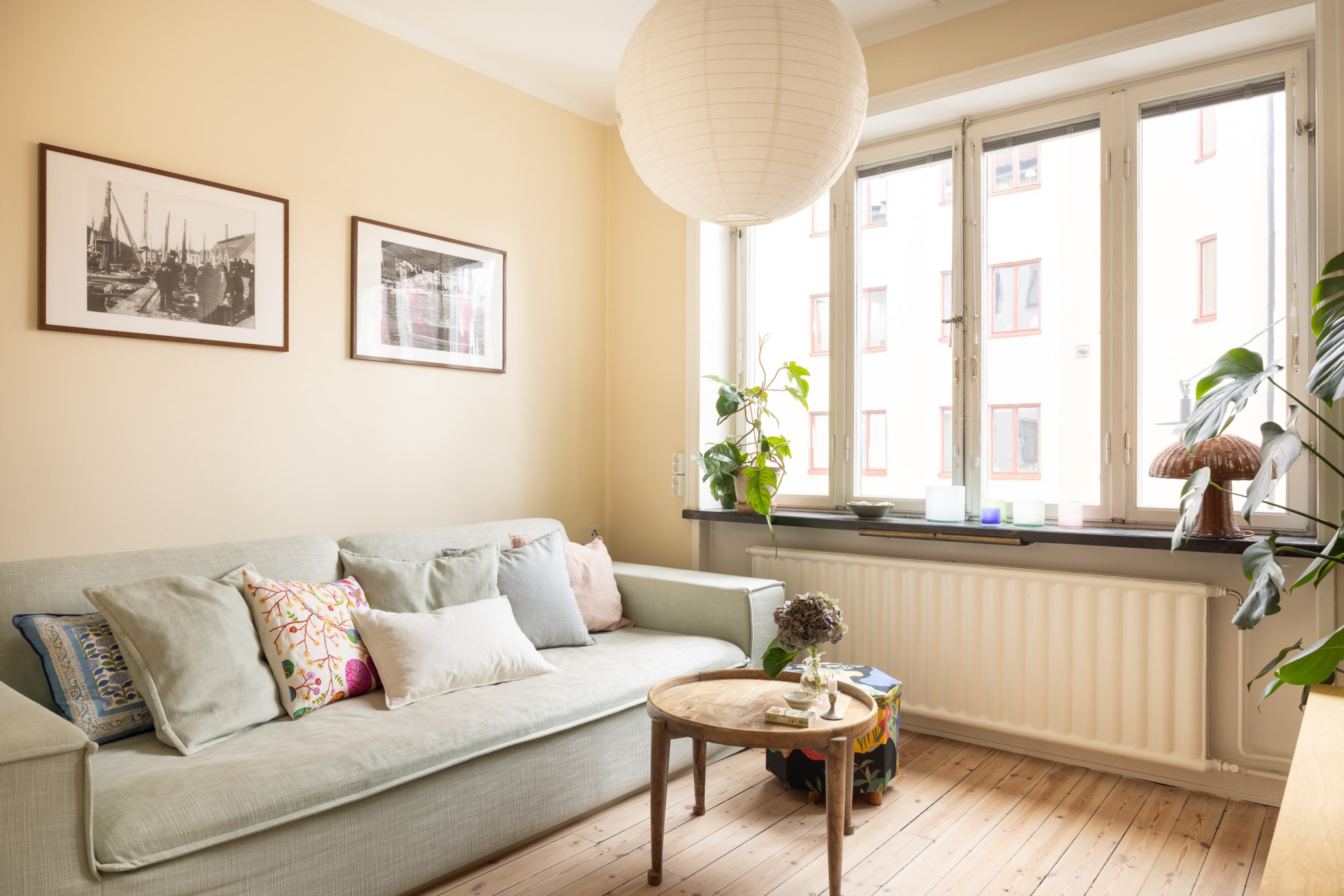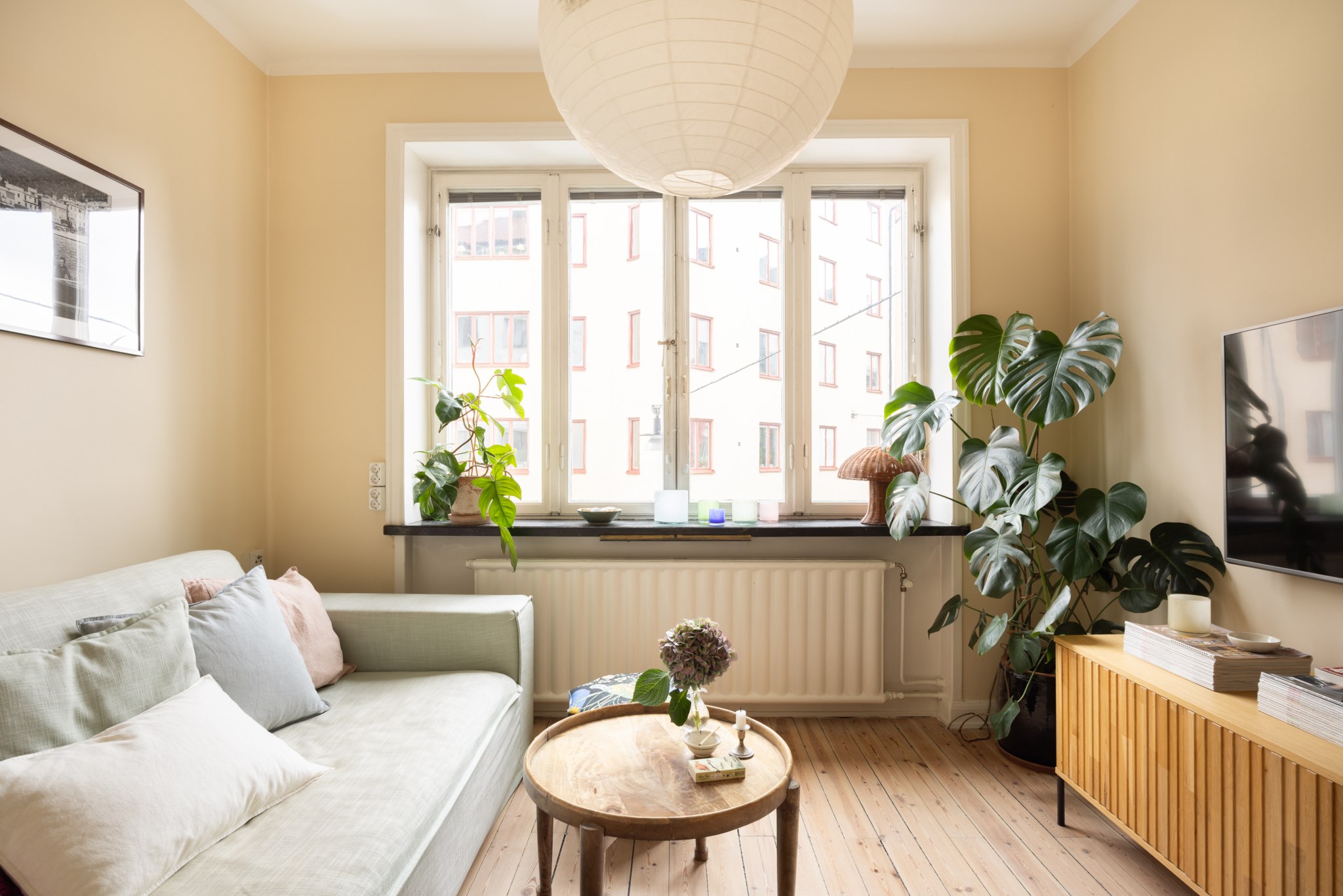 Ljust vardagsrum med generöst ljusinsläpp från ett stort fönsterparti. Här finns plats för soffa och annan personlig inredning. Rummet har neutralt målade ytskikt och ett vackert trägolv som sätter stilen.