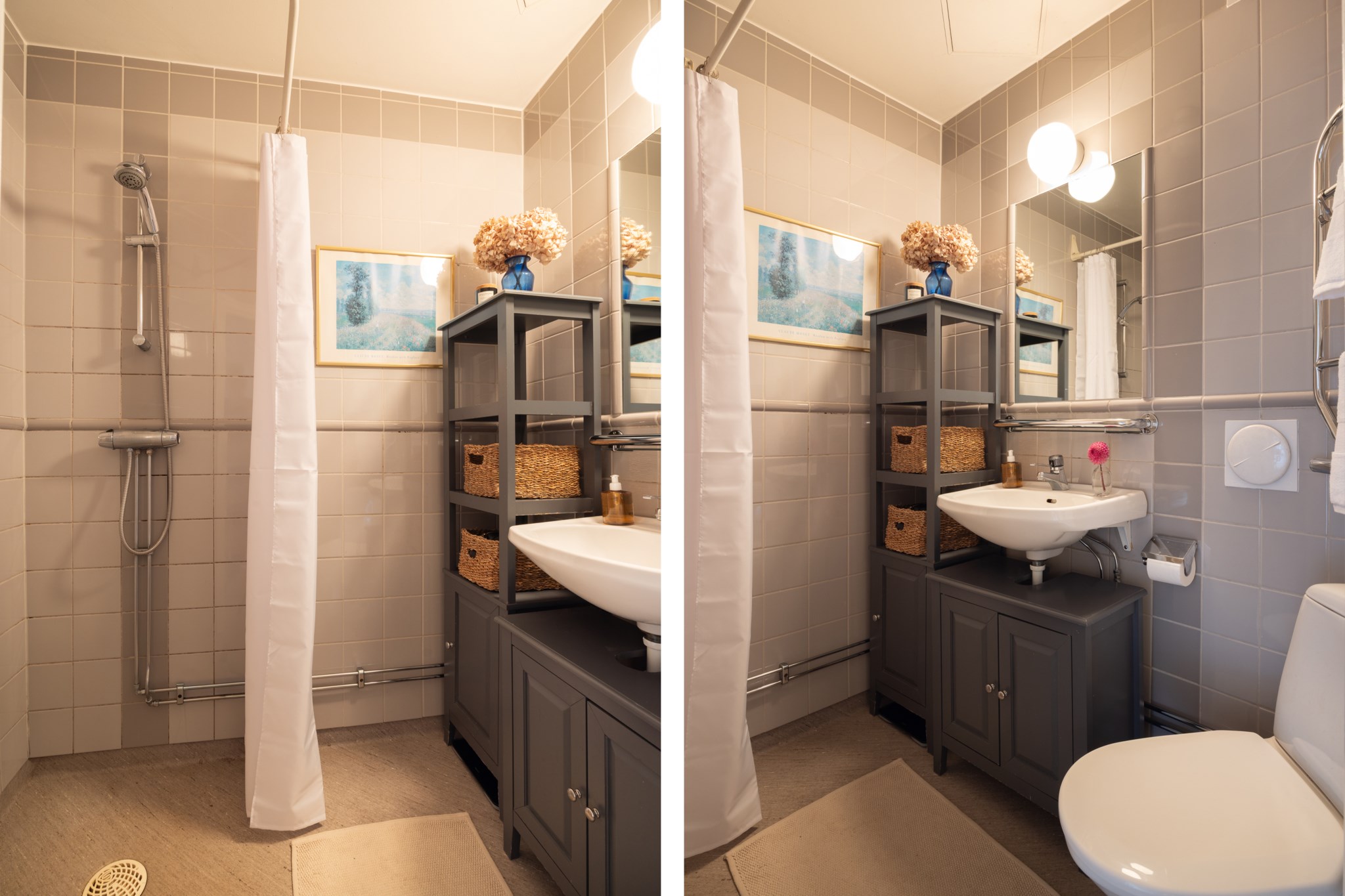 Fräscht badrum med kaklade väggar, inrett med WC, handfat med spegel ovan, handdukstork samt dusch.