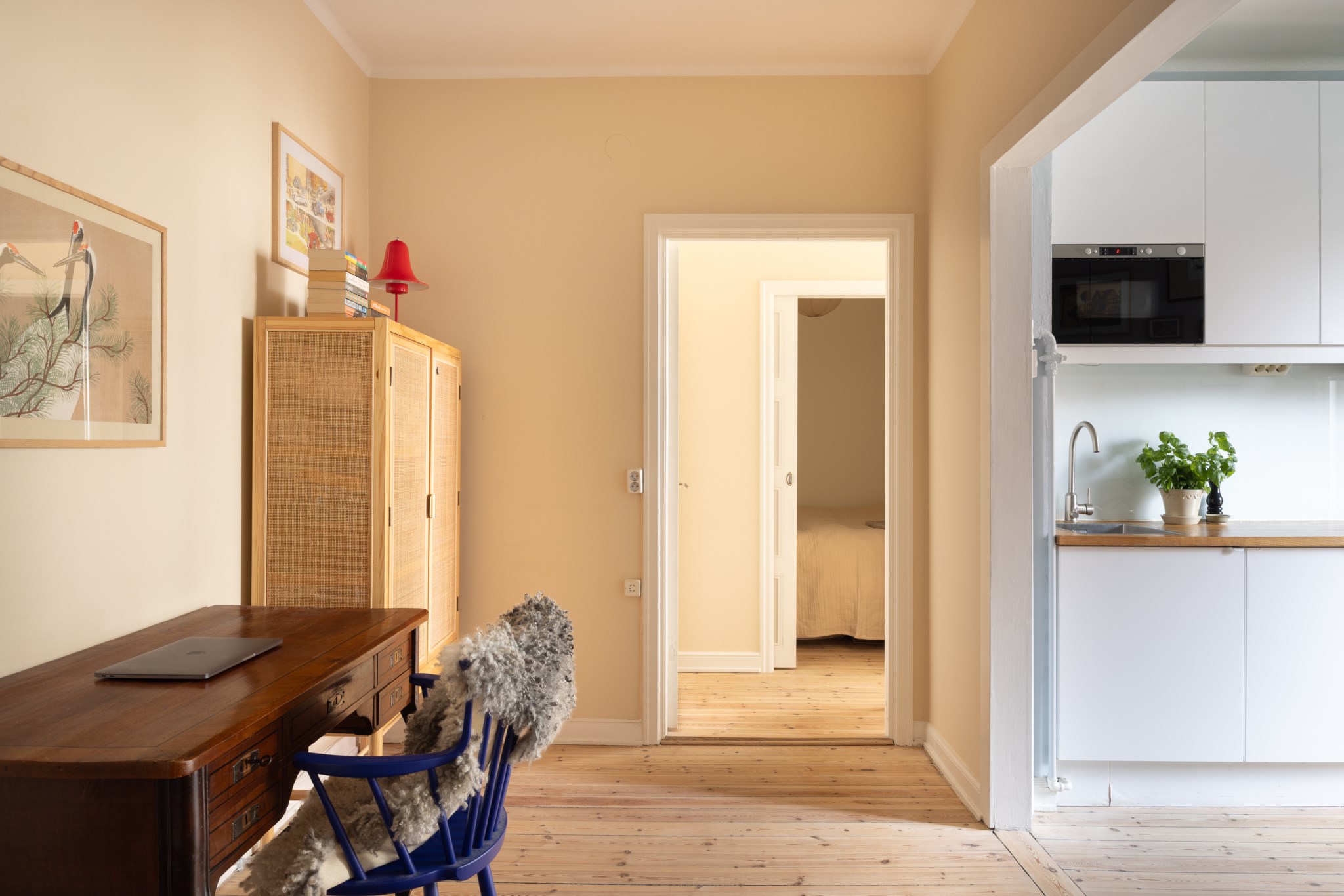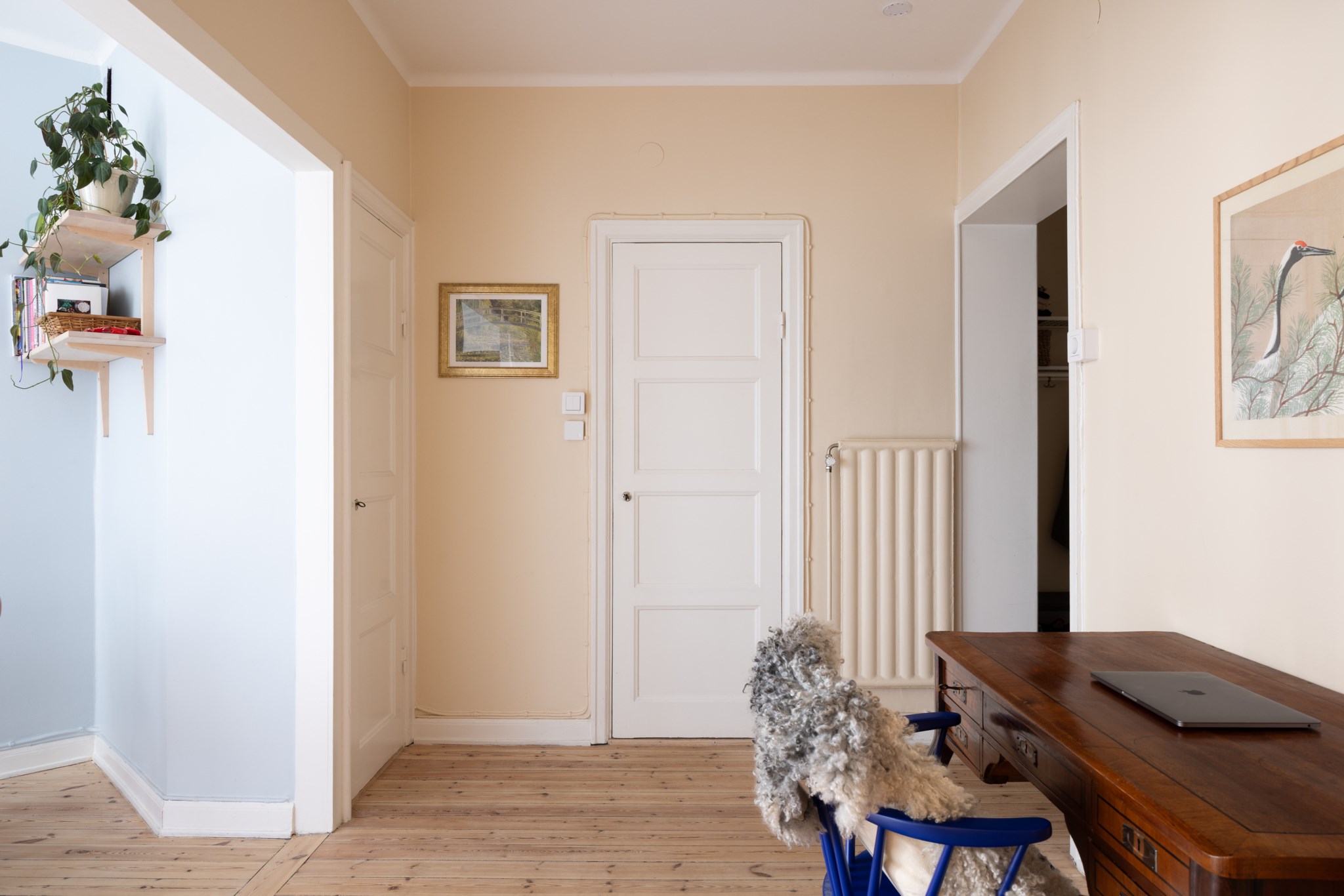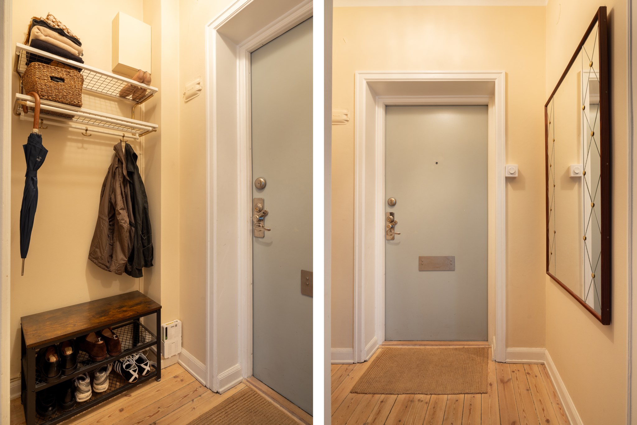 Välkomnande entré med tambur som erbjuder plats för avhängning av ytterkläder och skor. Härifrån leder bostaden vidare till en möblerbar hall med möjlighet att inreda efter behov med exempelvis ett sideboard, garderober eller som en praktisk arbetshörna. I anslutning till hallen finns dessutom två klädkammare som ger gott om förvaring. Hallen har genomgående ljusa ytskikt och vackert trägolv.