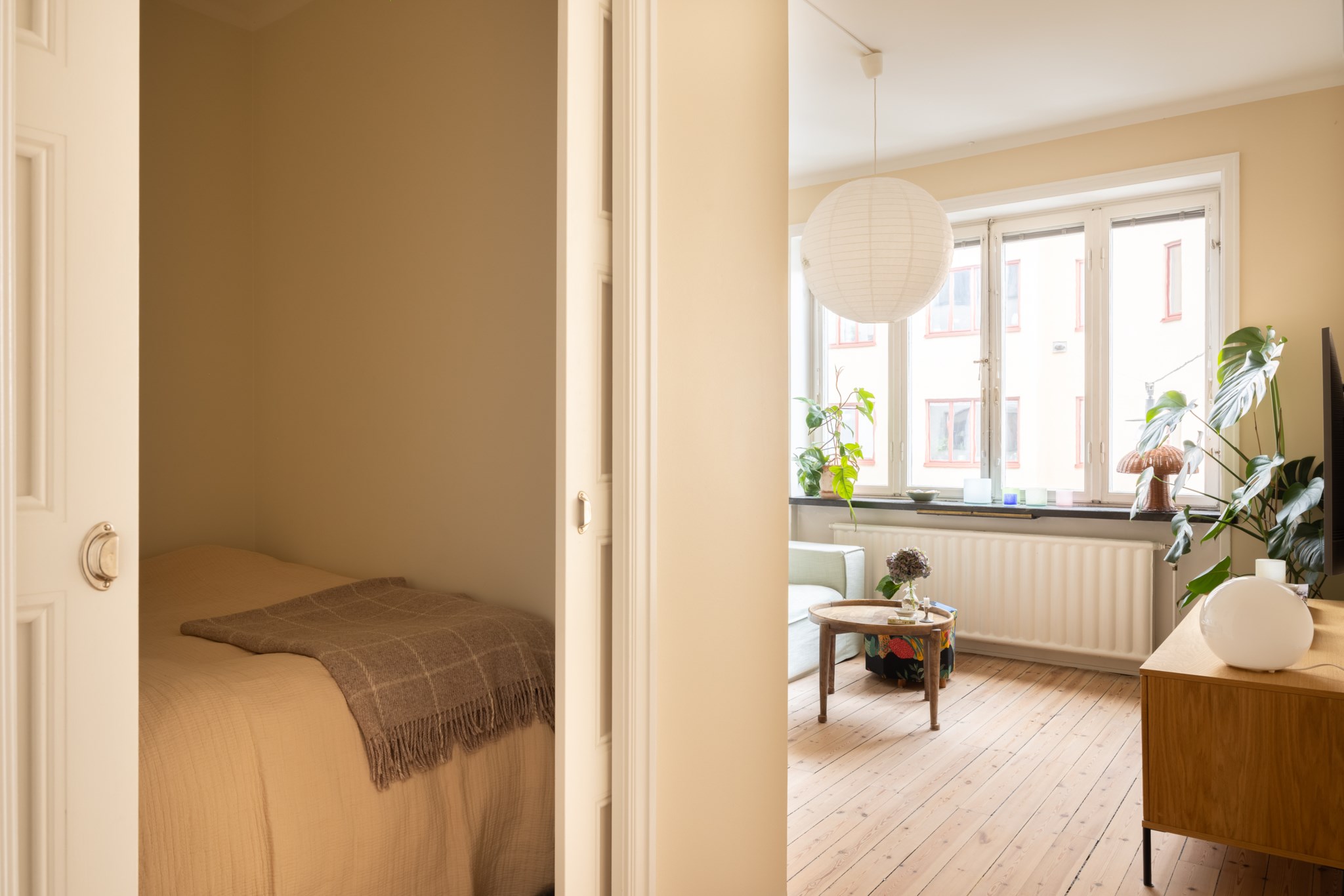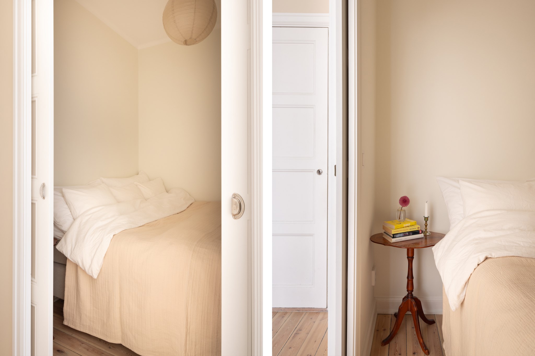 Mysigt sovrum med plats för säng och tillhörande sängbord. Väggarna är målade i en lugn, neutral kulör och golvet pryds av vackert trägolv.