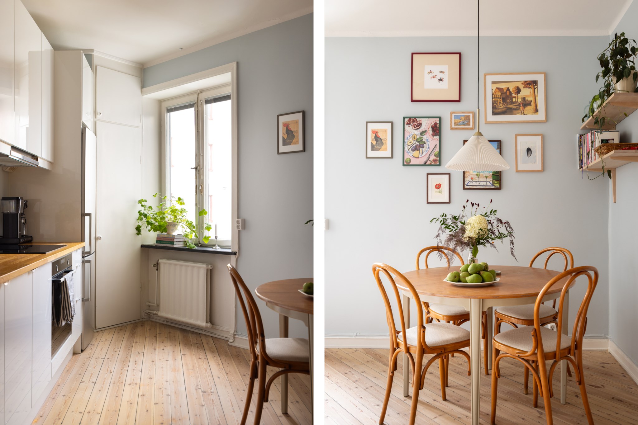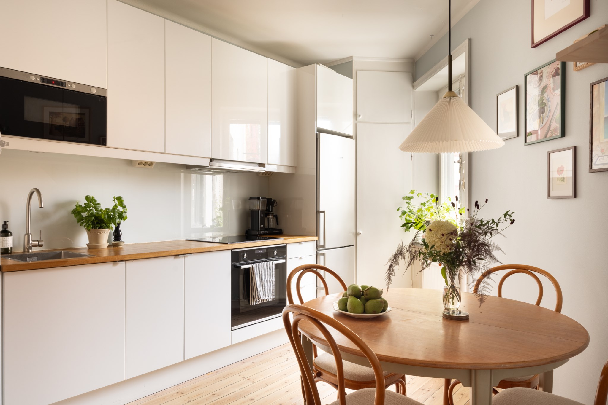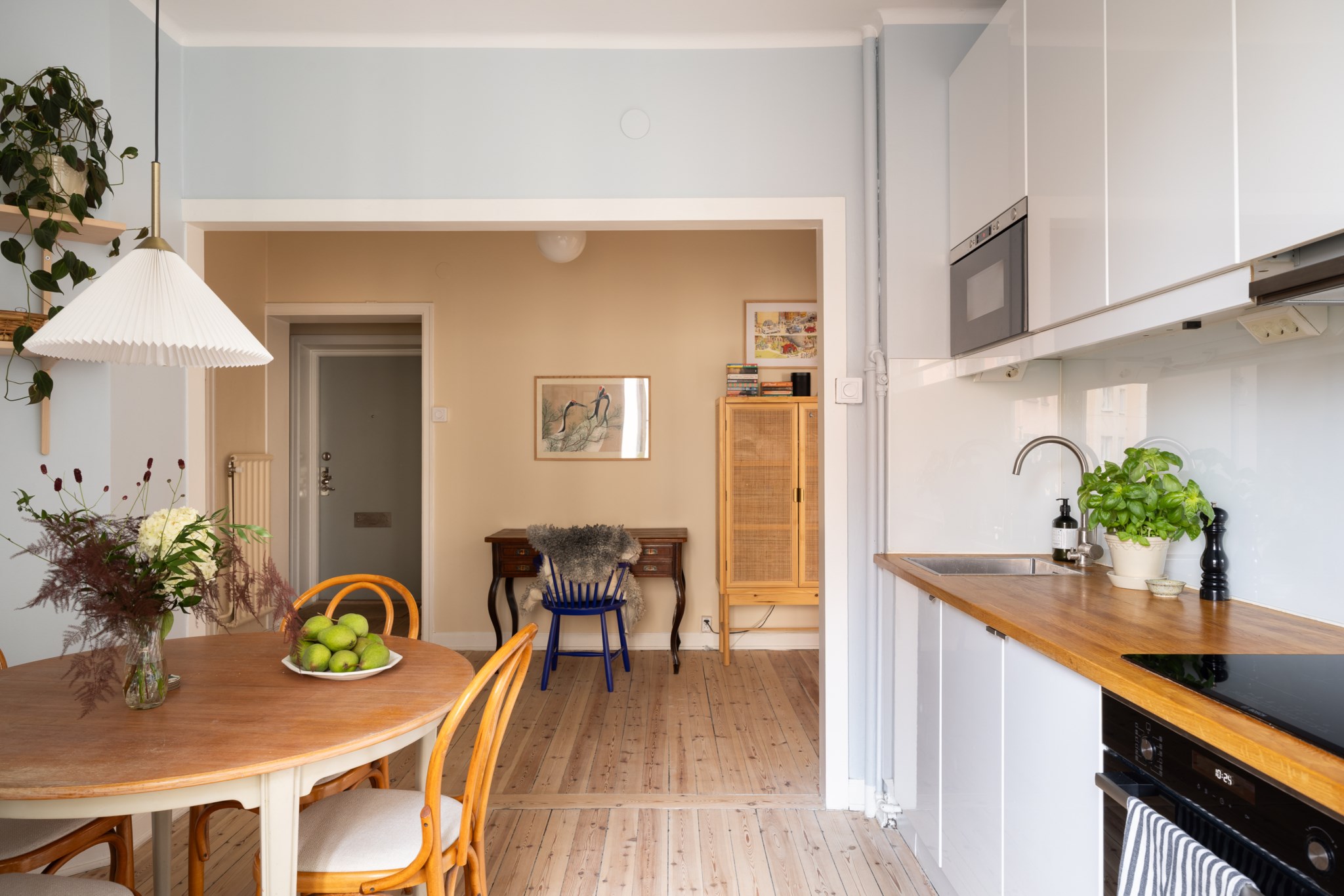Klassiskt och stilrent kök med fint ljusinsläpp från fönster där matplatsen är trevligt placerad intill. Inredningen består av ljusa, släta skåpsluckor, bänkskiva i trä och ljus väggpanel. Den maskinella utrustningen består av kyl/frys, spishäll, fläkt, ugn och mikro. Väggarna är målade i en harmonisk blå kulör och golvet pryds av vackert trägolv.