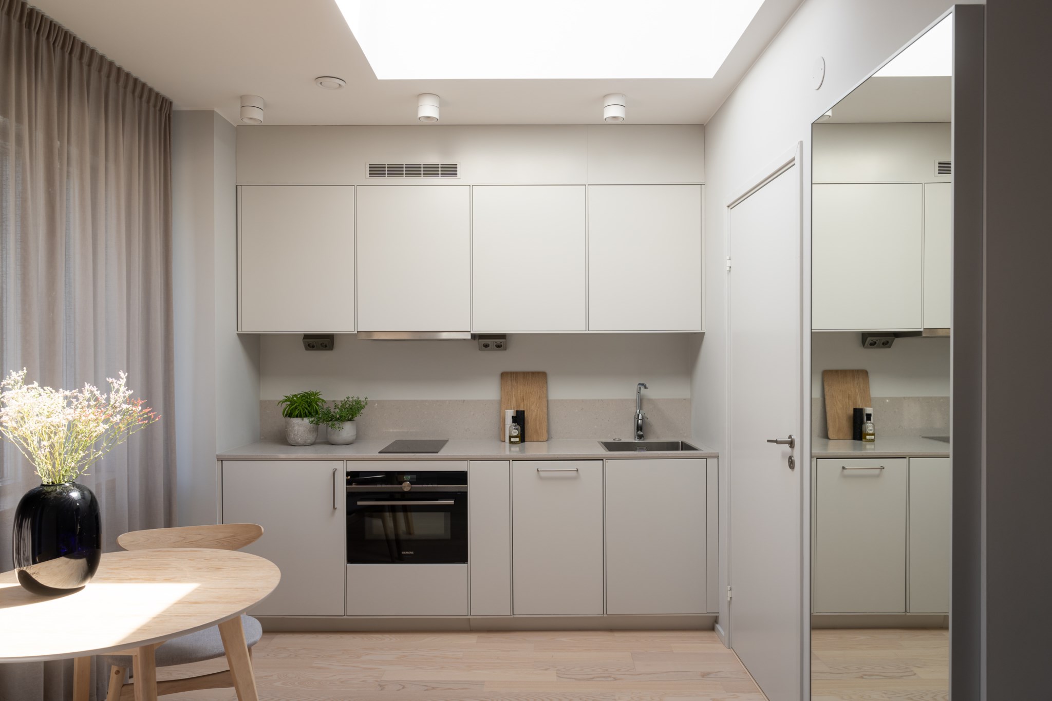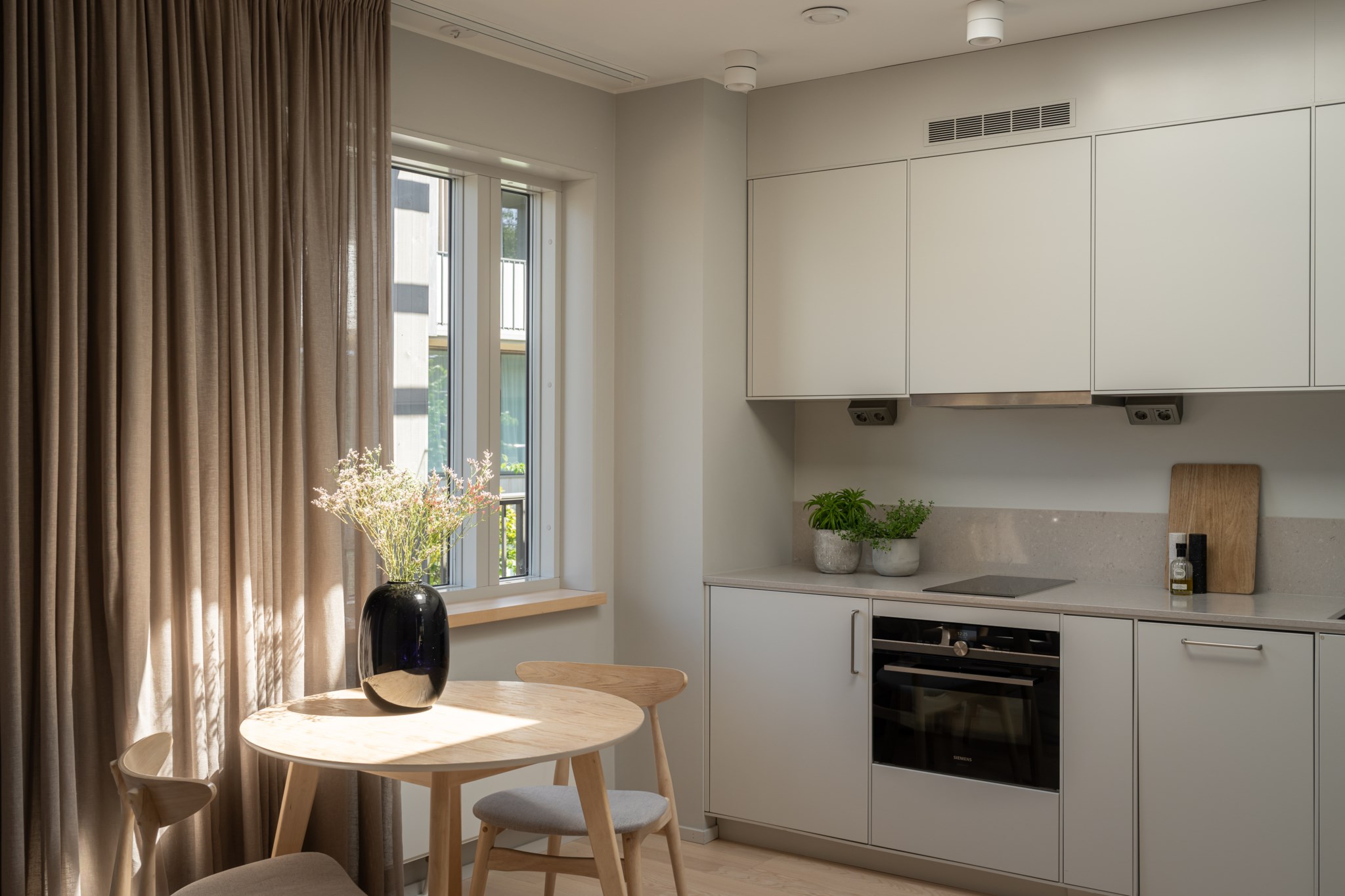 Modernt kök från Ballingslöv med stilrena materialval och gott om förvaring bakom släta skåpsfronter. Den neutrala, melerade bänkskivan löper upp en bit på väggpanelen och skapar ett sömlöst och elegant intryck. Matplatsen är naturligt placerad intill fönstret med fint ljusinsläpp. Köket är utrustat med kyl, spishäll, ugn, fläkt och diskmaskin. Neutralt målade ytskikt och fint vitlaserat tvåstavs golv i ask.