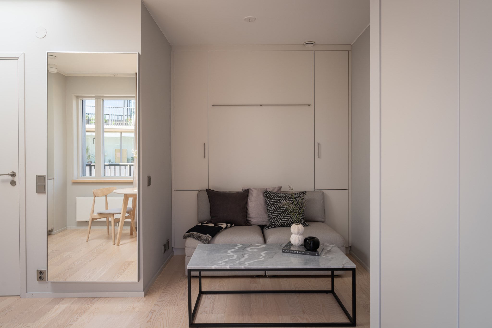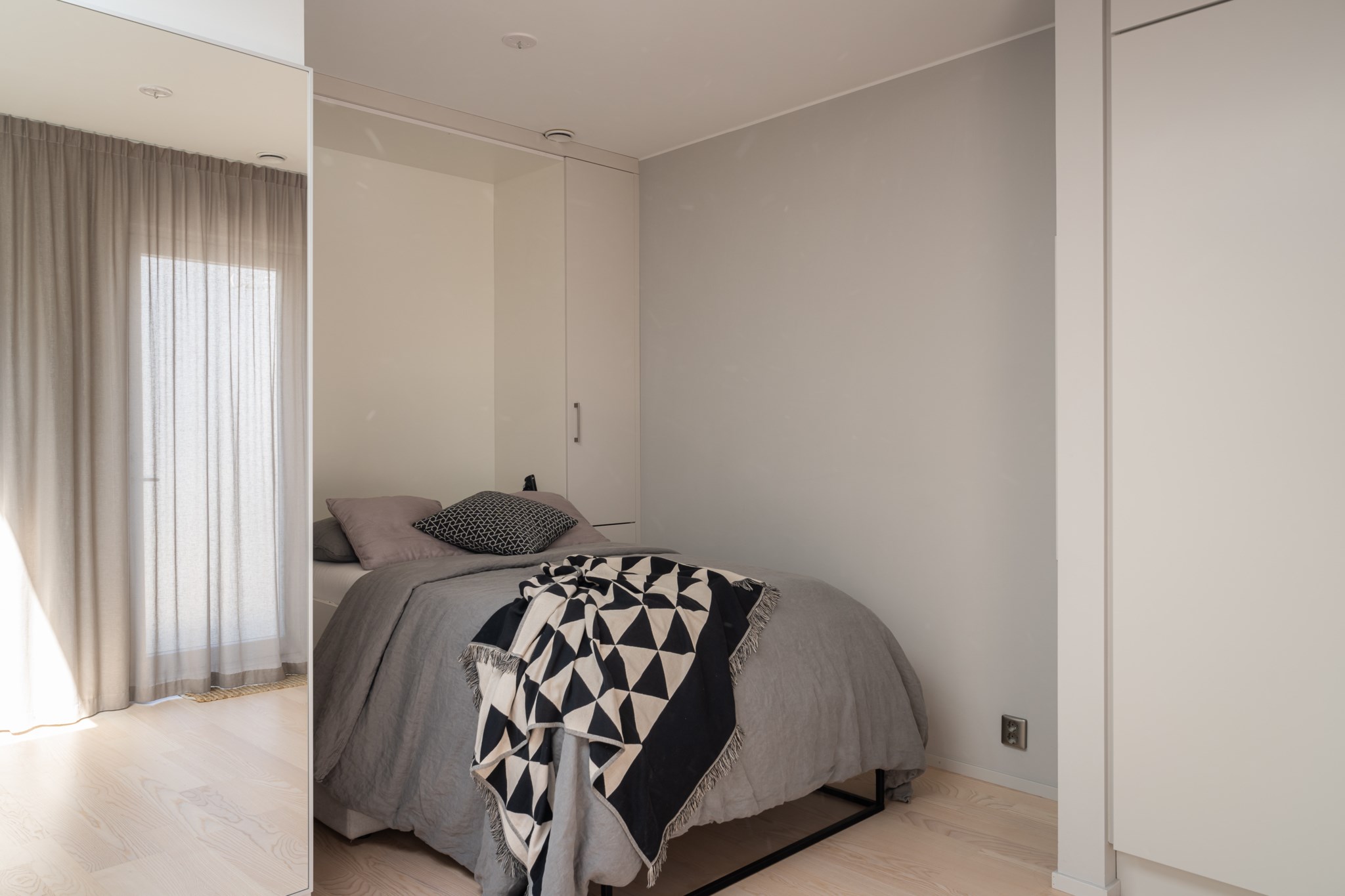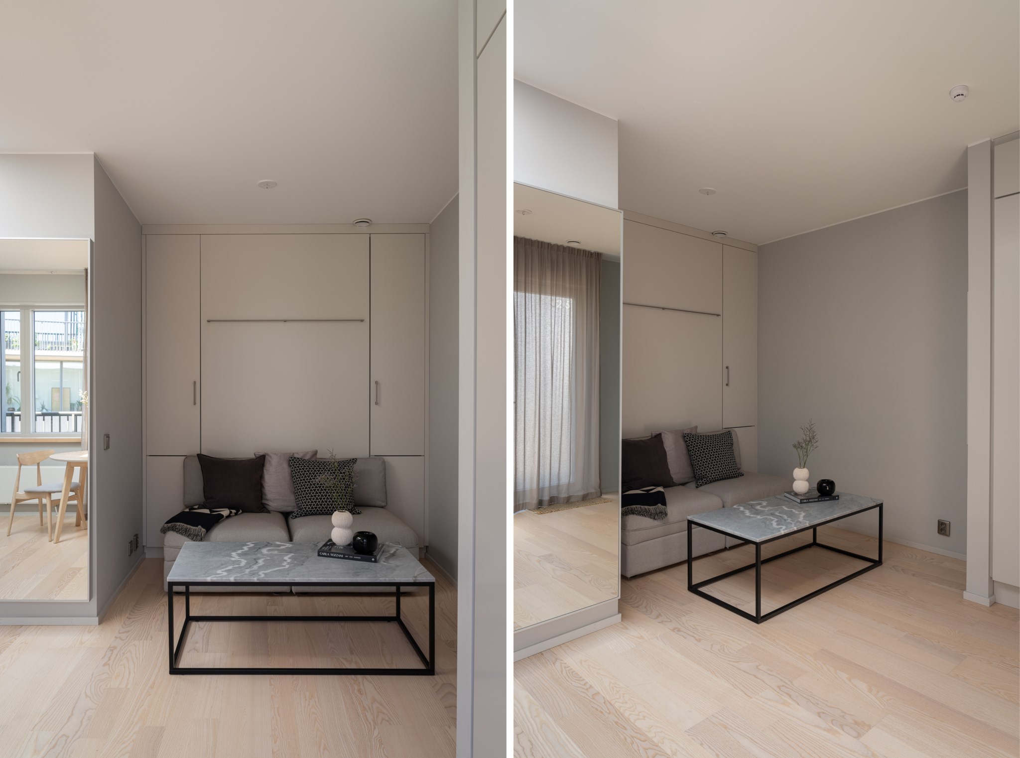 Trivsamt allrum med genomtänkta lösningar för både förvaring och en mindre sovalkov, inredd med skåpsäng som enkelt kan fällas upp och ner för att skapa yta efter behov. Neutralt målade ytskikt och fint vitlaserat tvåstavs golv i ask.