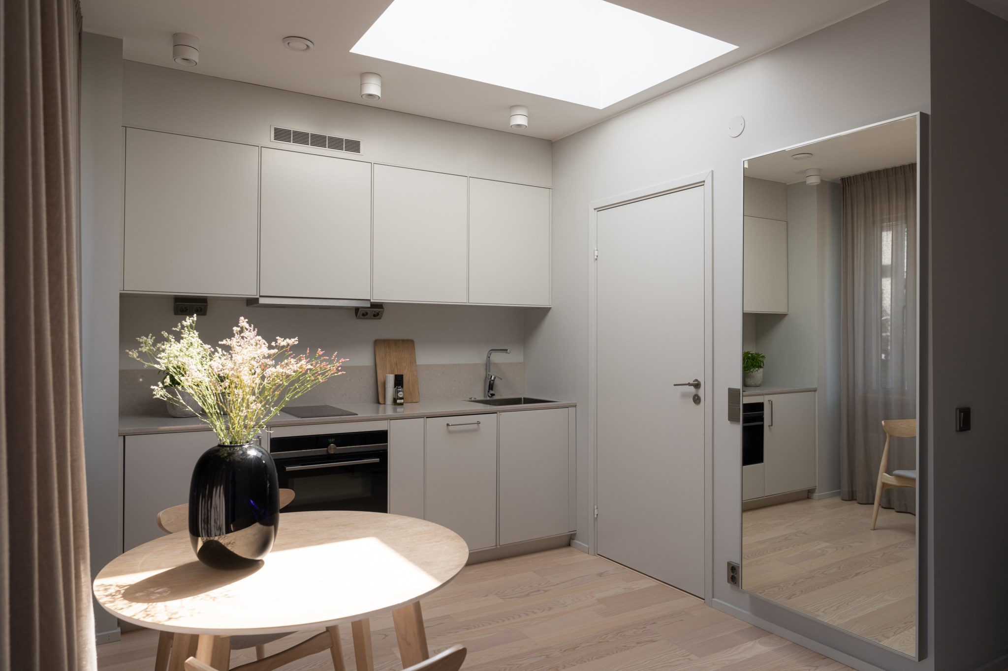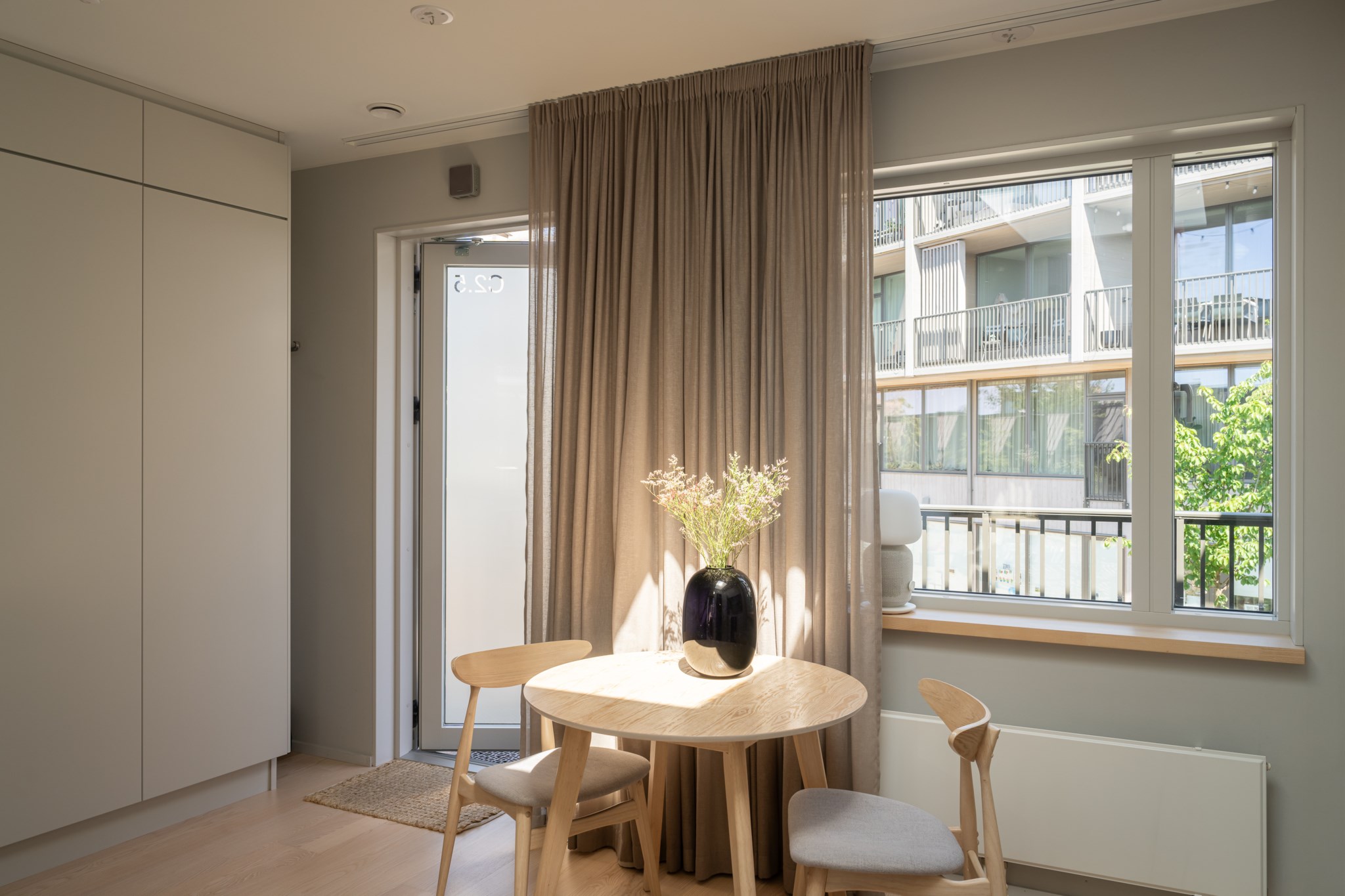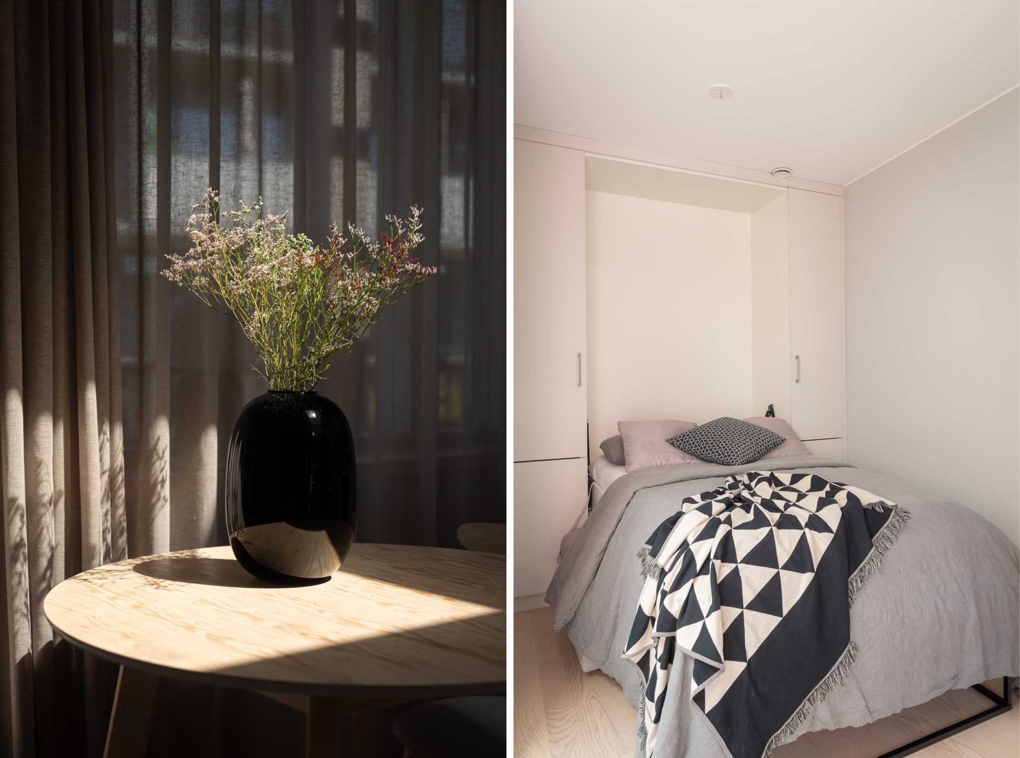 Trivsamt allrum med genomtänkta lösningar för både förvaring och en mindre sovalkov, inredd med skåpsäng som enkelt kan fällas upp och ner för att skapa yta efter behov. Neutralt målade ytskikt och fint vitlaserat tvåstavs golv i ask.