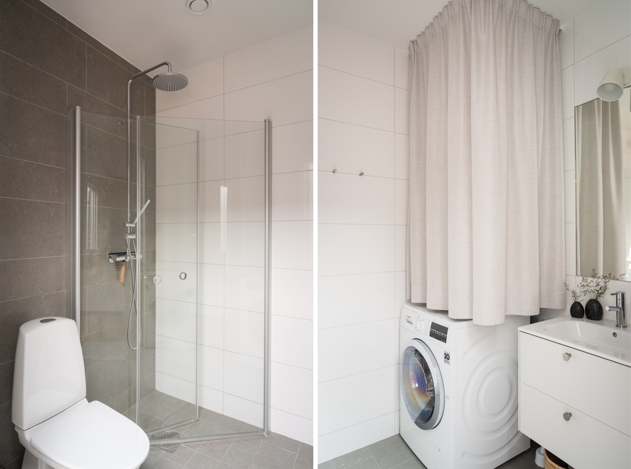 Fräscht badrum med ljust kaklade väggar och grått klinkergolv. Badrummet är inrett med WC, handfat med kommod, spegel, tvättmaskin samt lyxig takdusch med infällbara duschväggar i klarglas.