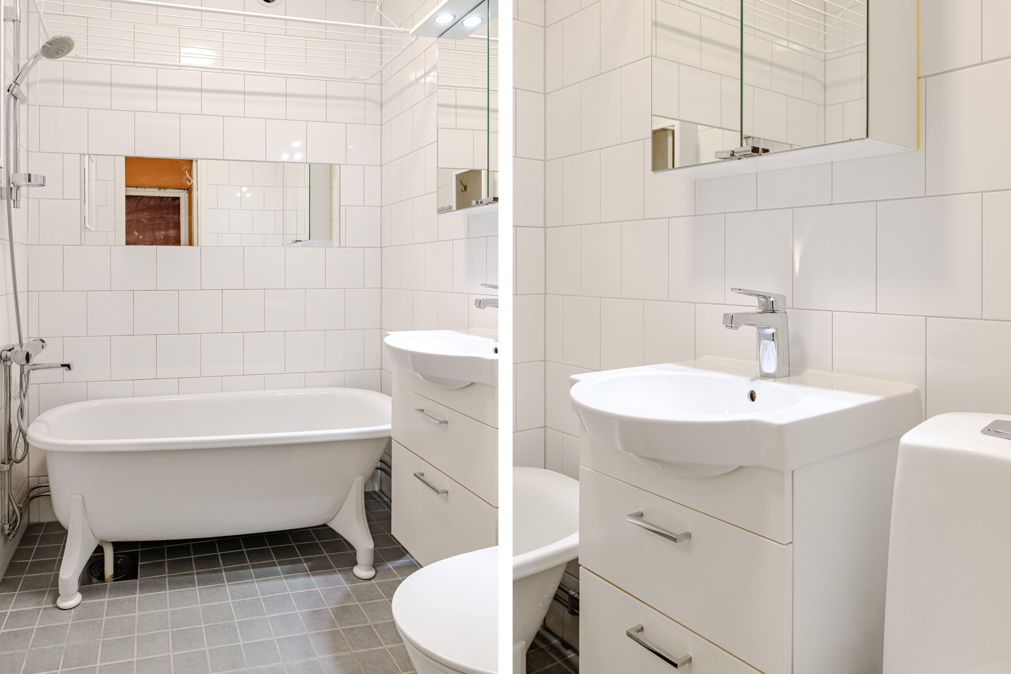 Helkaklat, stambytt badrum inrett med wc, handfat med kommod, spegelskåp samt badkar med dusch.