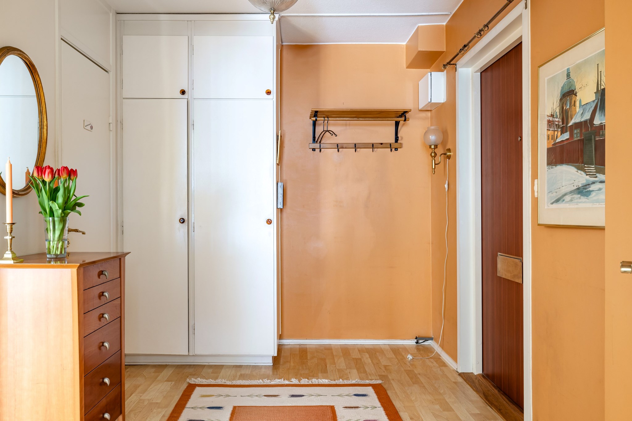 Hall med plats för avhängning av ytterkläder och skor direkt intill ytterdörren. Stängd förvaring finns i garderober.