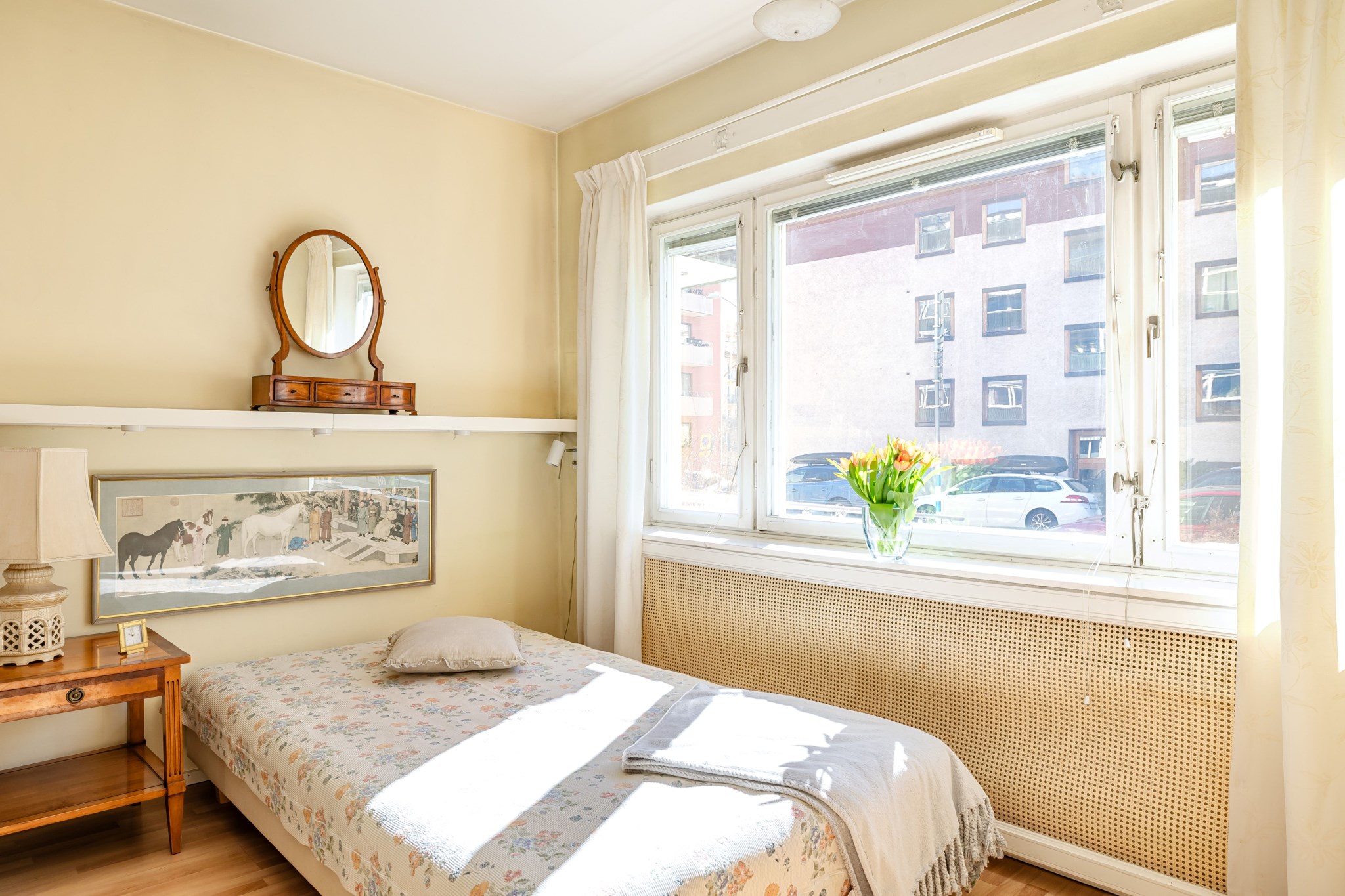 Sovrum med stort fönster som släpper in rikligt med naturligt ljus. Plats för större säng och tillhörande sängbord.