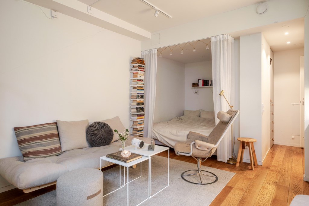 Trivsamt allrum med naturlig plats för både soffgrupp och matbord. Den öppna planlösningen mot köket skapar en social och inbjudande atmosfär, medan en praktisk sovalkov med plats för större säng ger avskildhet. Ljusmålade ytskikt och parkettgolv.