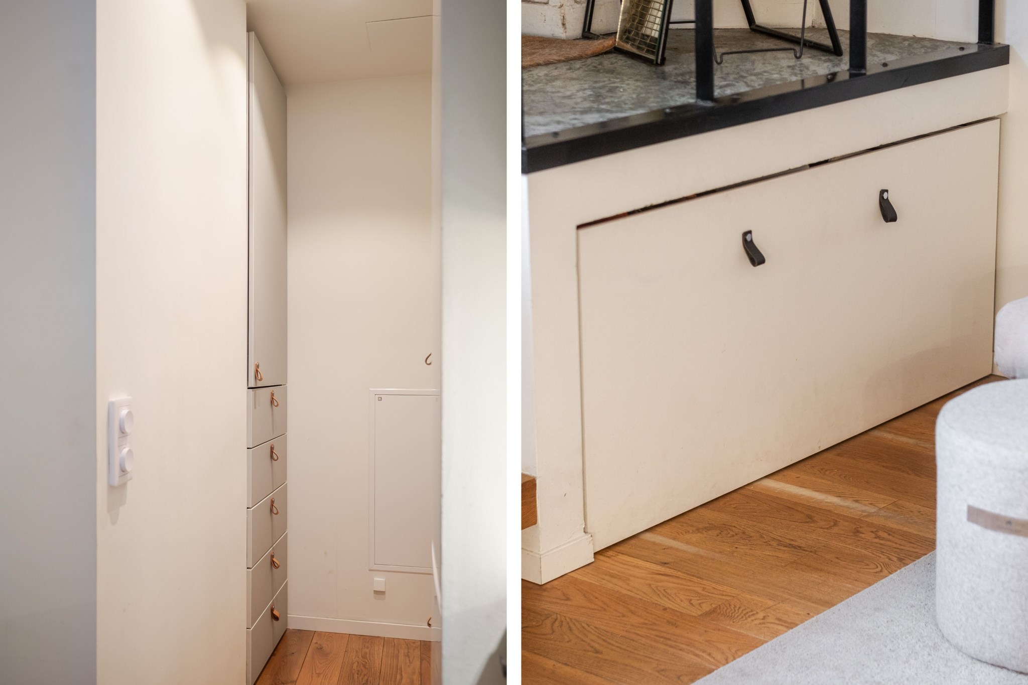 Välkomnande, upphöjd entré med plats för avhängning av ytterkläder och skor. Entrén möter med ljusa väggar och klinkergolv som elegant övergår i genomgående parkettgolv. Trappa ner till allrummet med smart och praktisk förvaring intill.