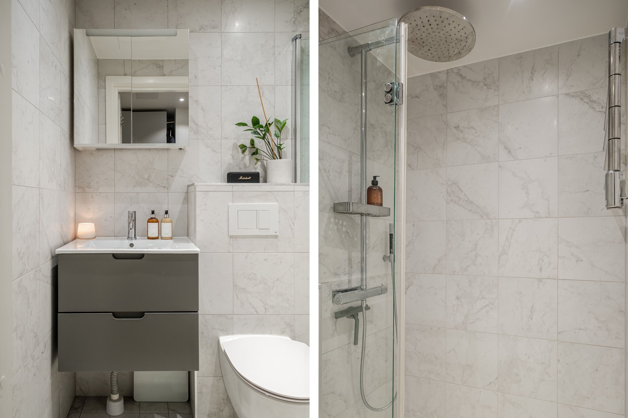 Helkaklat badrum med fina materialval i ljusa kulörer. Badrummet är inrett med vägghängd wc, handfat med kommod och spegelskåp samt en duschhörna med lyxig takdusch och vikbar duschvägg i klarglas.