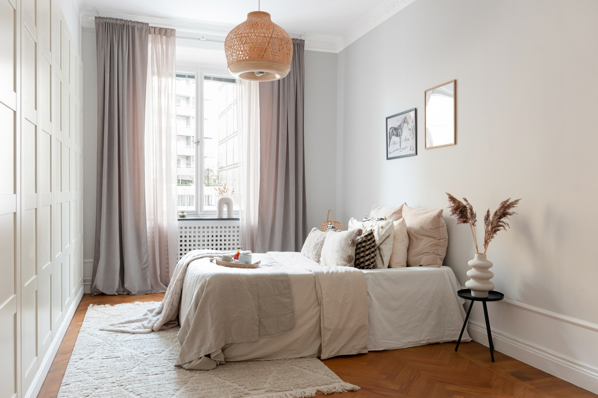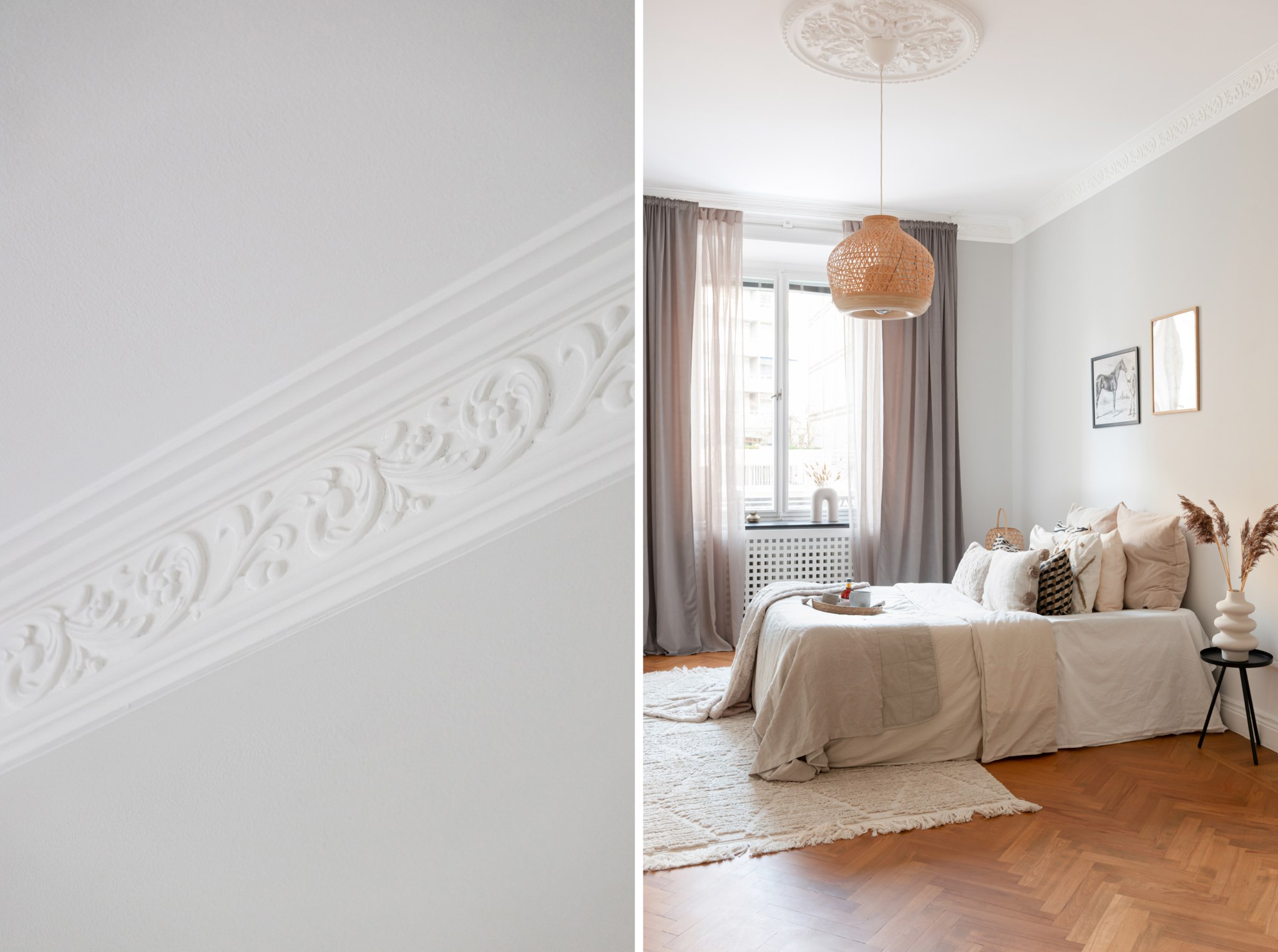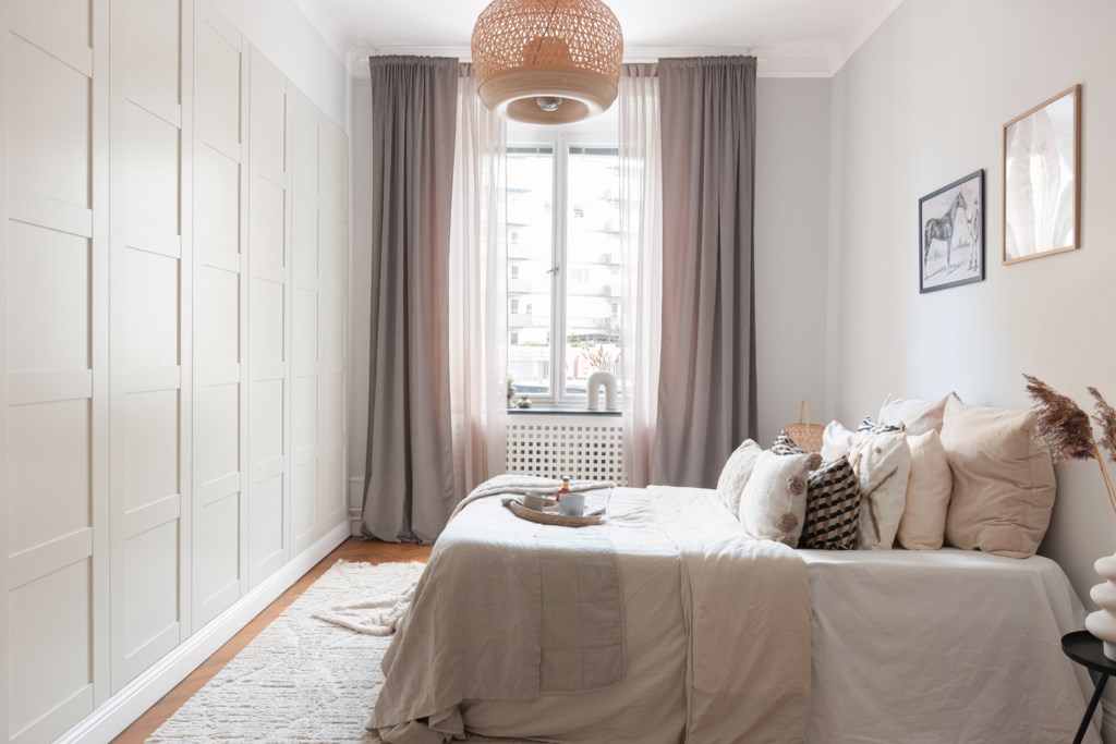 Trivsamt sovrum med smakfulla ytskikt bestående av väggar i en grå nyans och fiskbensparkett. Här inryms säng och sängbord. Generöst med förvaringsmöjligheter via garderober. Ett härligt ljusinsläpp tar sig in via stort fönster. Taket pryds av vackra stuckaturer.
