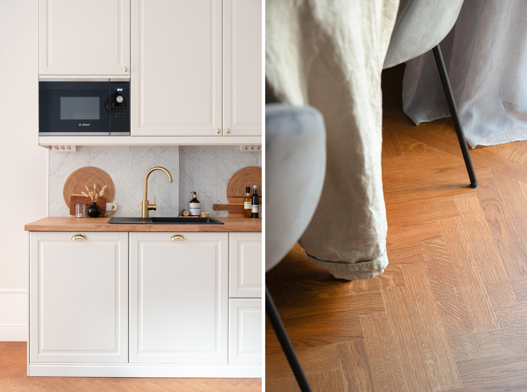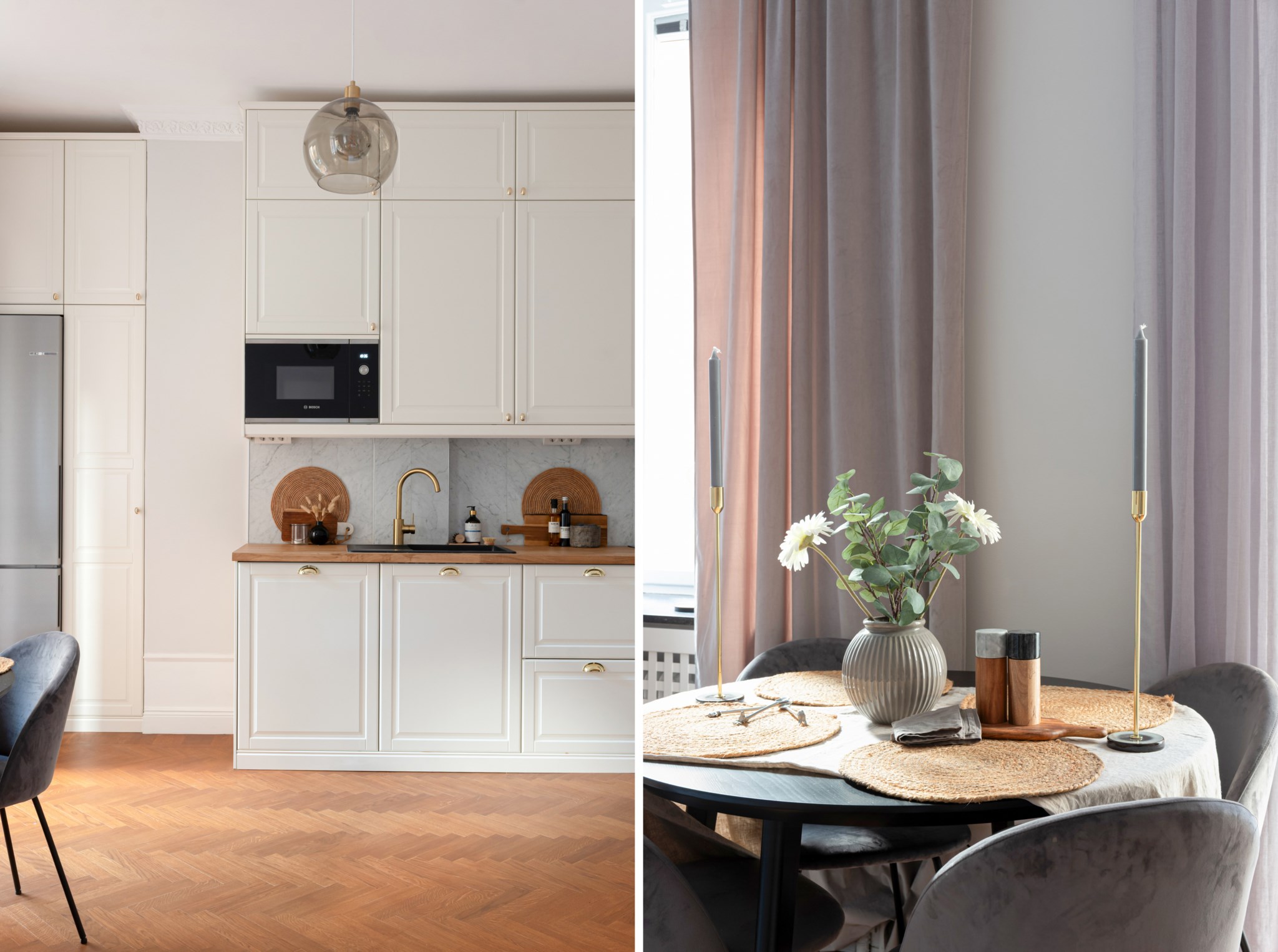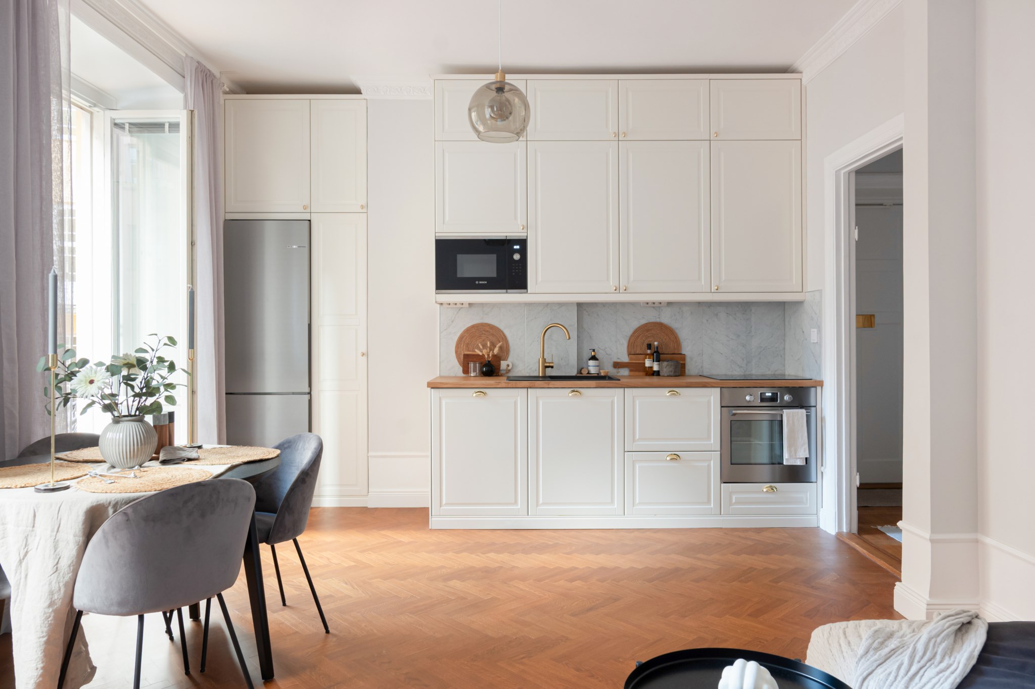 Smakfulla och moderna naturmaterial bestående av köksluckor i vitt, handtag och blandare i mässing och en bänkskiva i ek. I köket finns ett stilrent stänkskydd i naturlig marmor. Köket är utrustat med bland annat vitvaror från Bosch och Siemens bestående av diskho, induktionshäll, köksfläkt, ugn, mikro, diskmaskin samt kyl och frys. Ytskikten består av ljusa väggar i en grå nyans och fiskbensparkett. Här finns även plats för en matgrupp. Ett härligt ljusinsläpp tar sig in via stort fönster. Taket pryds av vackra stuckaturer.