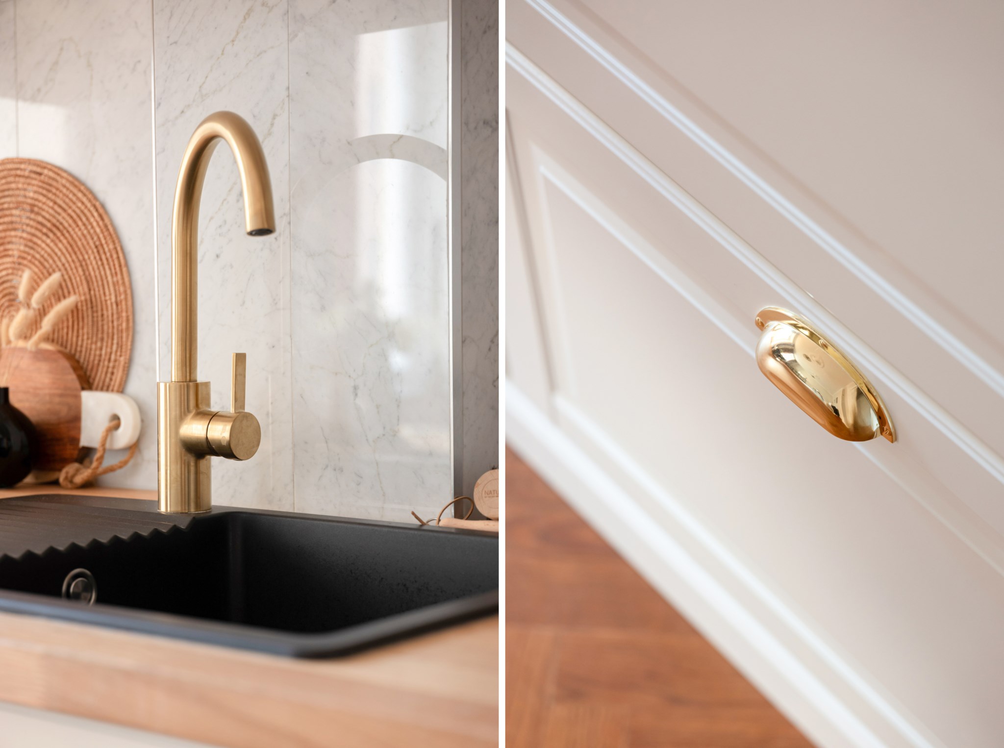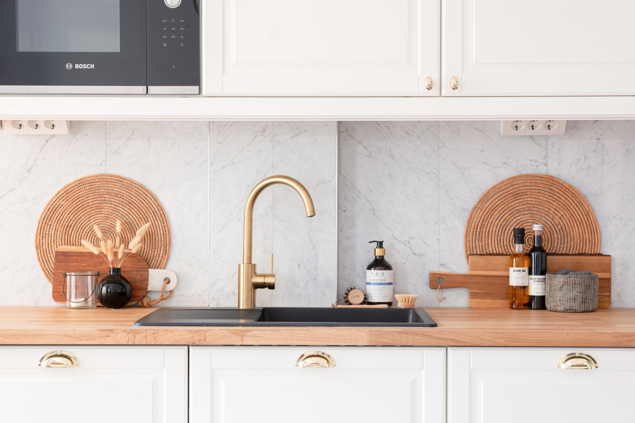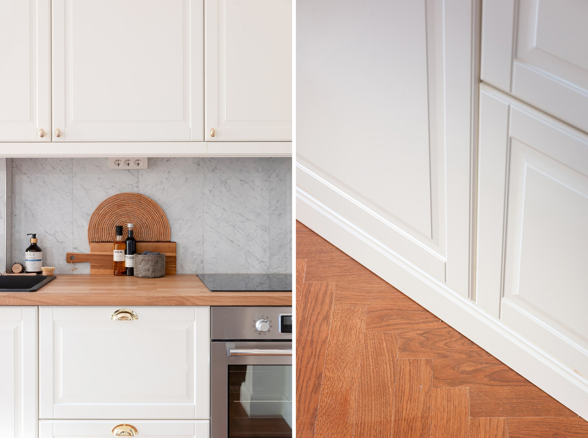 Smakfulla och moderna naturmaterial bestående av köksluckor i vitt, handtag och blandare i mässing och en bänkskiva i ek. I köket finns ett stilrent stänkskydd i naturlig marmor. Köket är utrustat med bland annat vitvaror från Bosch och Siemens bestående av diskho, induktionshäll, köksfläkt, ugn, mikro, diskmaskin samt kyl och frys. Ytskikten består av ljusa väggar i en grå nyans och fiskbensparkett. Här finns även plats för en matgrupp. Ett härligt ljusinsläpp tar sig in via stort fönster. Taket pryds av vackra stuckaturer.
