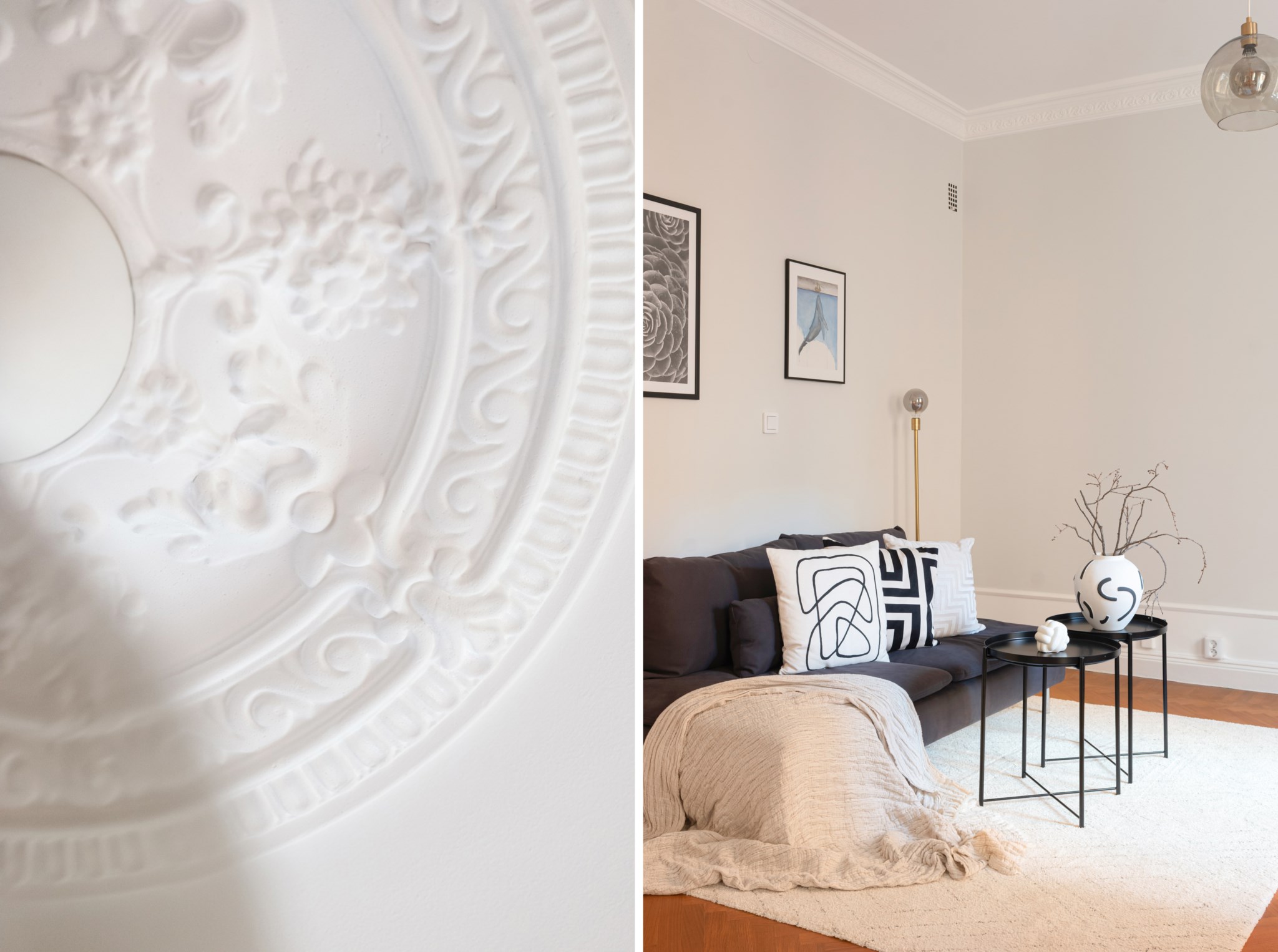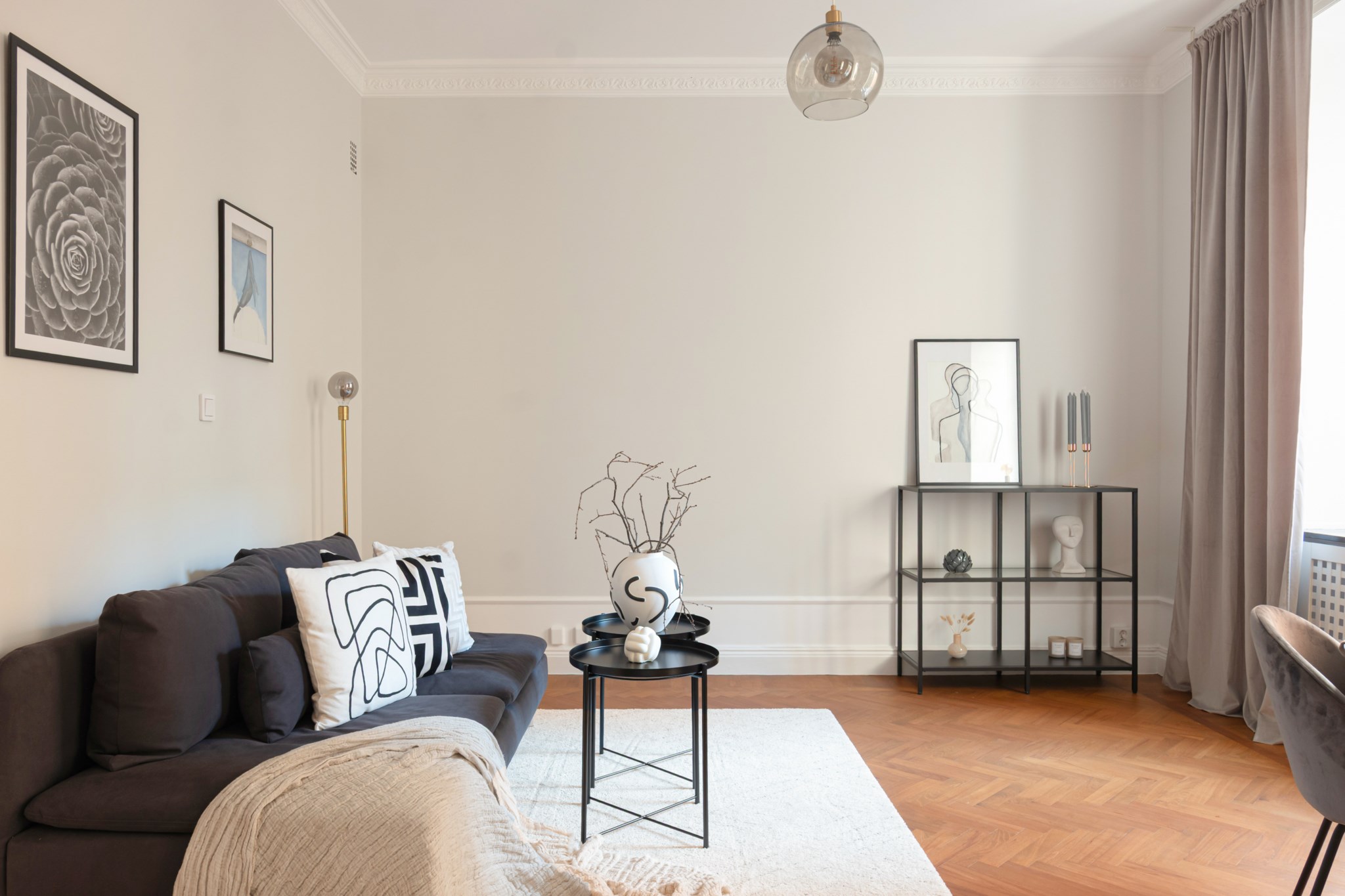 Luftigt vardagsrum med plats för matplats, soffa, soffbord, och annat möblemang efter smak och behov. Ytskikten består av ljusa väggar i en grå nyans och fiskbensparkett. Ett härligt ljusinsläpp tar sig in via stort fönster. Taket pryds av vackra stuckaturer.