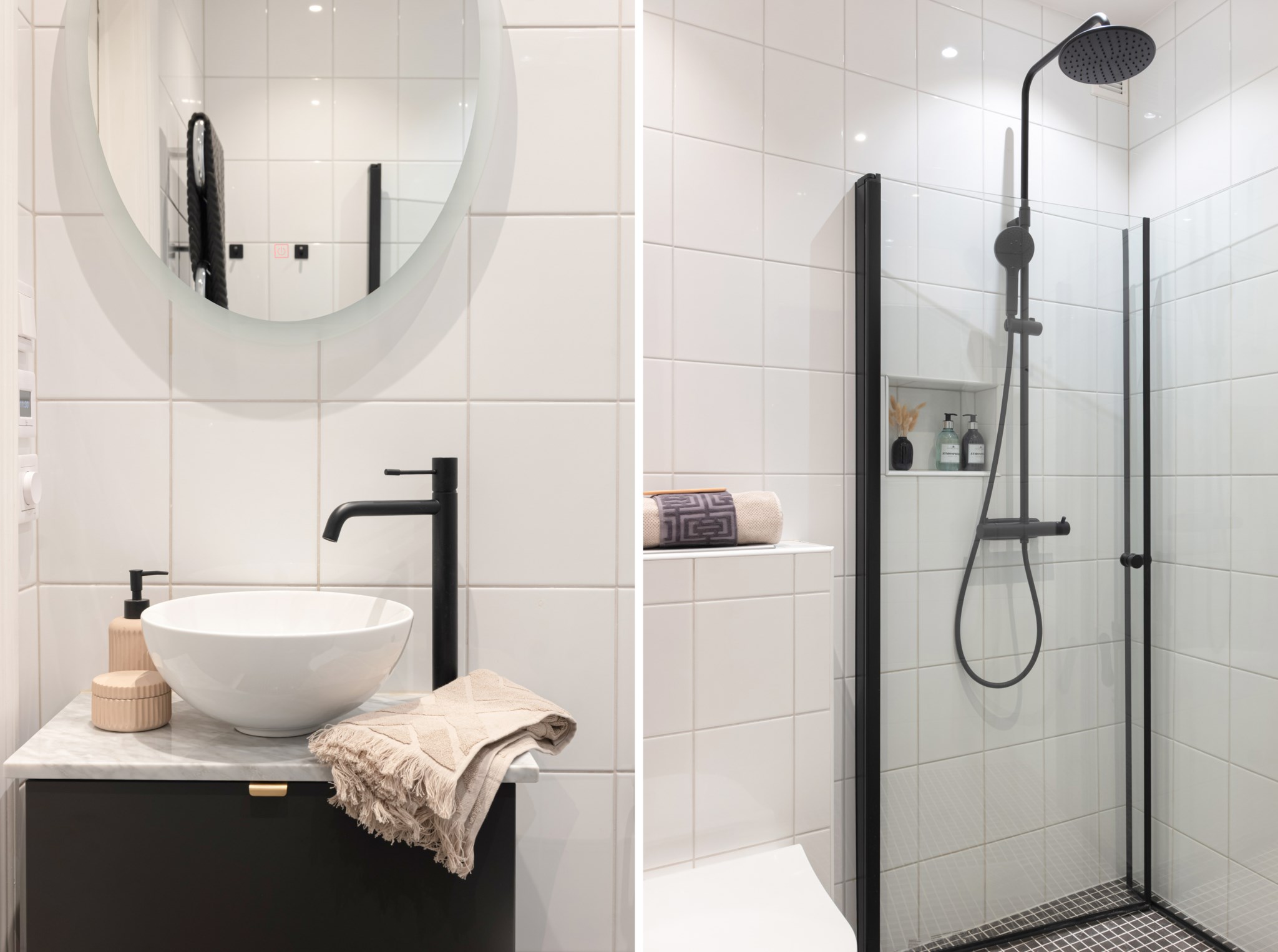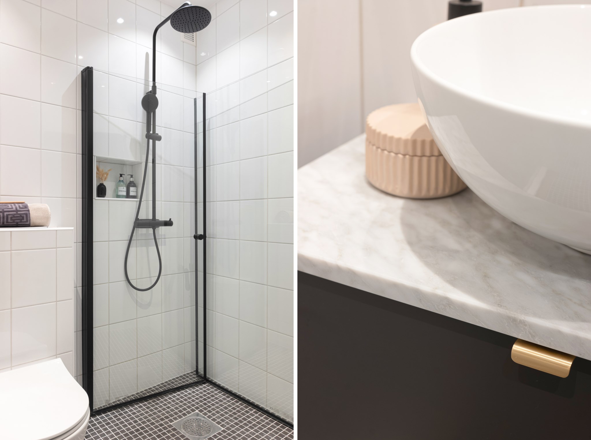 Helkaklat badrum med vitt kakel och klinker i mosaik. Badrummet är utrustat med gollvärme, vägghängd WC, spotlights i taket, kommod med skål-handfat och bänkskiva av naturlig marmor, spegel med belysning, handdukstork, tak dusch med glasväggar.