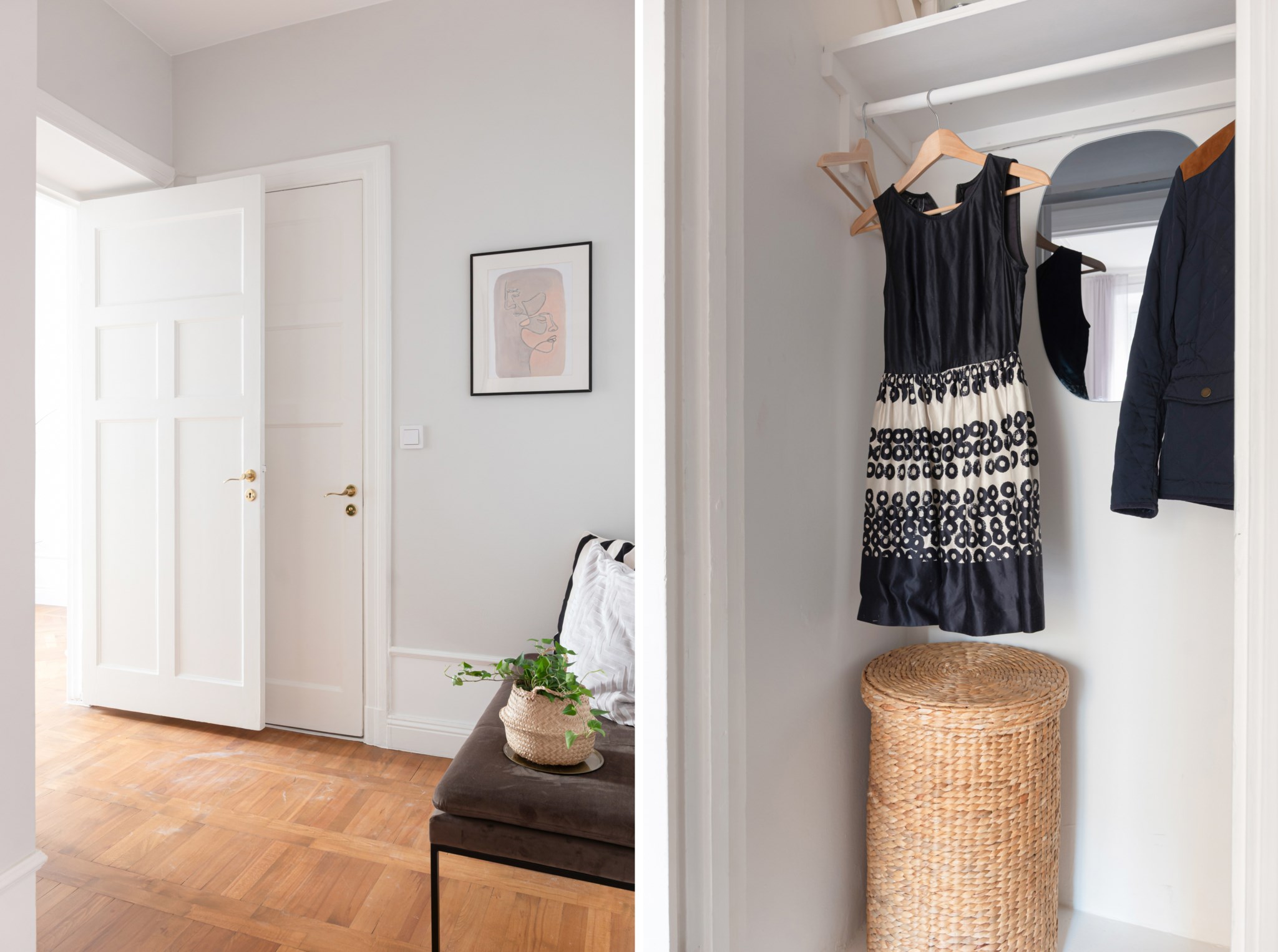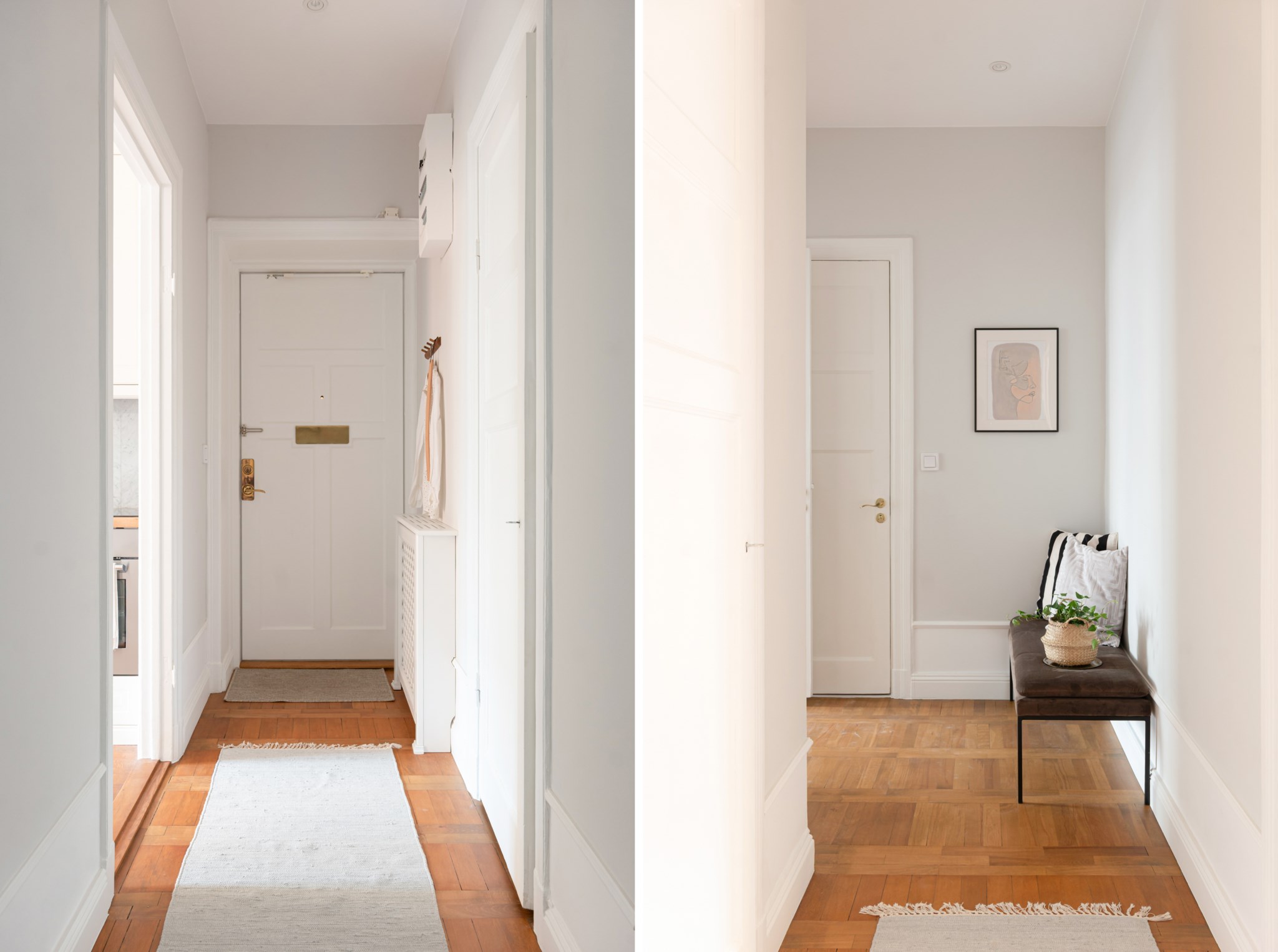 Välkomnande hall med plats för avhängning och mindre avlastningsmöblemang efter smak och behov. I hallen finns förvaring via en klädkammare. Ytskikten består av ljusa väggar i en grå nyans och ljust trägolv.