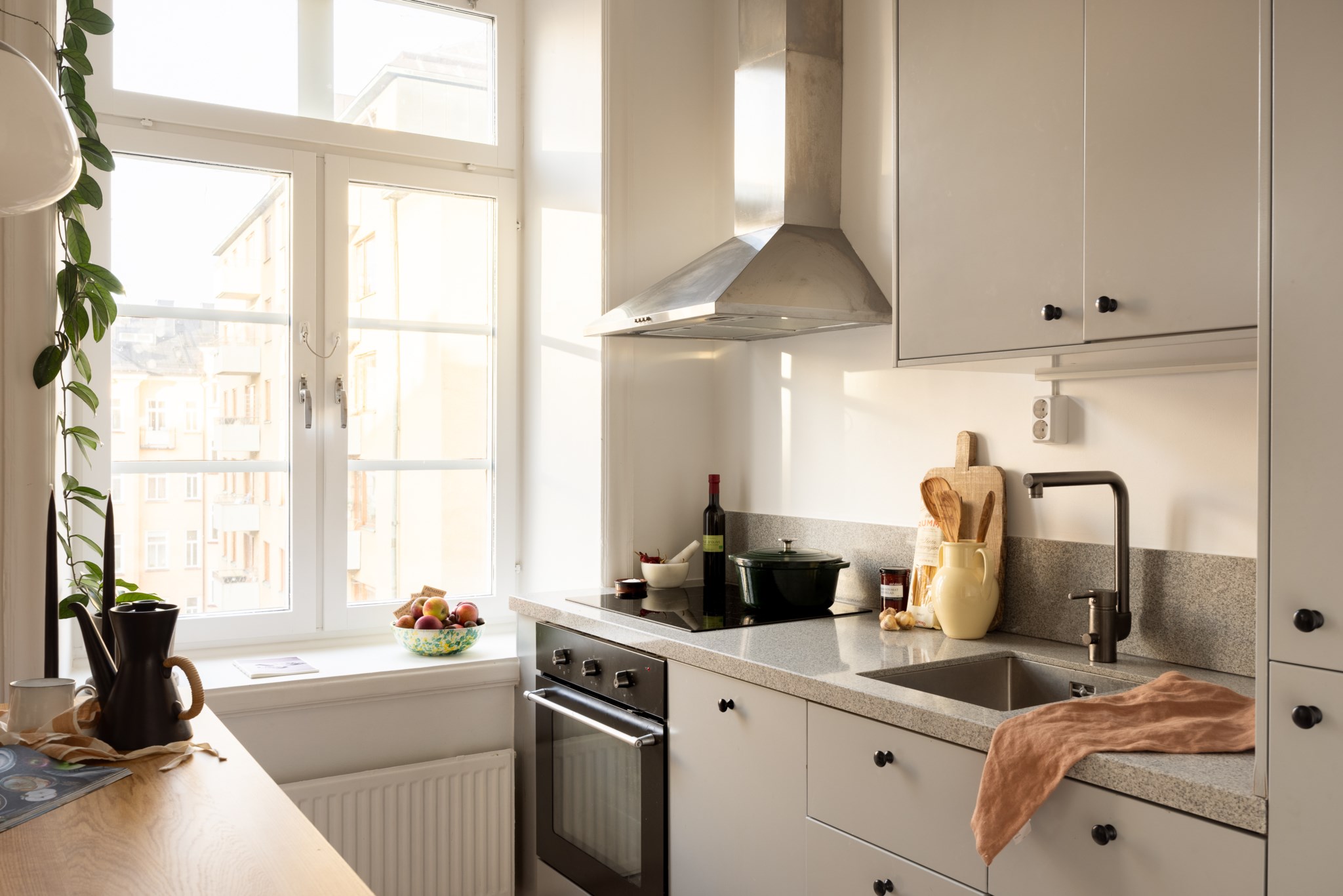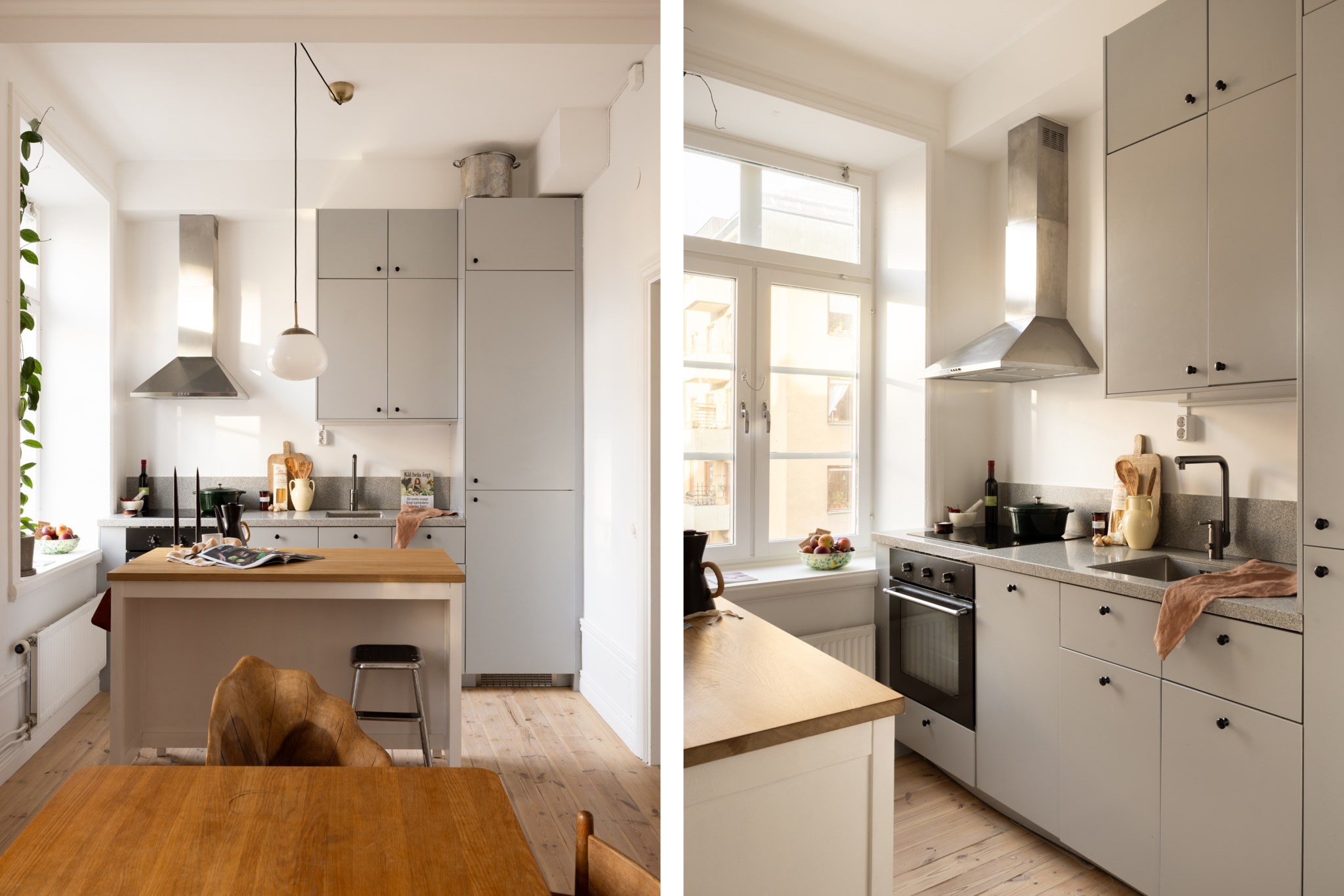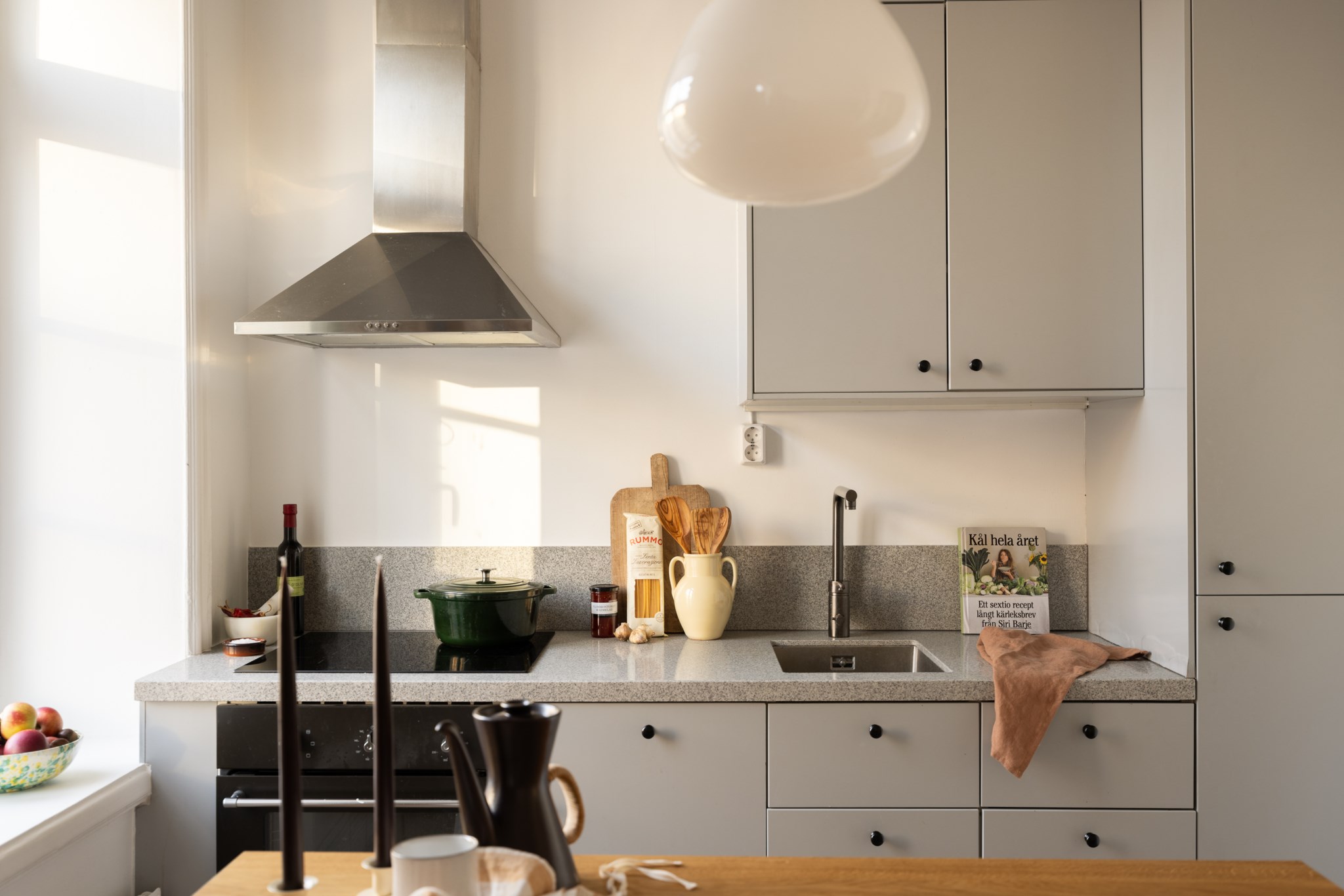 Socialt beläget kök med tidlösa materialval bestående av vita köksluckor i grå nyans och ljus bänkskiva. Den maskinella utrustningen består av diskho, häll, fläkt, ugn, diskmaskin samt kyl och frys. Ytskikten består av ljusa väggar och ljust golv. Här finns även en praktisk köksö och ett stort fönster med spröjs som bidrar till ett härligt ljusflöde.