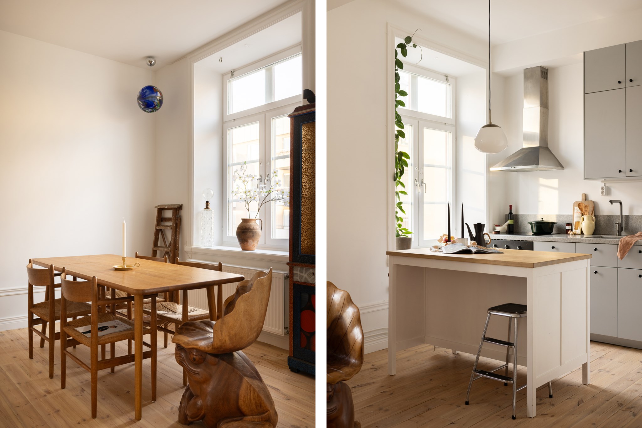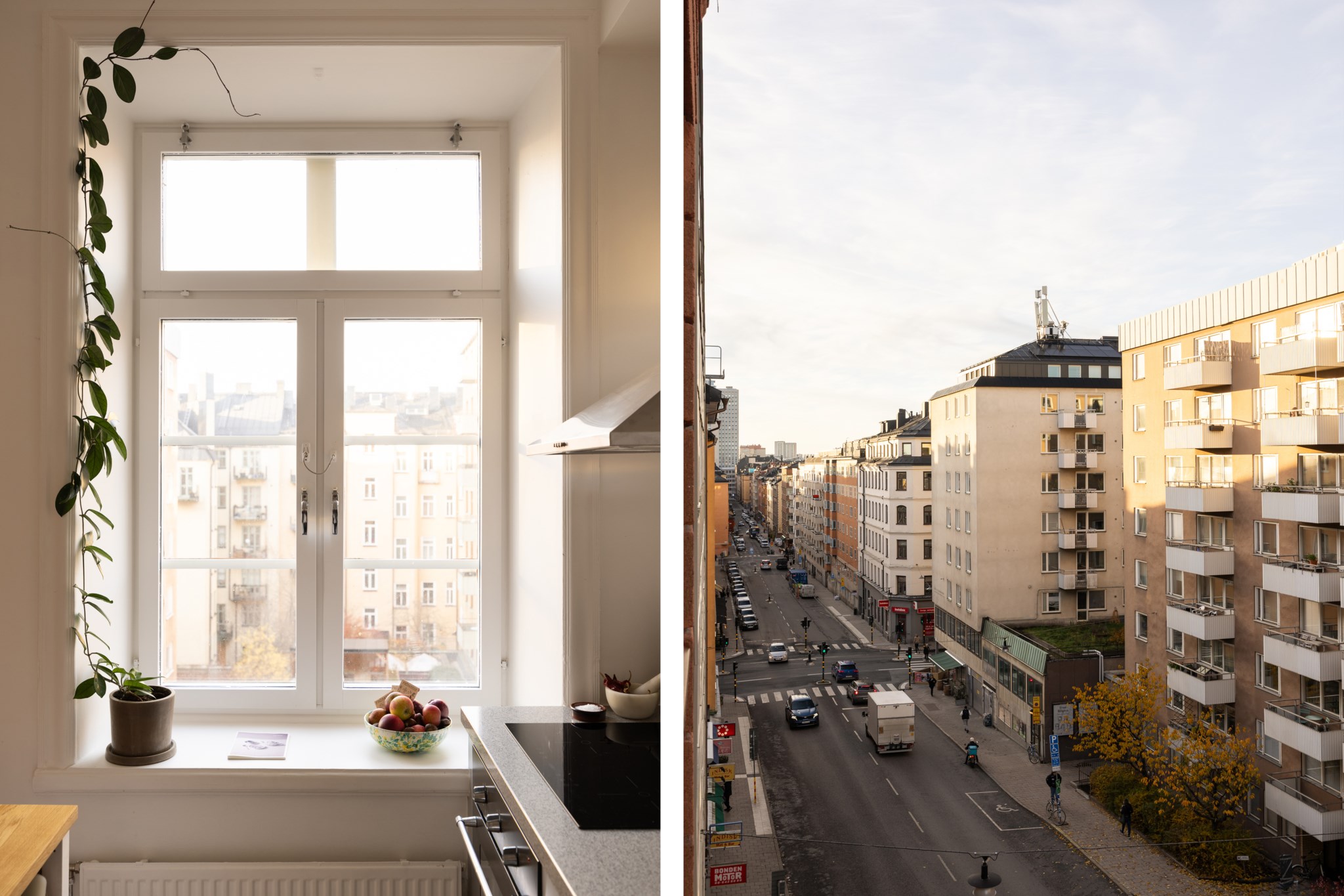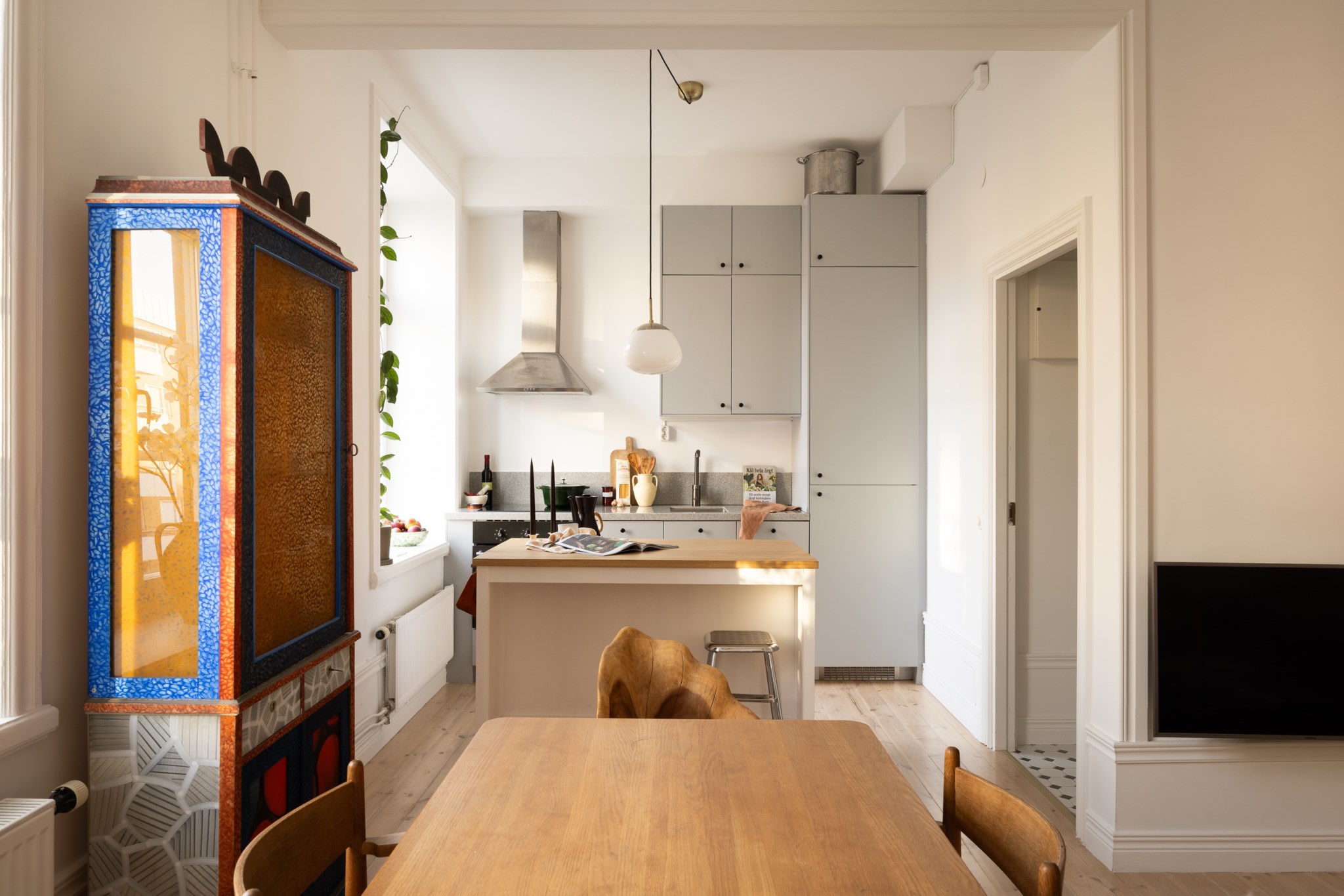Socialt beläget kök med tidlösa materialval bestående av vita köksluckor i grå nyans och ljus bänkskiva. Den maskinella utrustningen består av diskho, häll, fläkt, ugn, diskmaskin samt kyl och frys. Ytskikten består av ljusa väggar och ljust golv. Här finns även en praktisk köksö och ett stort fönster med spröjs som bidrar till ett härligt ljusflöde.