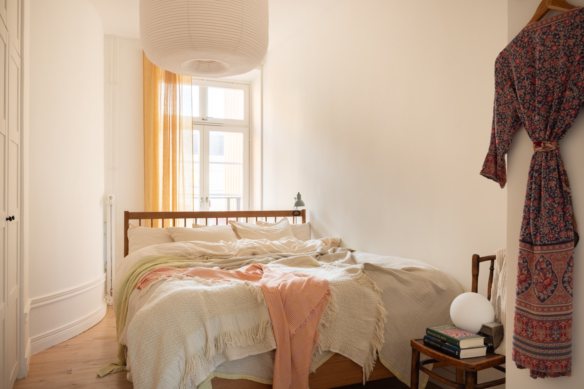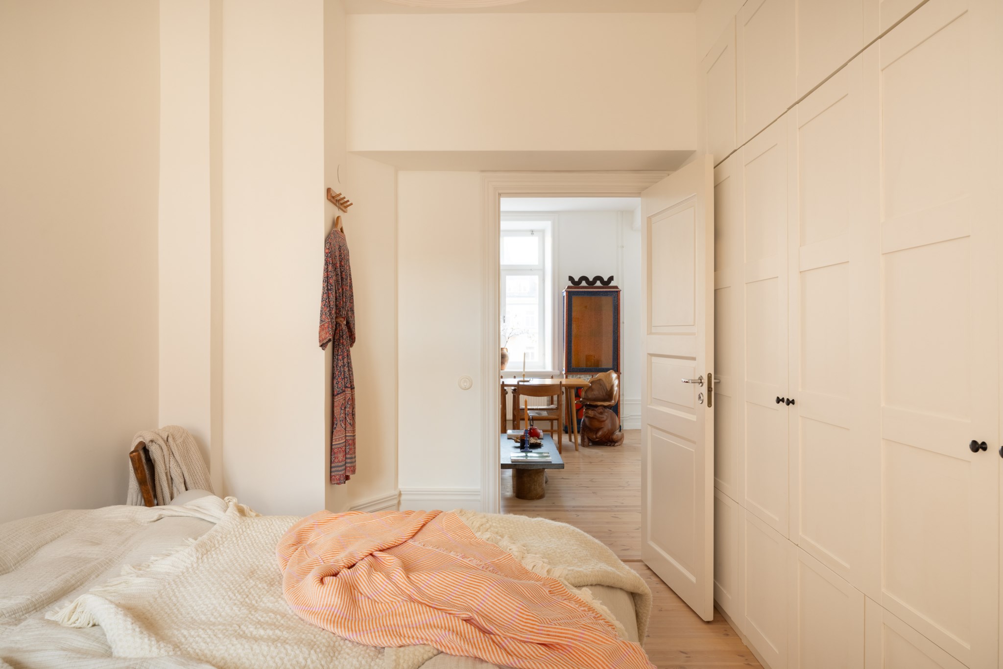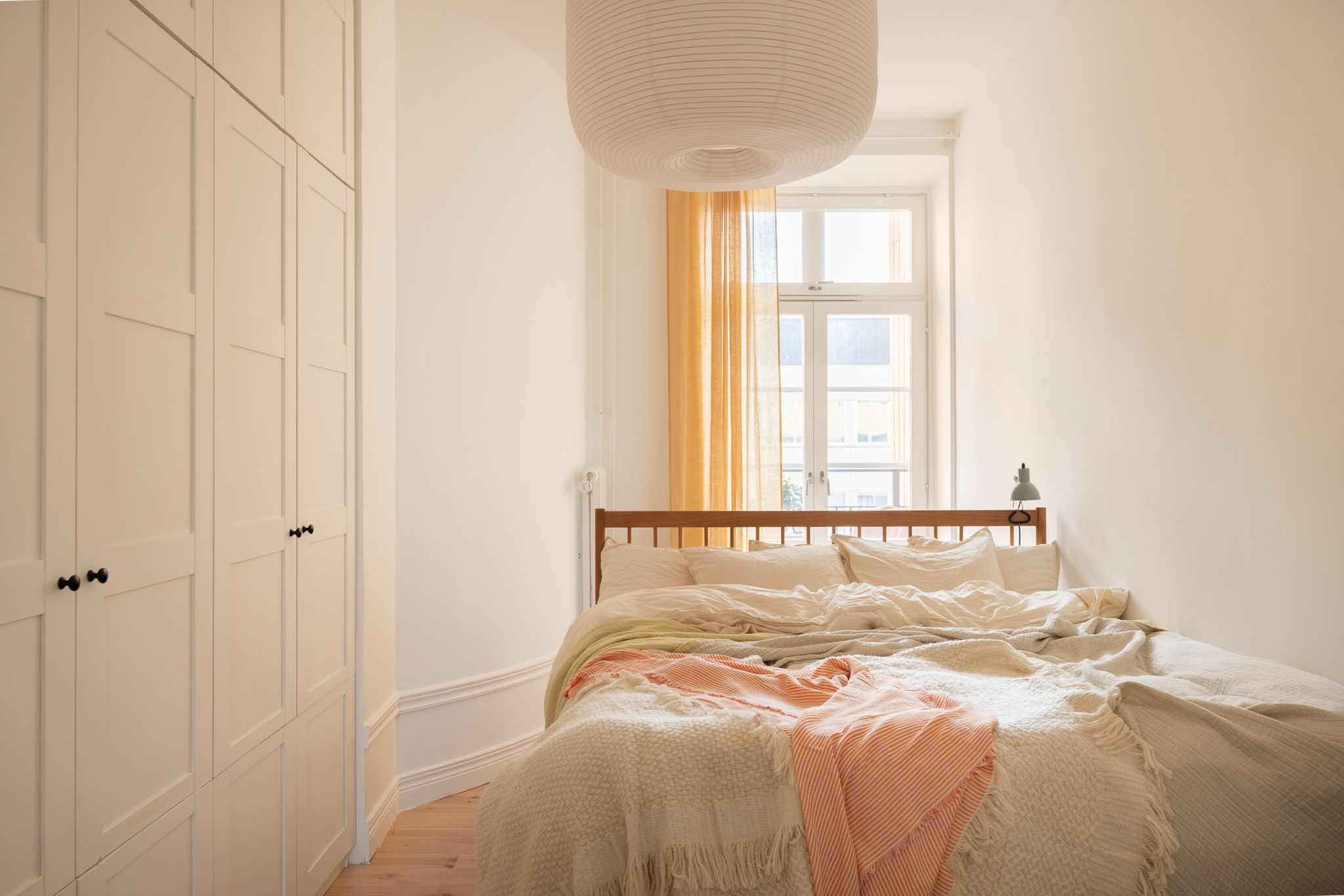 Rymligt sovrum med plats för dubbelsäng, sängbord och annat möblemang efter smak och behov. Här finns även generöst med förvaringsmöjligheter via garderober. Ytskikten består av ljusa väggar och ljust golv med höga golvsocklar. Ett härligt ljusinsläpp tar sig in via ett stort fönster.