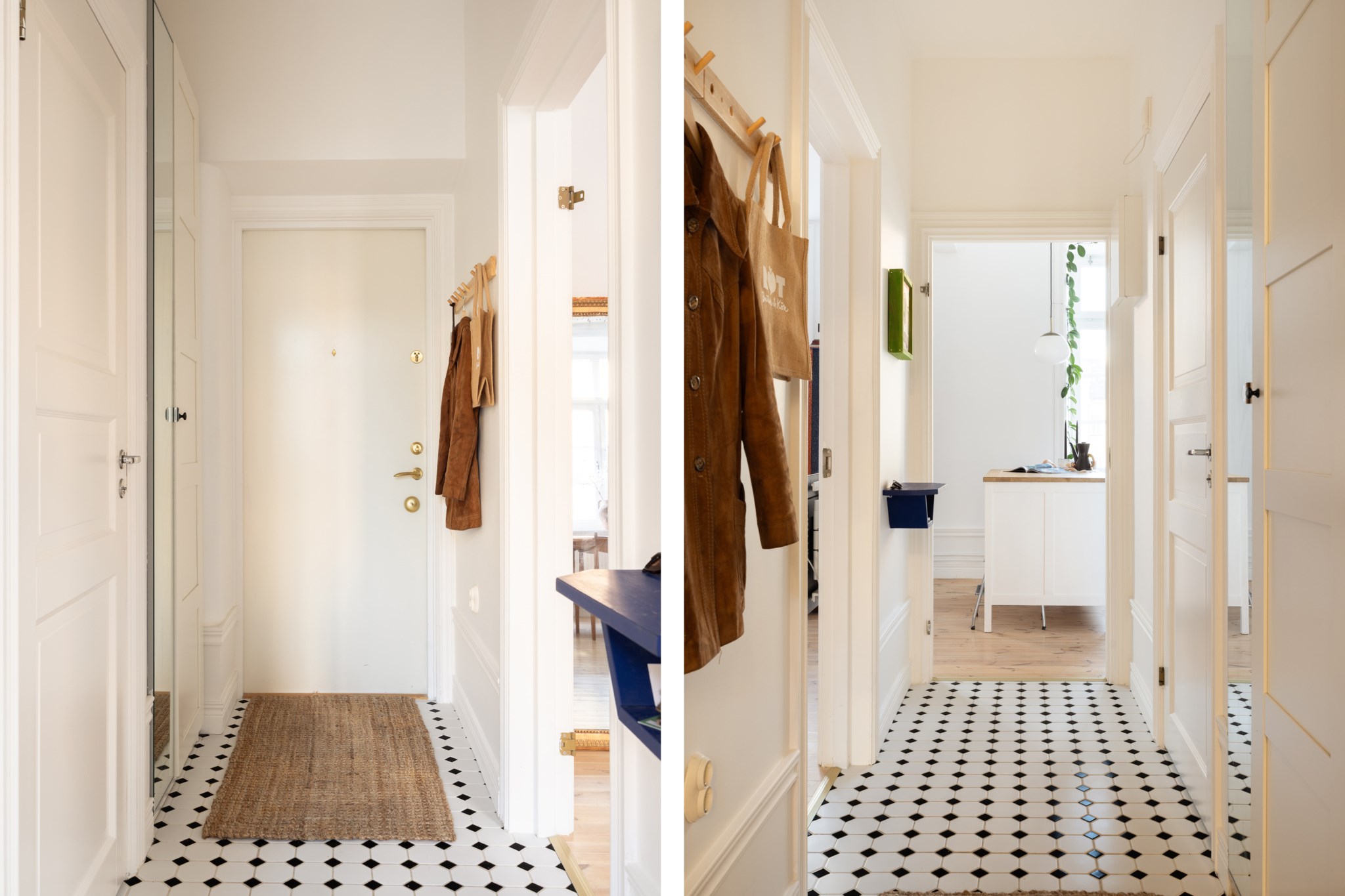 Välkomnande hall med plats för avhängning och skoställ. Här finns även generöst med förvaringsmöjligheter via garderob. Ytskikt bestående av ljusa väggar och praktiskt klinkergolv i vit och svart.