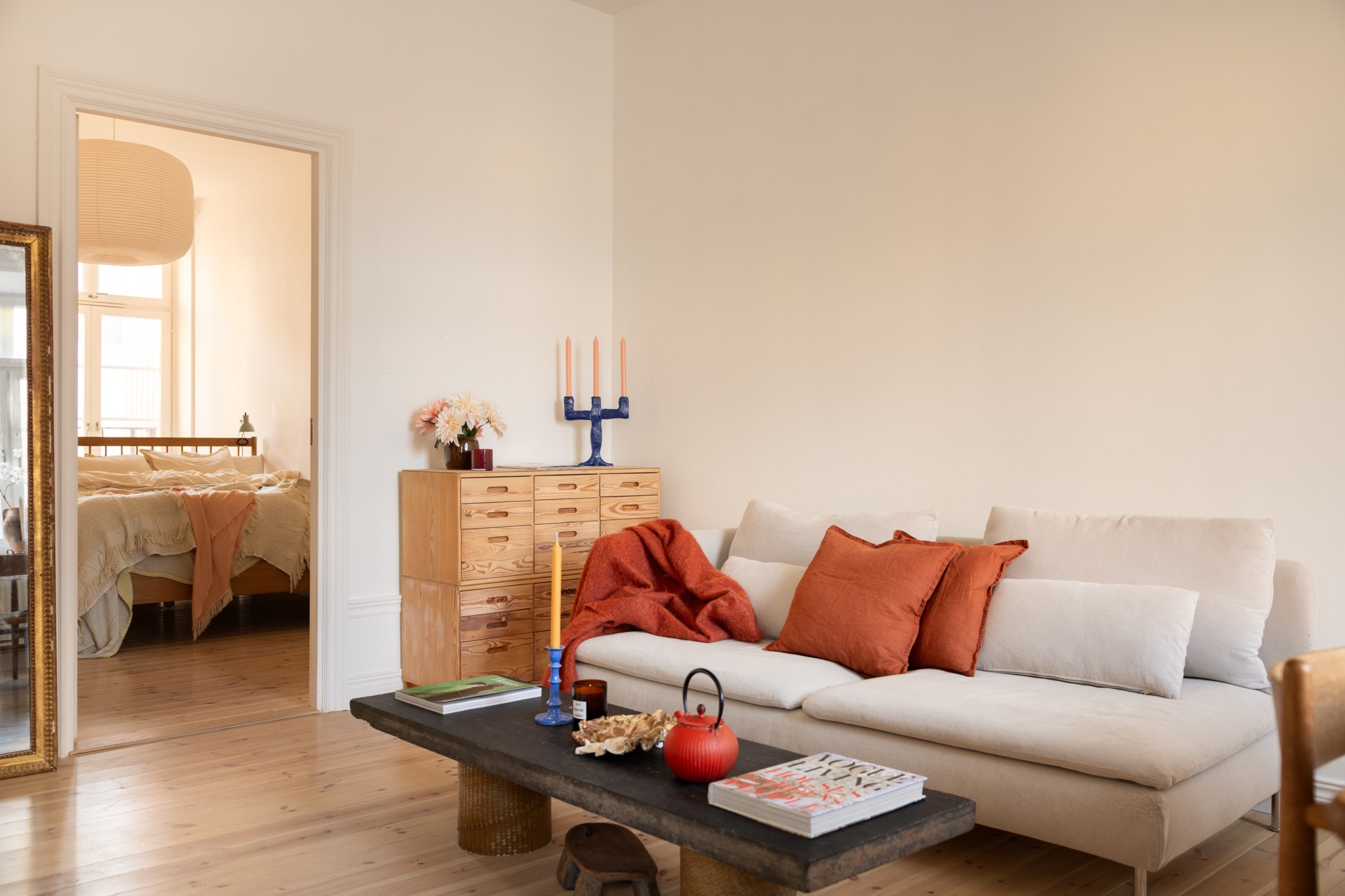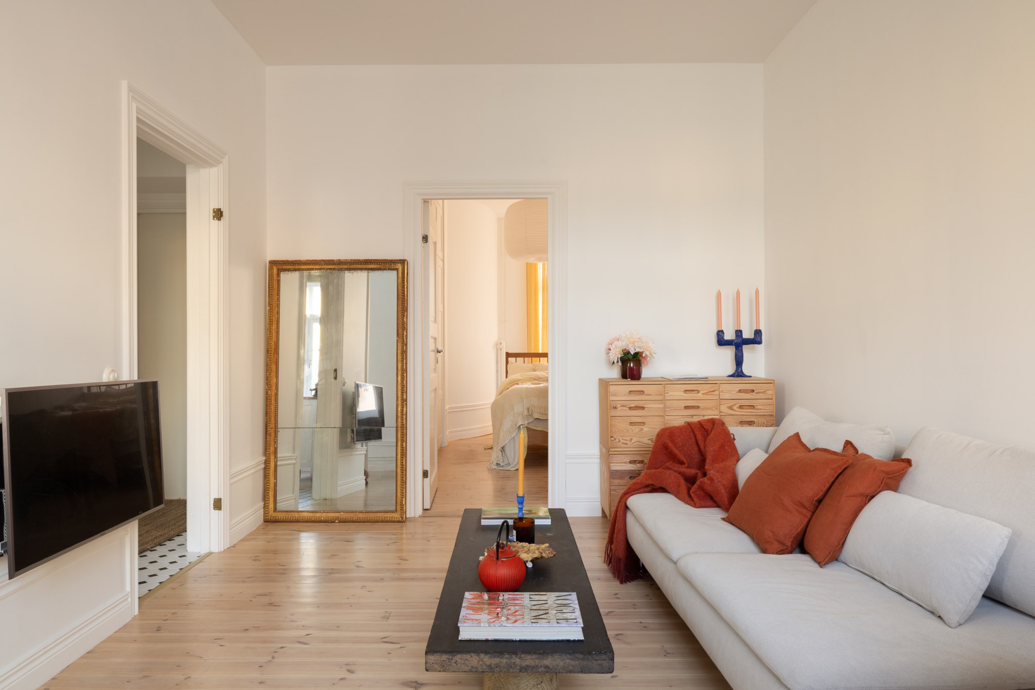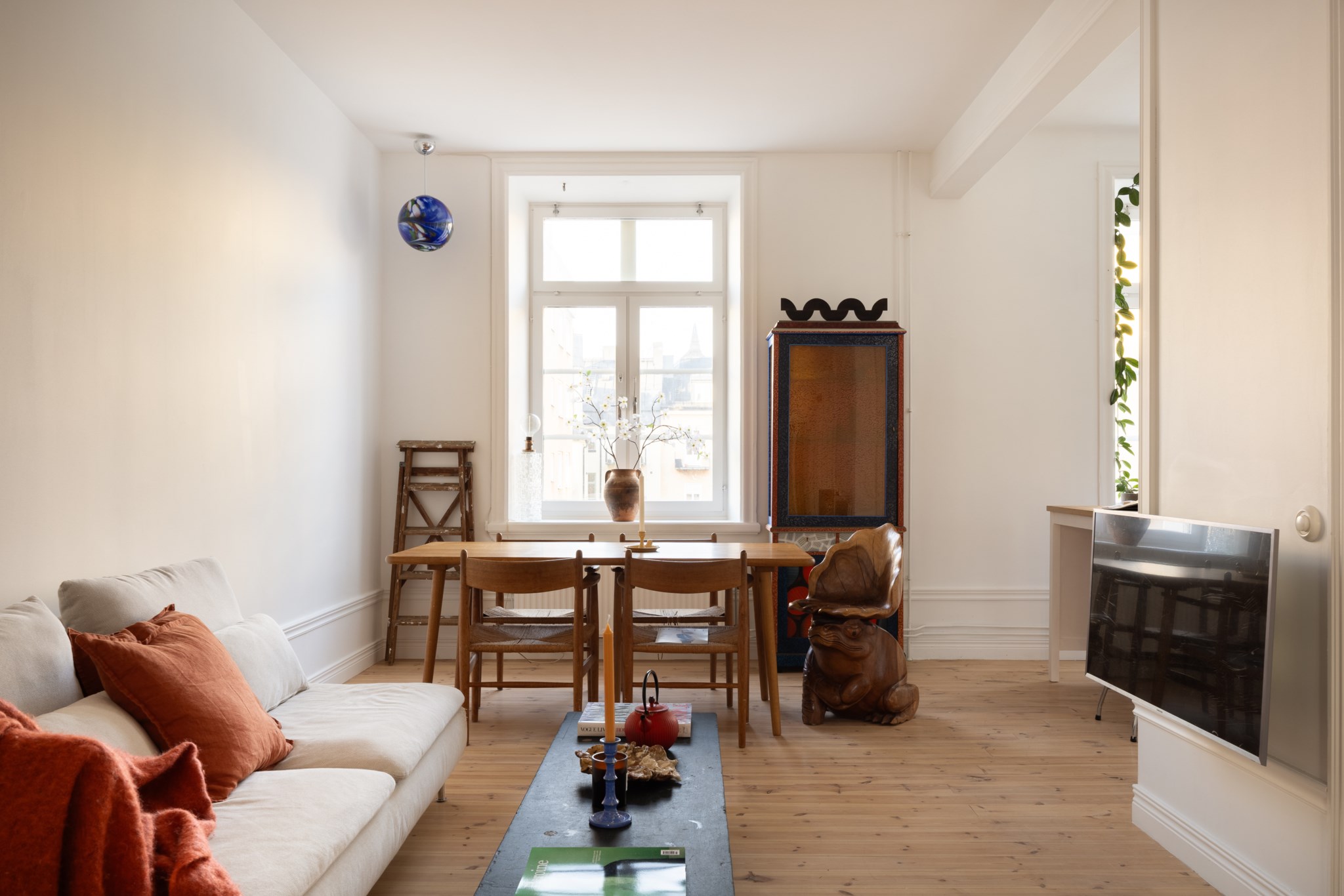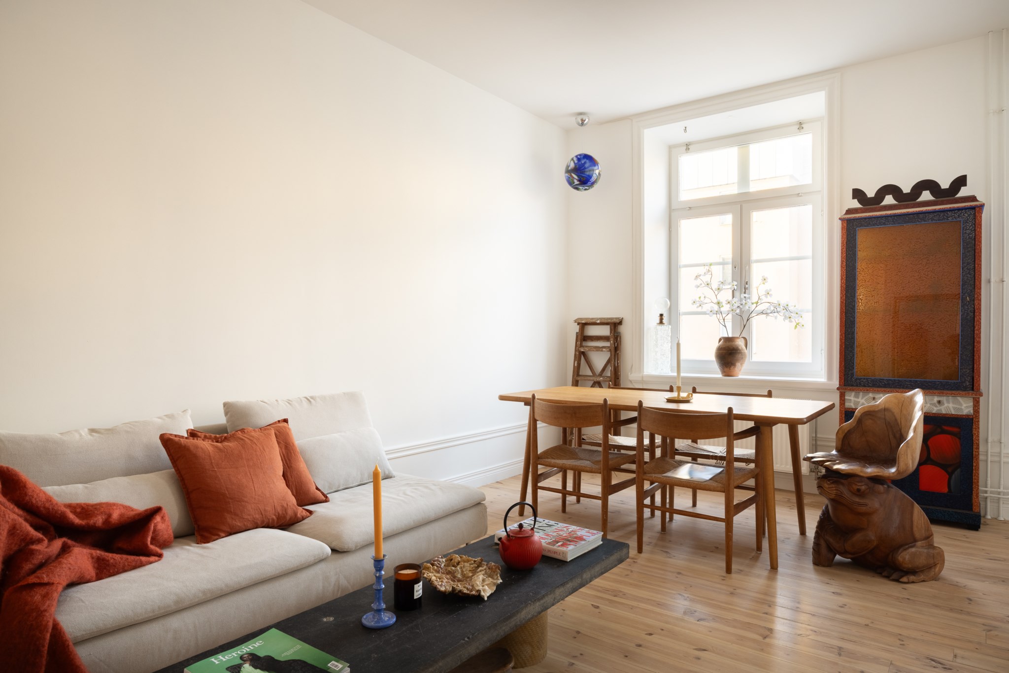 Luftigt vardagsrum med gott om plats för soffa, TV-möbel, matplats och annat möblemang efter smak och behov. Ytskikten består av ljusa väggar och ljust golv med höga golvsocklar. I vardagsrummet möts du av ett härligt ljusinsläpp via ett stort fönster.