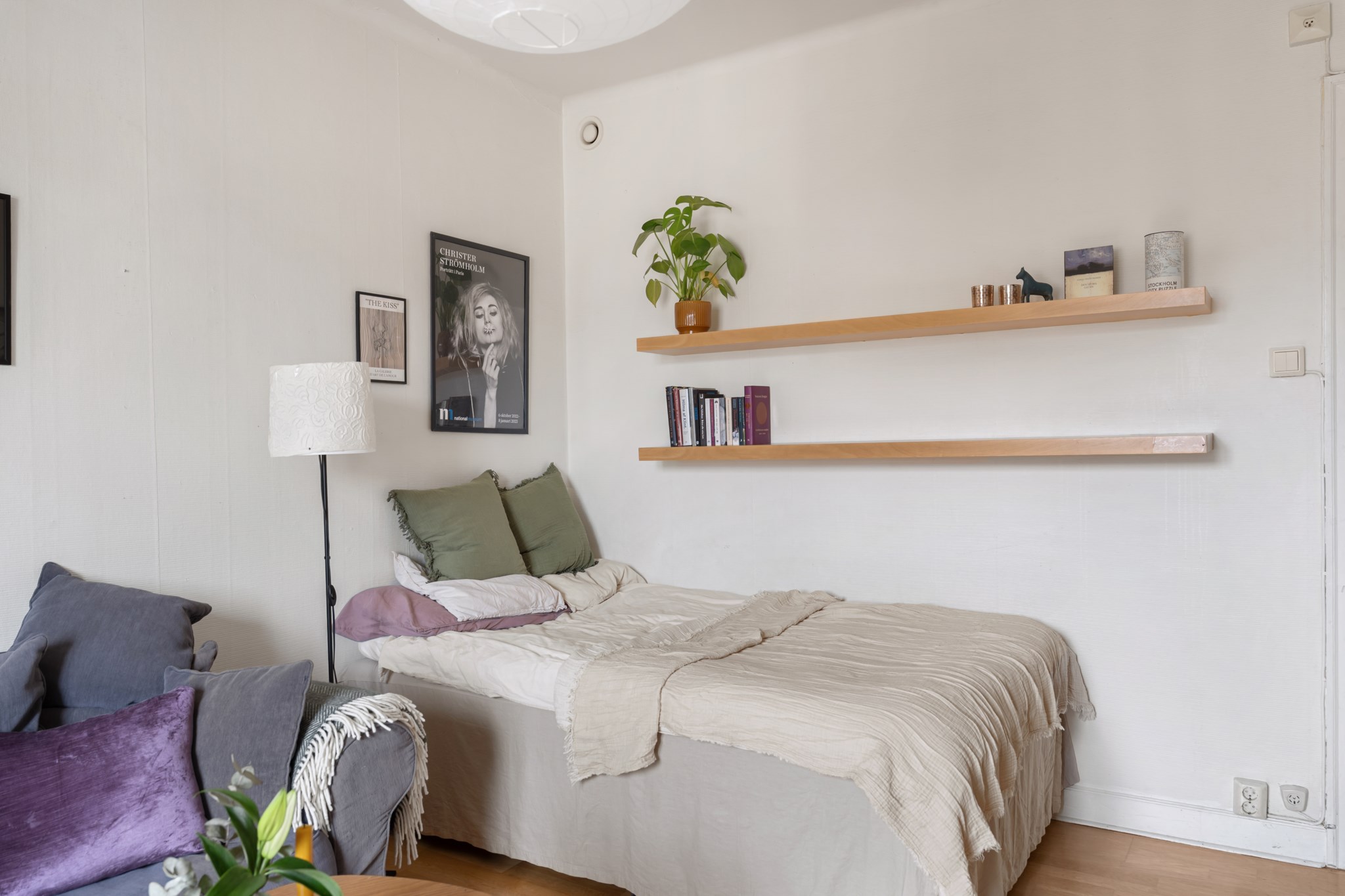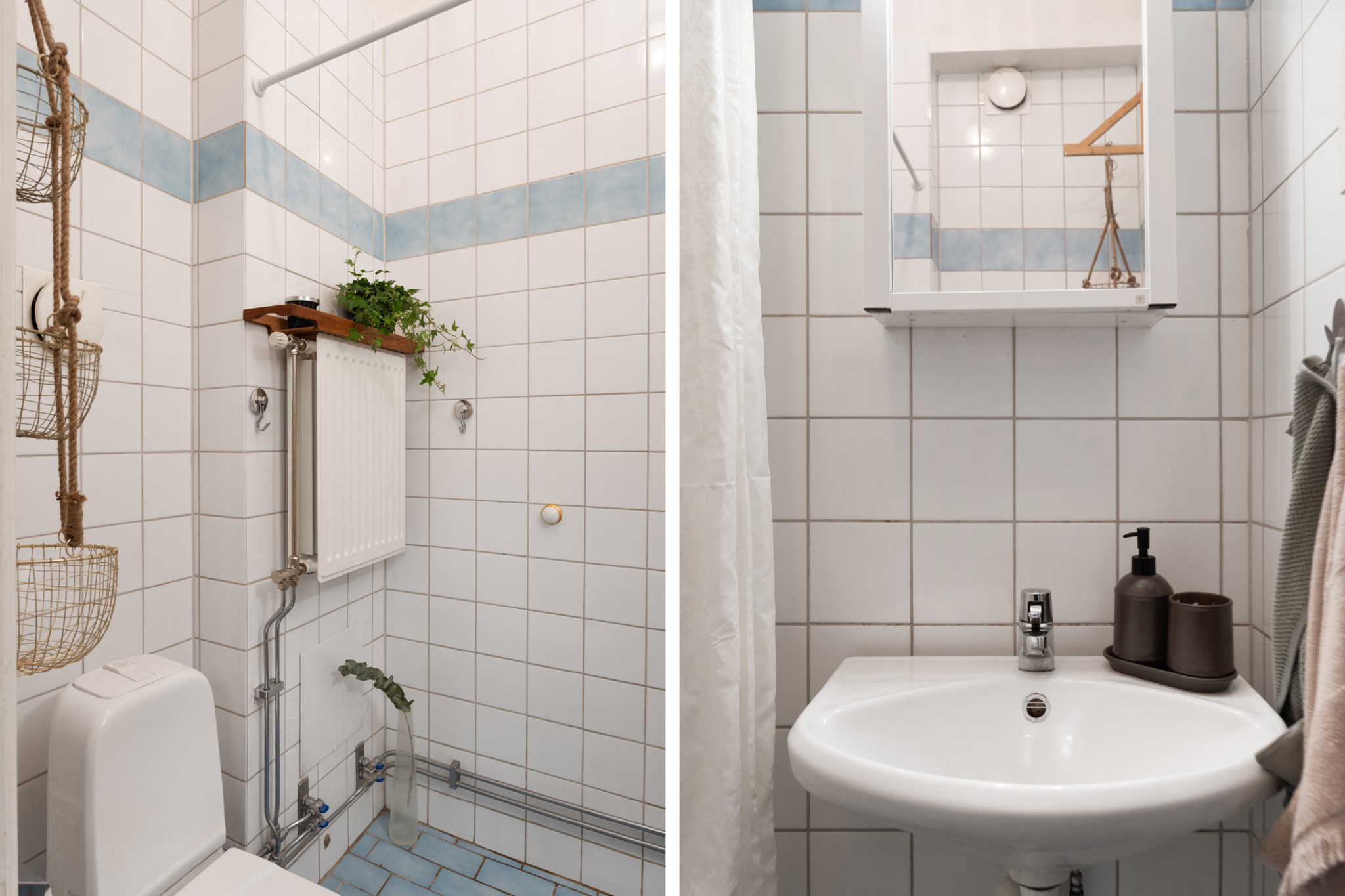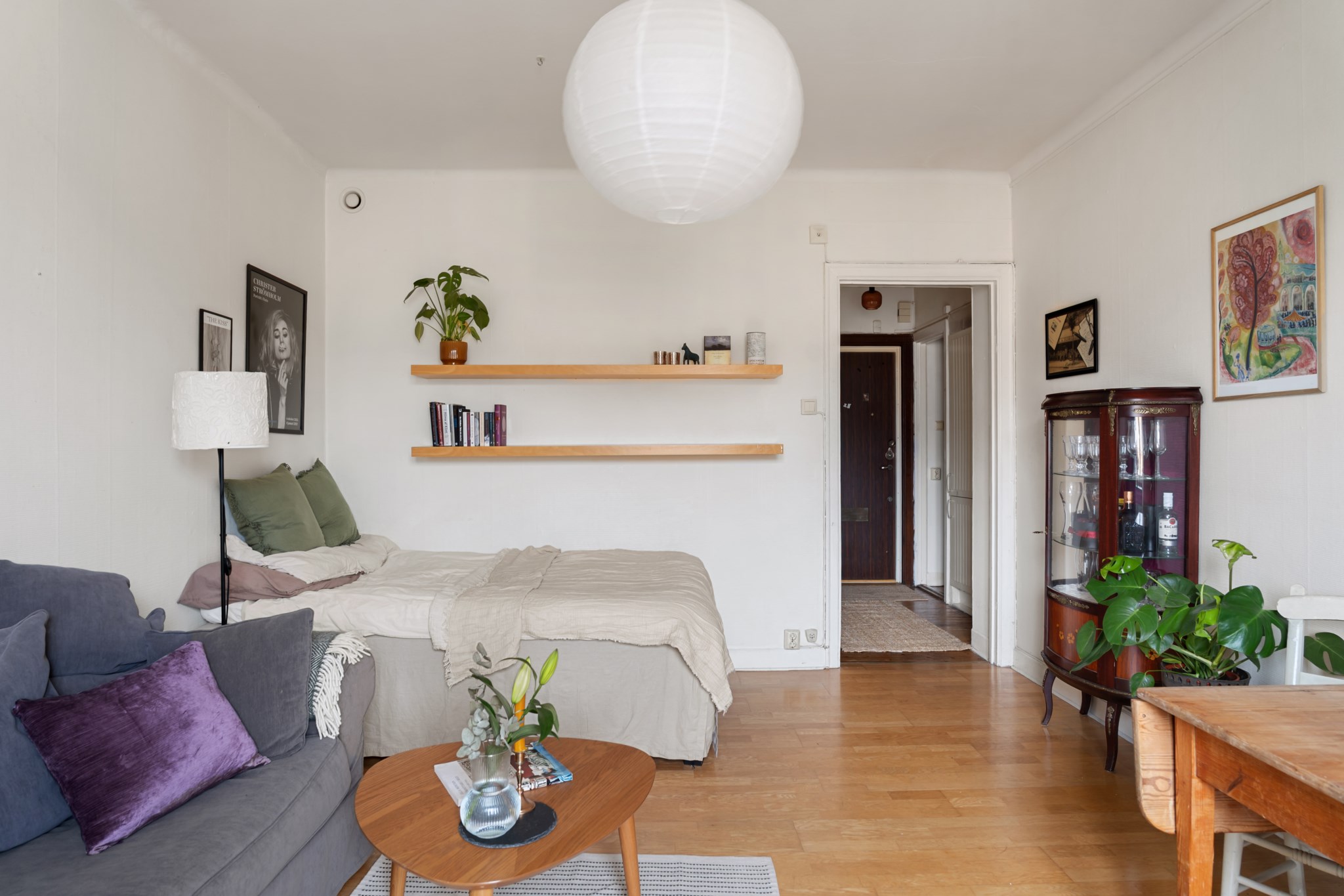 HALLLjus och välkomnande hall med ljusa målade väggar och trägolv. Förvaring i form av inbyggd garderob och avhägningsmöjligheter via hatthylla. KÖKFräscht kök med vita köksluckor, bänkskiva i trä och mörkt stänktskydd. Köks maskinella utrustning består av spis, ugn, fläkt samt kylskåp. Det är ljusa målade väggar och trägolv. ALLRUMRymligt och luftigt allrum med ljusa målade väggar och parkettgolv. Rummet rymmer säng, soffmöbel, mindre matgrupp samt övrig inredningsmöbel efter behov. Förvaring i form av garderob. Härligt ljusinsläpp via fönster. BADRUMLjus badrum med vita kaklade väggar med ljusblåa detaljer och ljusblått klinkergolv. Badrummet består av WC-stol, handfat med spegelskåp samt dusch. FÖRRÅDFööråd