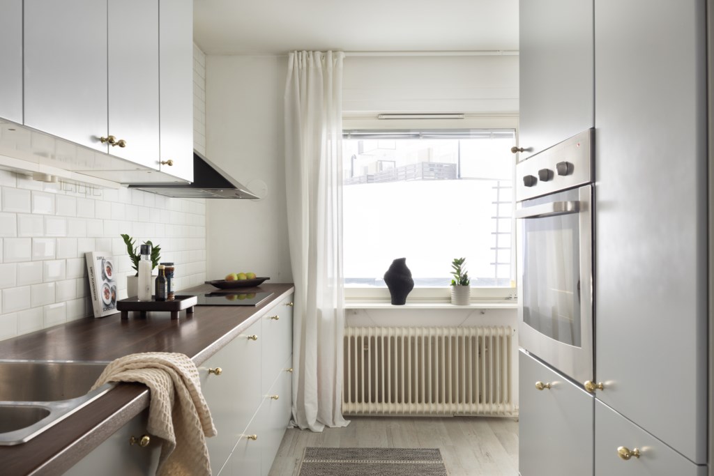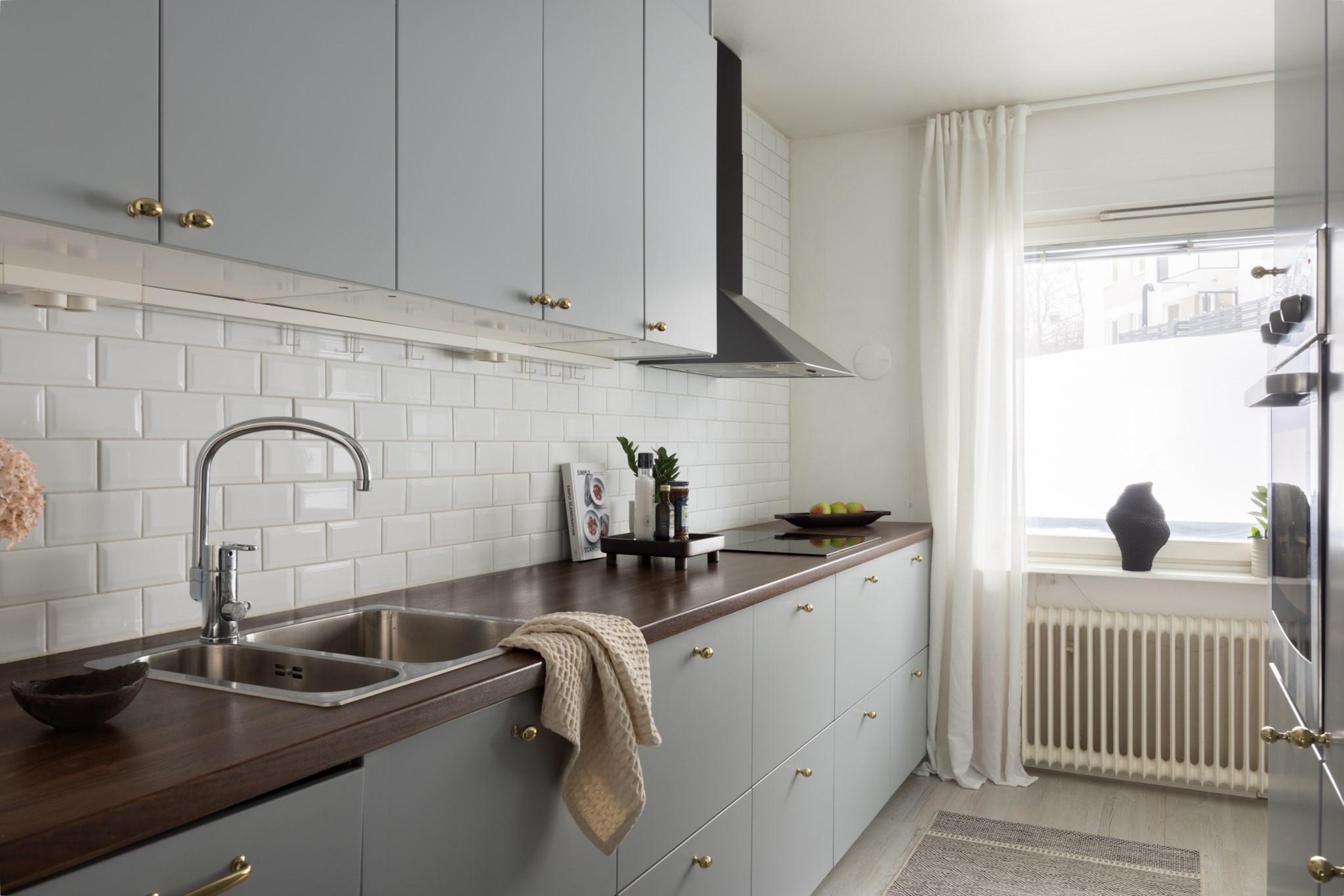 Modernt kök med smakfulla materialval bestående av köksluckor i en blå nyans och bänkskiva i trä med stänkskydd ovan i vitt. Den maskinella utrustningen består av diskho, spis, ugn, köksfläkt, diskmaskin samt kyl och frys. Ett härligt ljusinsläpp tar sig in via ett stort fönster. Tidlösa ytskikt bestående av ljusa väggar och ljust golv.