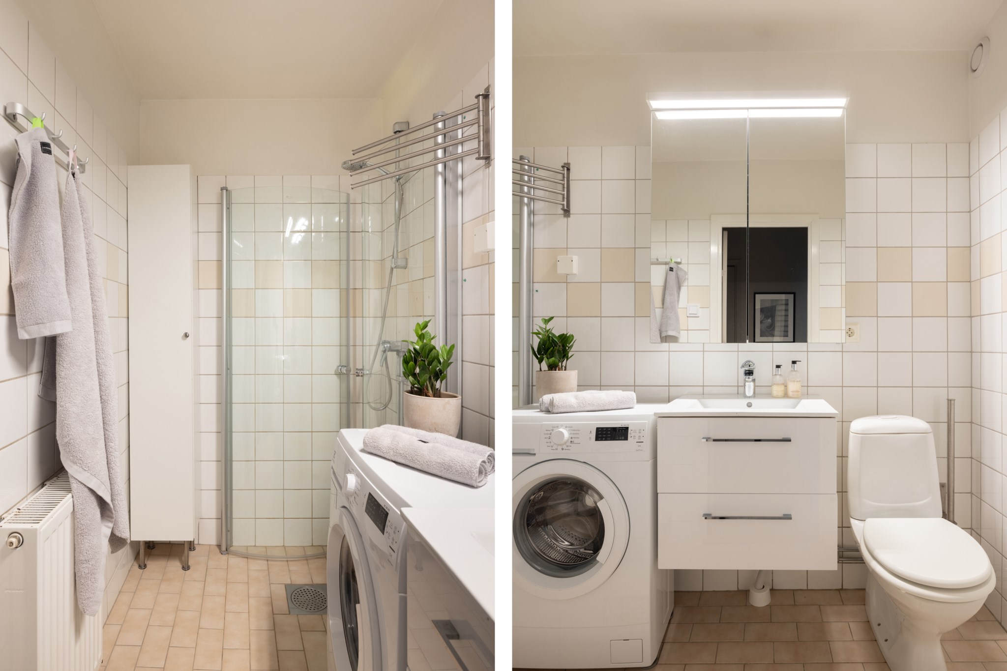 Rymligt badrum med ljust kakel och klinker. Badrummet är utrustat med WC, handdukstork, handfat ovan kommod, spegelskåp med belysning, samt dusch med glasvägg. Extra bekvämligheter genom en tvättmaskin.