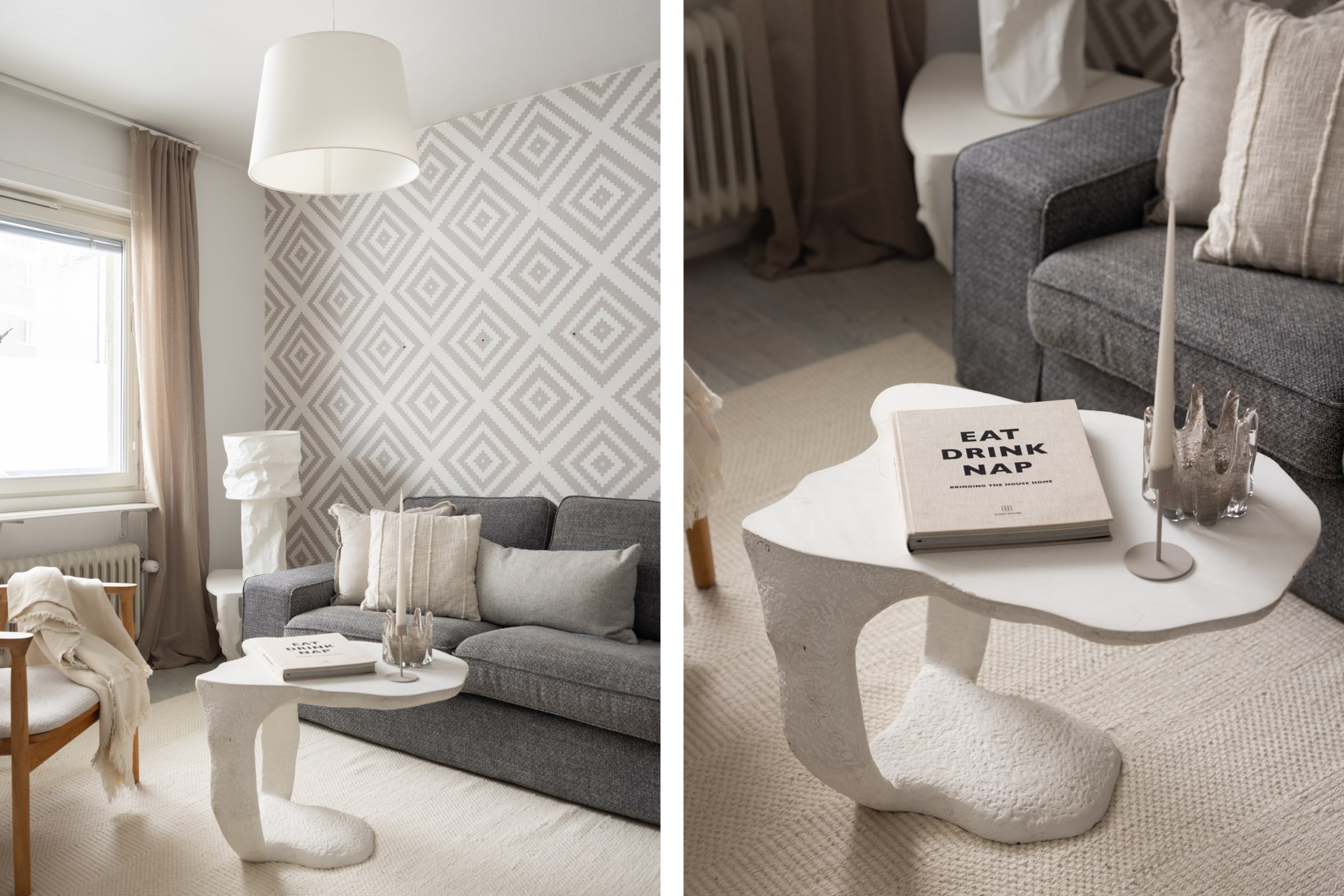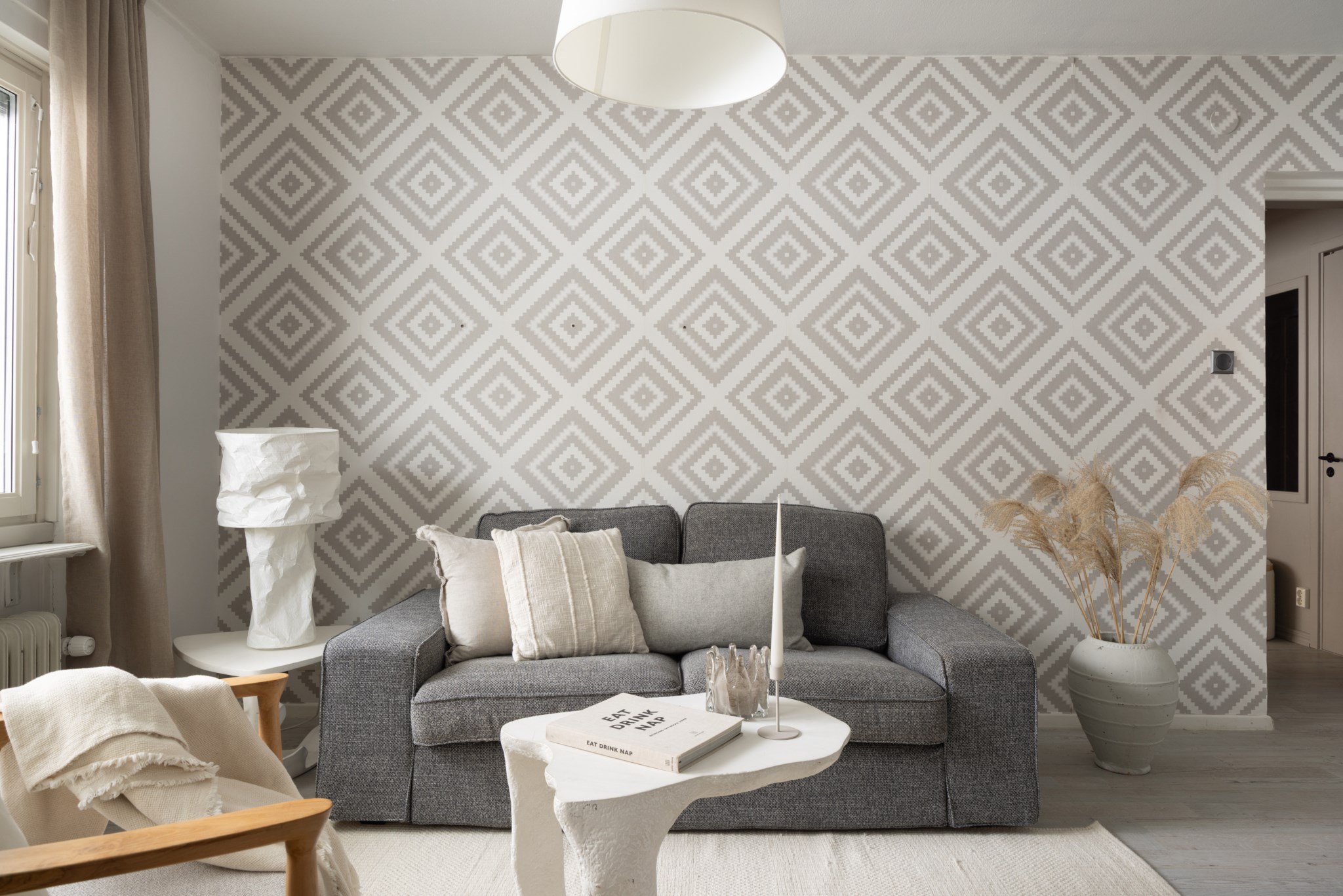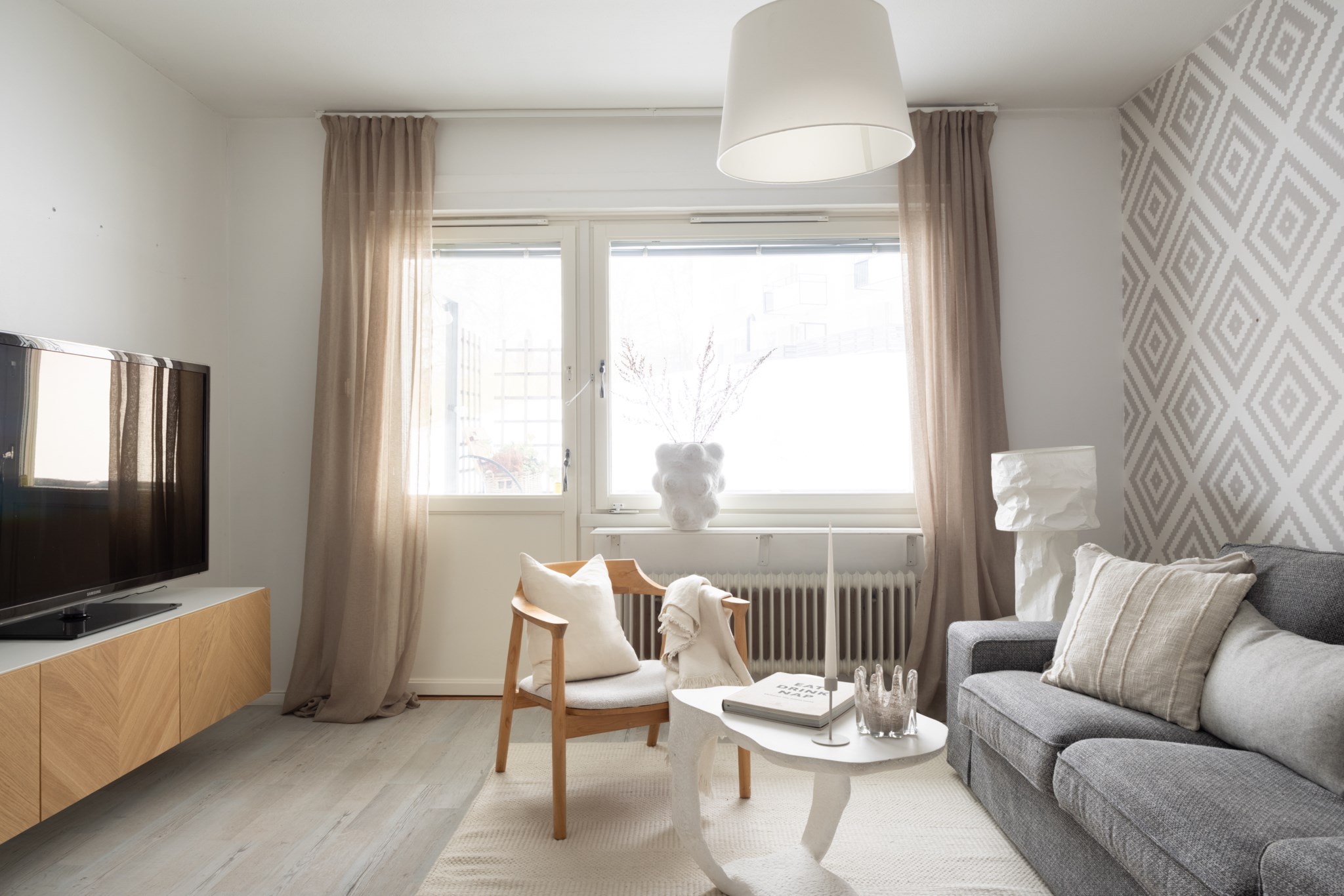 Luftigt vardagsrum med tidlösa ytskikt bestående av ljusa väggar i form av en tapet och ljust golv. I vardagsrummet inryms säng, matgrupp, soffa, soffbord, TV-möbel samt annat möblemang efter smak och behov. Här möts du av ett härligt ljusinsläpp via stora fönster. Från vardagsrummet nås även lägenhetens härliga uteplats.