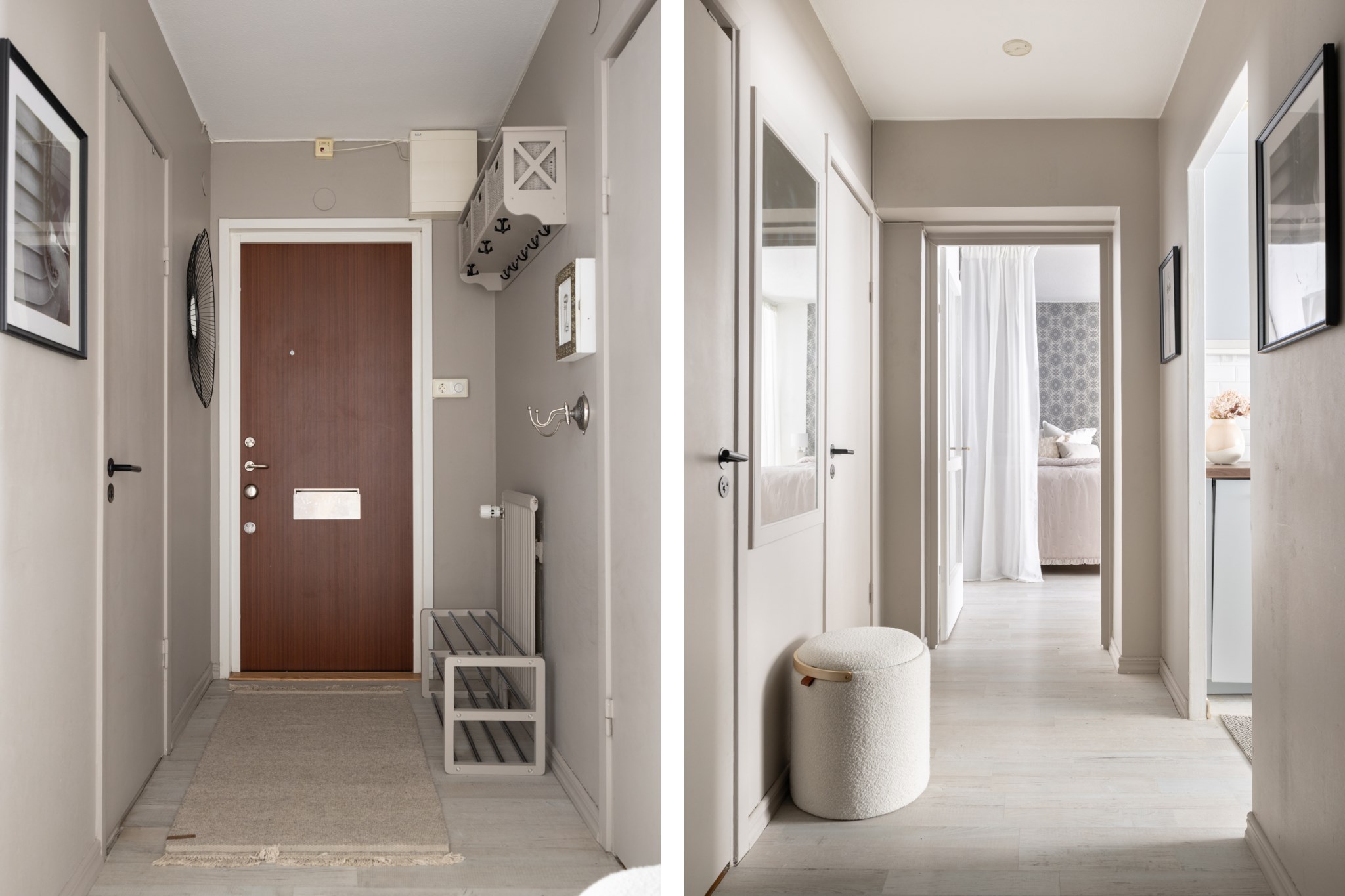 Välkomnande hall med plats för avhängning, skoställ samt mindre avlastningsmöblemang efter smak och behov. Gott om plats för förvaring via en intilliggande klädkammare. Tidlösa ytskikt bestående av ljusa väggar i en beige nyans och ljust golv.