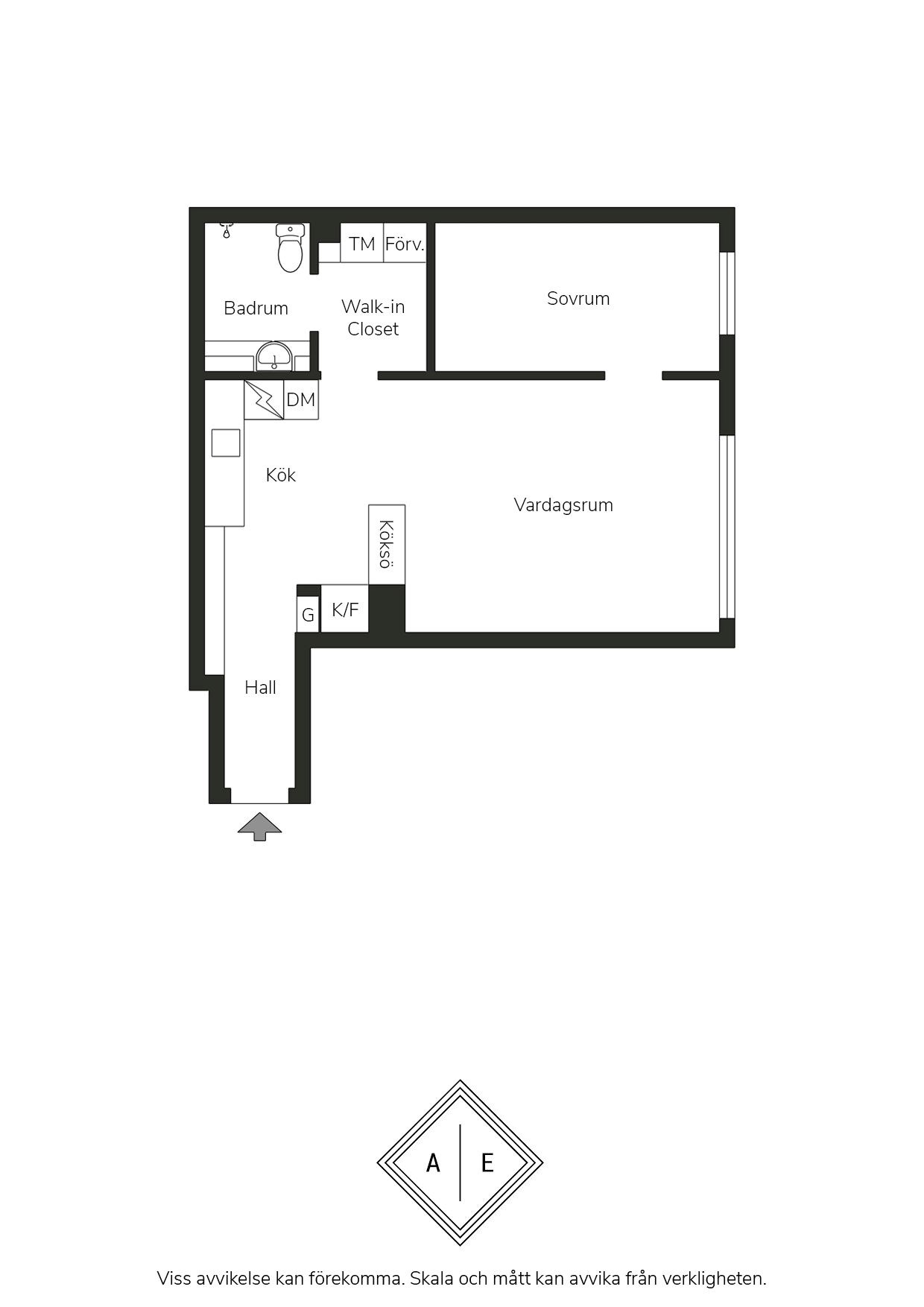 Sovrummet är smart disponerat med platsbyggd säng med förvaring och intill ligger en praktisk walk-in closet som maximerar utrymmet. Hall och badrum är utrustade med inbyggda speglar och lägenheten har genomgående LED-belysning via Plejd, vilket skapar en modern och genomtänkt atmosfär.