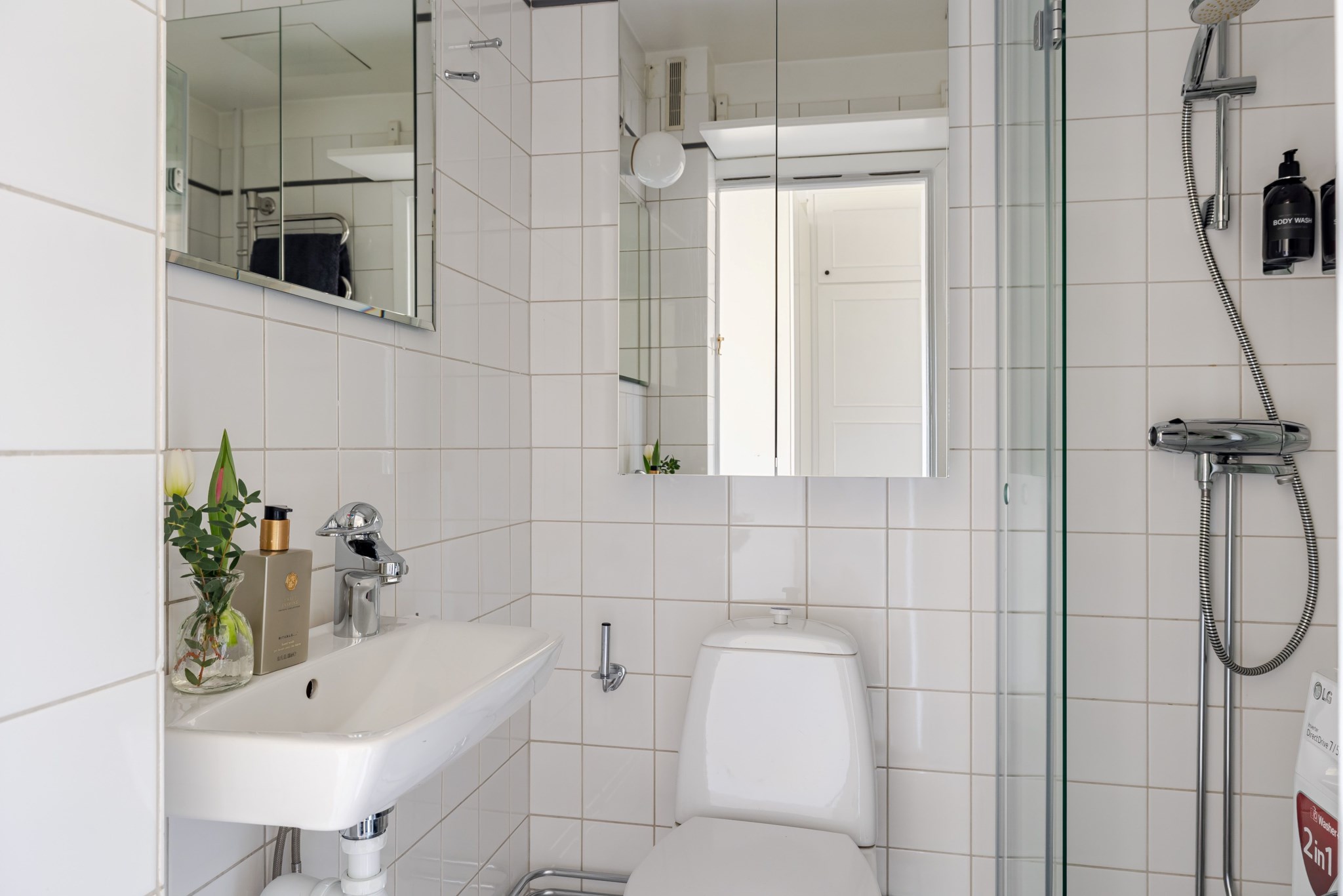 Helkaklat badrum inrett med WC, handfat, spegel, spegelskåp, tvättmaskin och dusch.