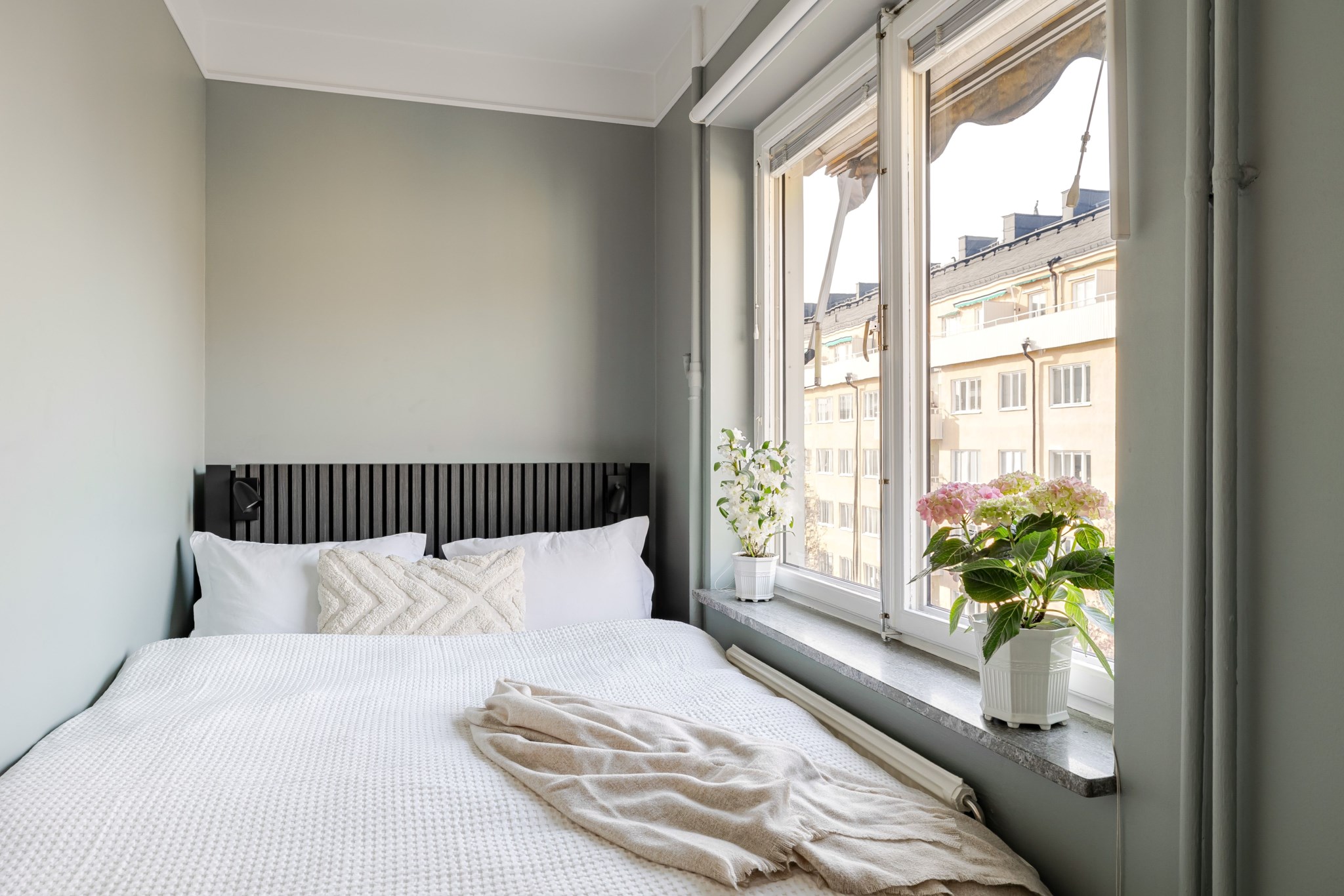 Mysigt sovrum med plats för säng och ett stort fönster som fyller rummet med naturligt ljus. Den långa fönsterbrädan utgör en naturlig plats för personliga och dekorativa föremål. Ljusmålade ytskikt.