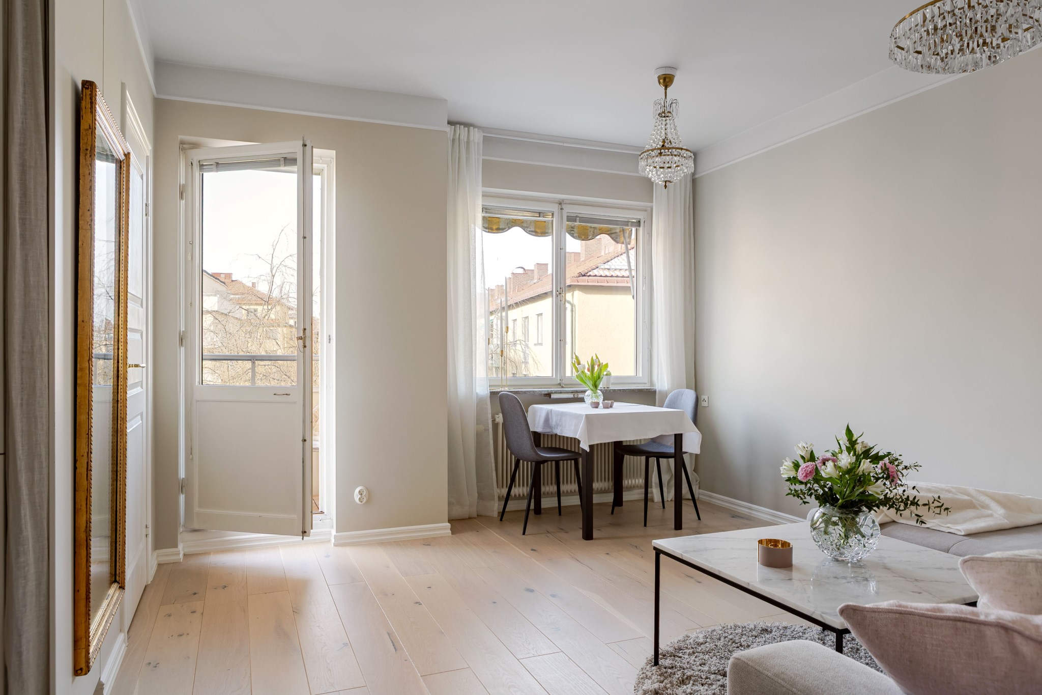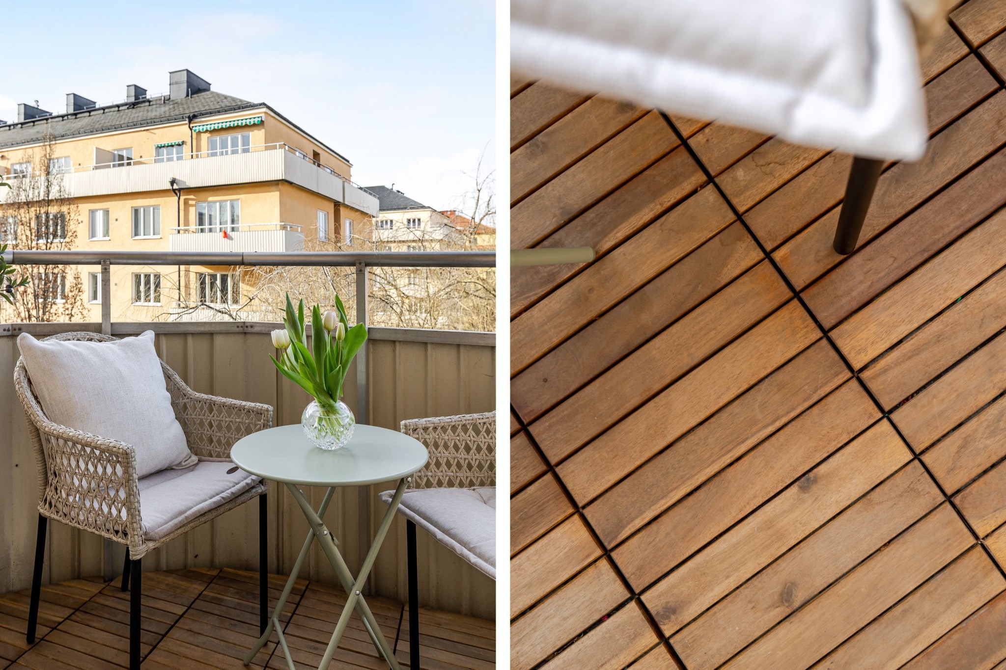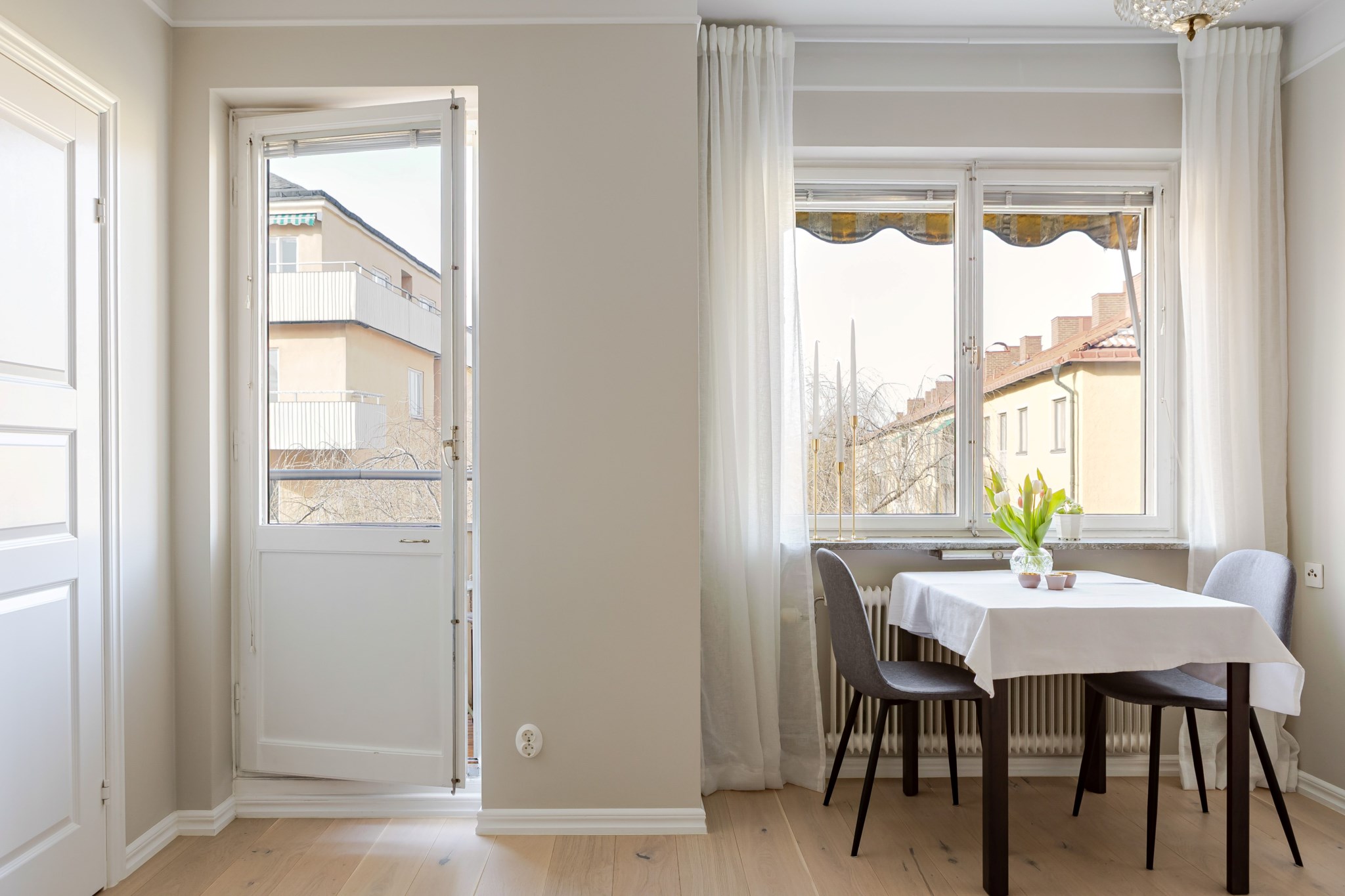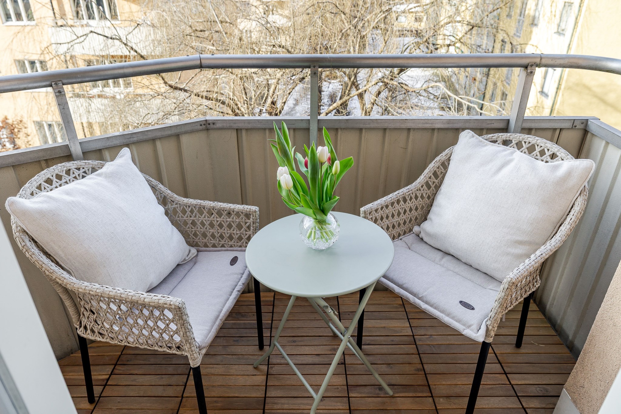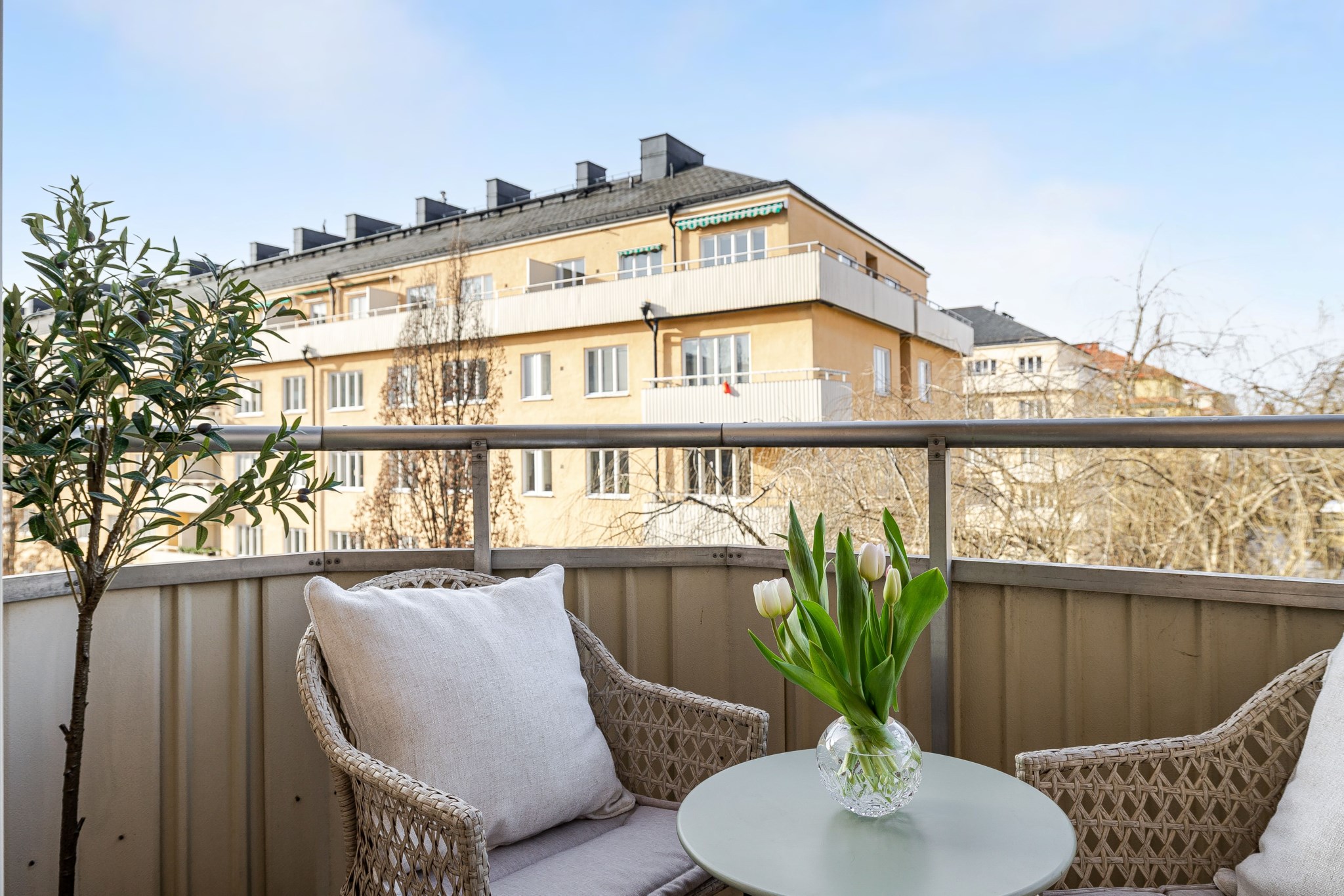 Till bostaden hör en mysig balkong med plats för balkongmöbler och en lugn utsikt över den grönskande innergården.