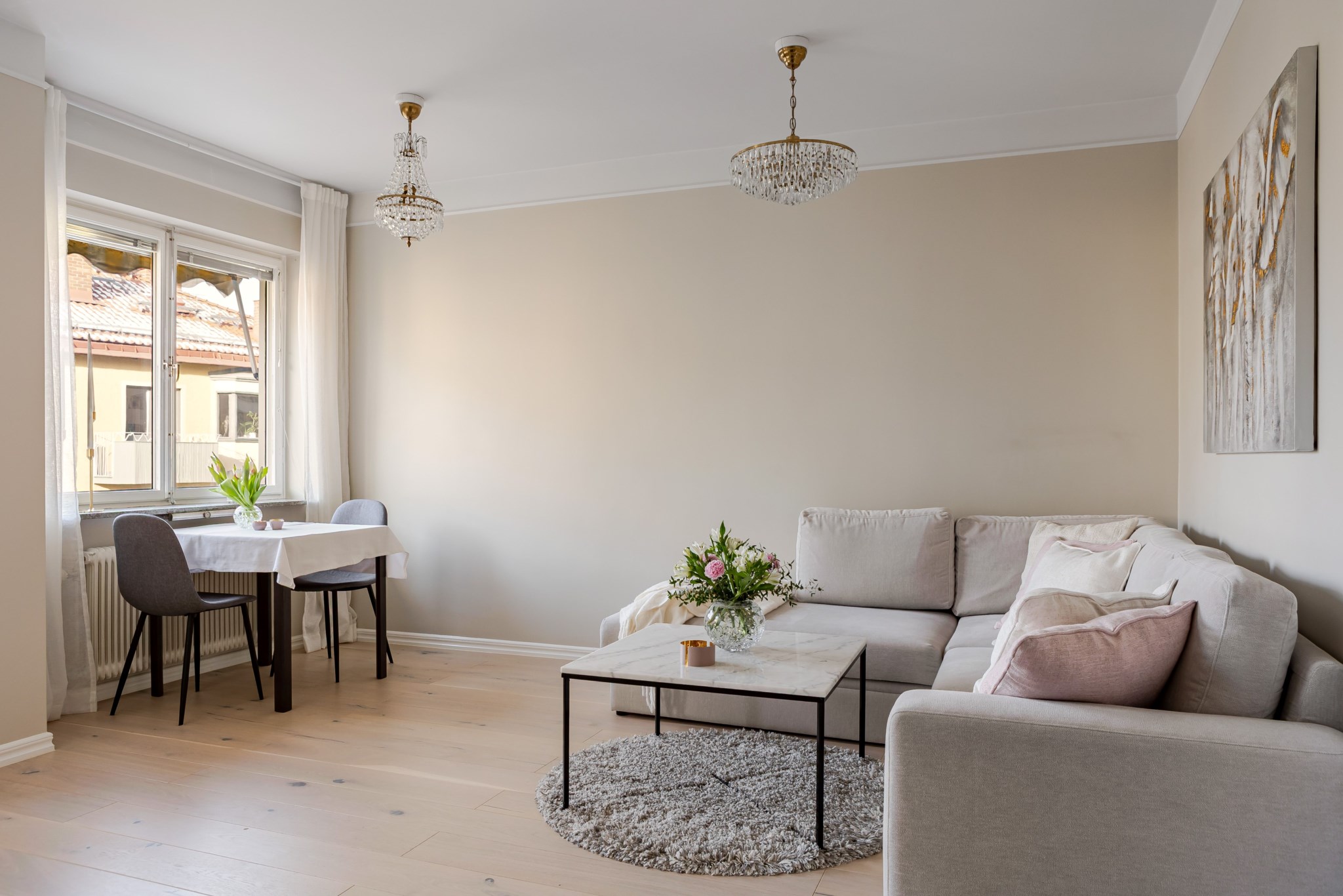 Socialt och lättmöblerat vardagsrum med gott om plats för både soffgrupp och matplats med flexibilitet att möblera efter egna önskemål. Ett stort fönsterparti ger rummet ett generöst ljusinsläpp och här finns även direkt access till bostadens trivsamma balkong. Ljusmålade ytskikt och ljust golv.