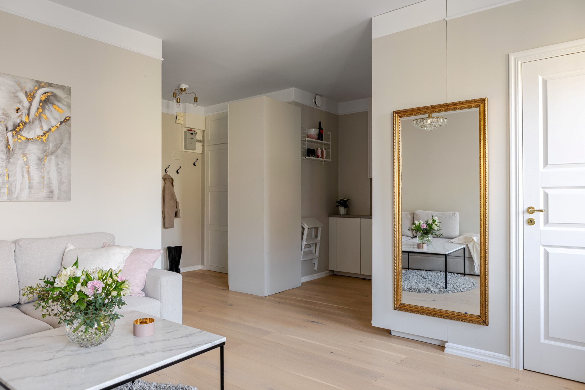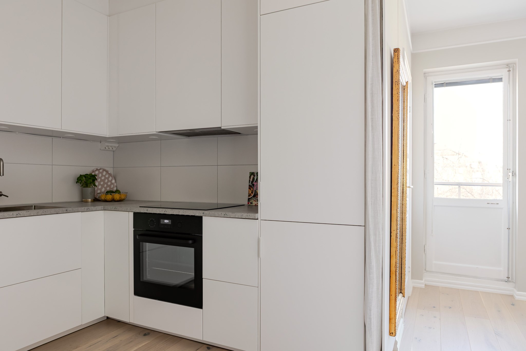 Ljus hall med generös platsbyggd förvaring från golv till tak som rymmer både ytterkläder och övriga tillhörigheter. Hallen öppnar upp mot resten av lägenheten och leder vidare till den öppna planlösningen mellan kök och vardagsrum vilket skapar ett luftigt och välkomnande flöde. Ljusmålade ytskikt och ljust golv.