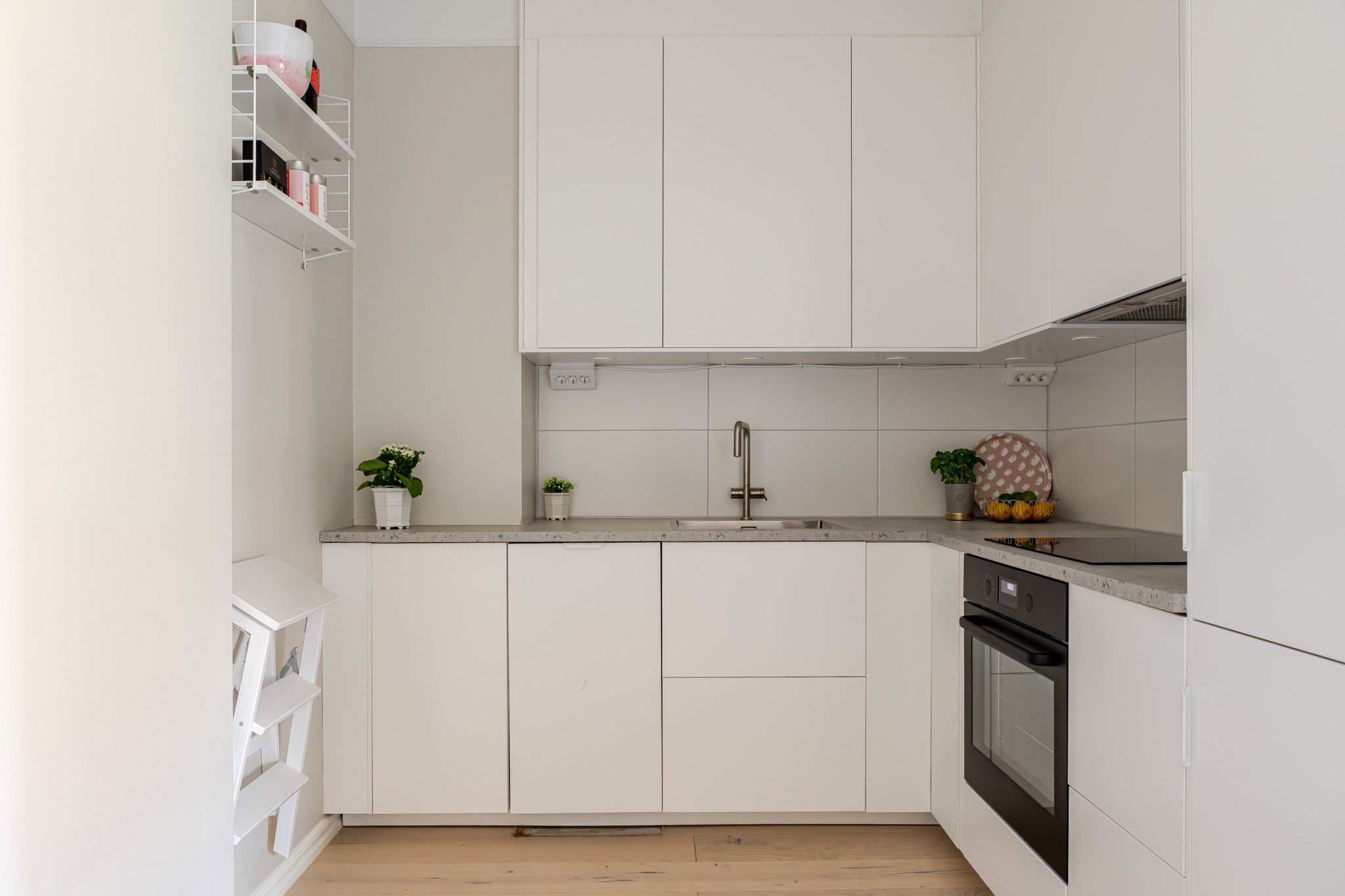 Stilrent kök med ljusa, släta skåpsfronter, vit kaklad väggpanel och en matchande melerad bänkskiva som skapar ett enhetligt uttryck. Köket är utrustat med kyl/frys, spishäll, fläkt, ugn och diskmaskin. Ljusmålade ytskikt och ljust golv.