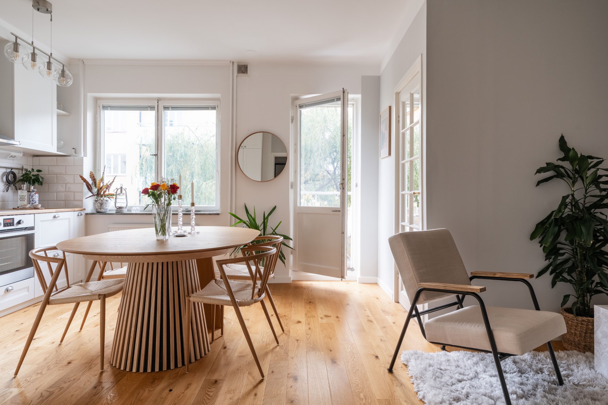 Trivsamt vardagsrum med öppen planlösning mot kök och matplats vilket skapar en social och luftig helhet. Rummet erbjuder plats för soffa och annan inredning efter behov och smak. Ljusmålade ytskikt och vackert, ljust golv.