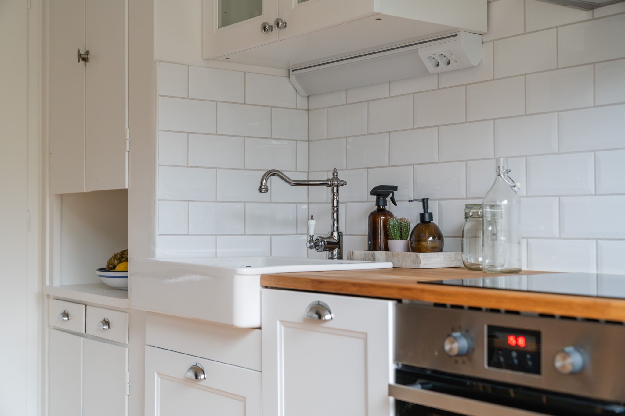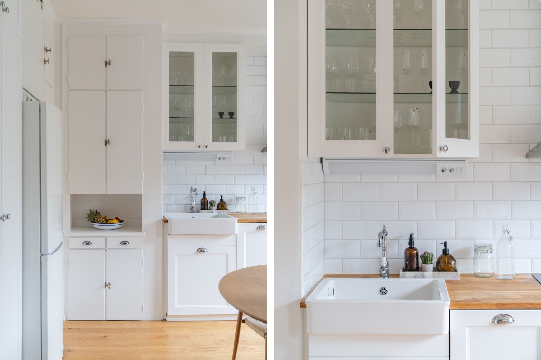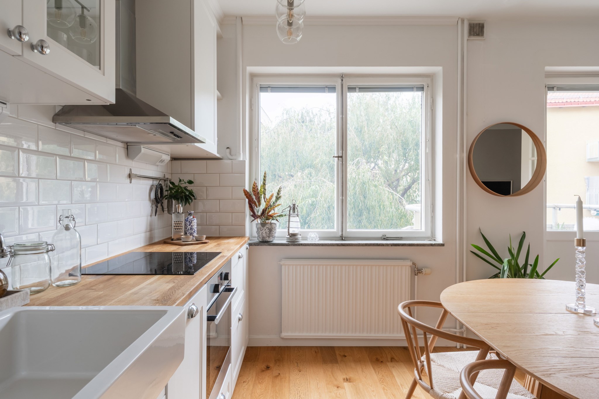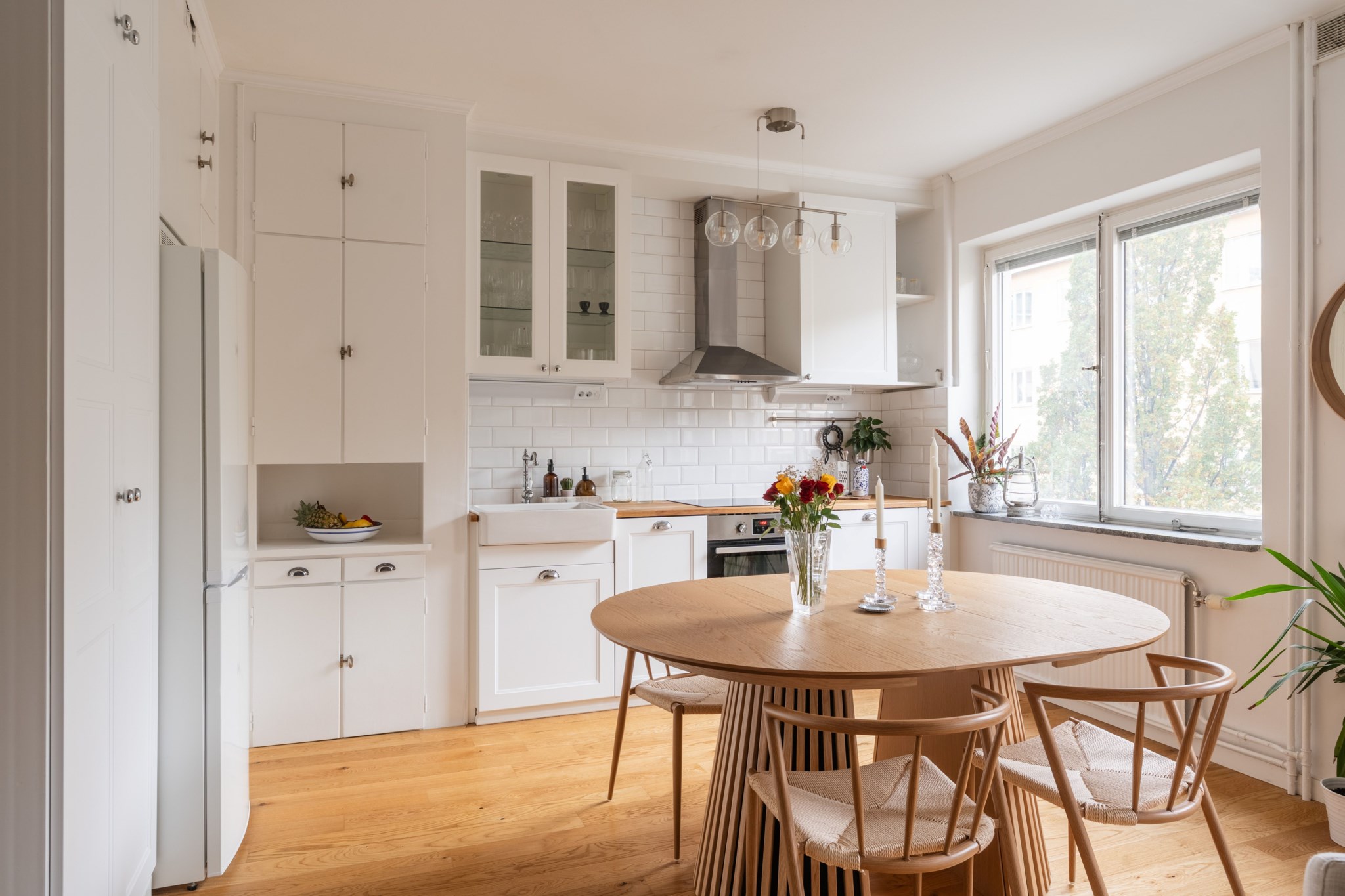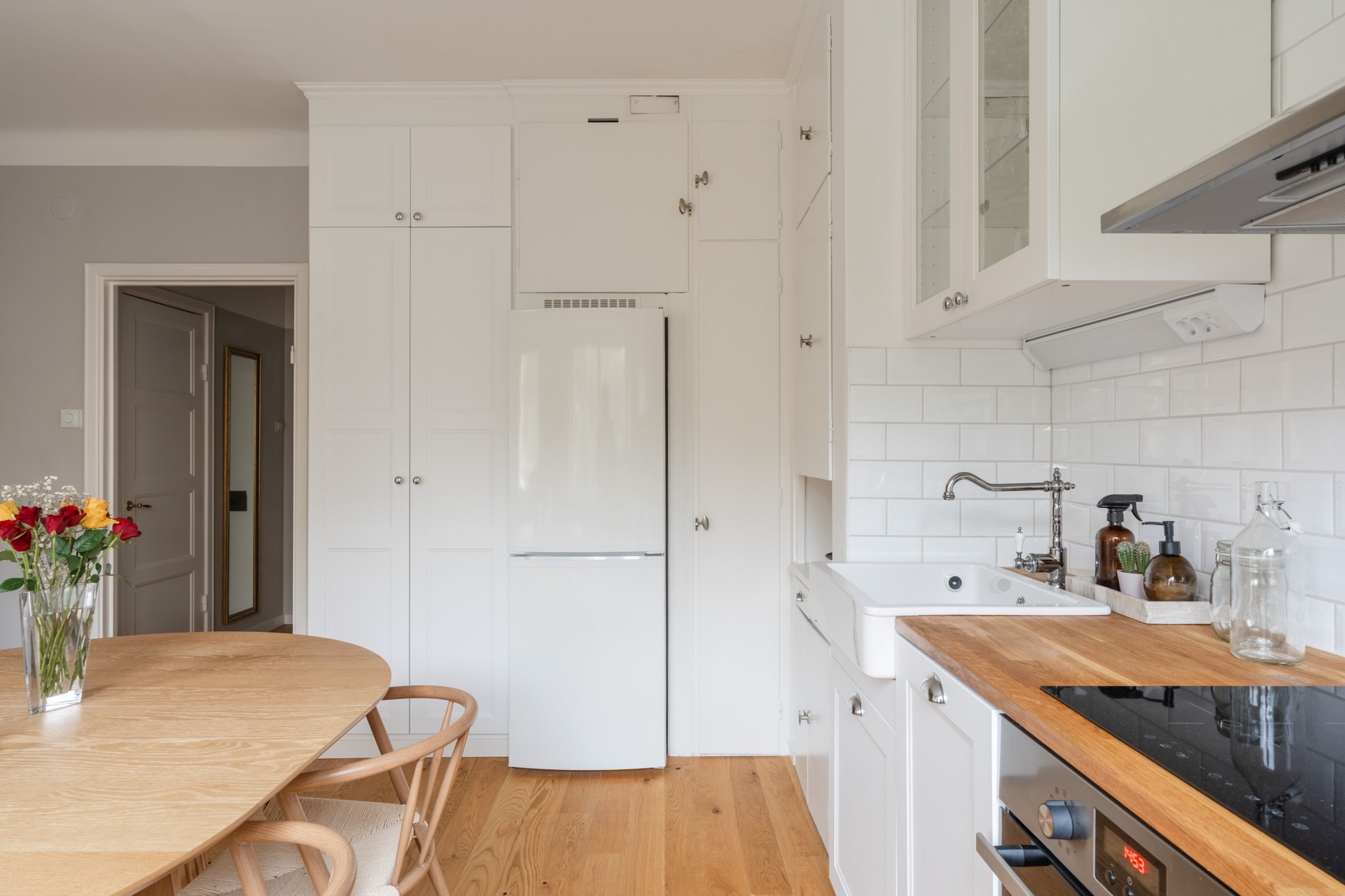 Ljust och klassiskt kök med bevarade originaldetaljer så som ett charmigt serveringsskåp med vackra beslag. Det stora fönsterpartiet släpper in generöst med ljus och skapar en trivsam matplats med plats för bord och stolar. Köket är inrett med ljusa skåpsluckor, kaklad väggpanel som sträcker sig hela vägen upp till taket samt en matchande bänkskiva i trä. Maskinell utrustning består av kyl/frys, spishäll, takhängd fläkt, ugn och diskmaskin. Ljusmålade ytskikt och vackert, ljust golv.